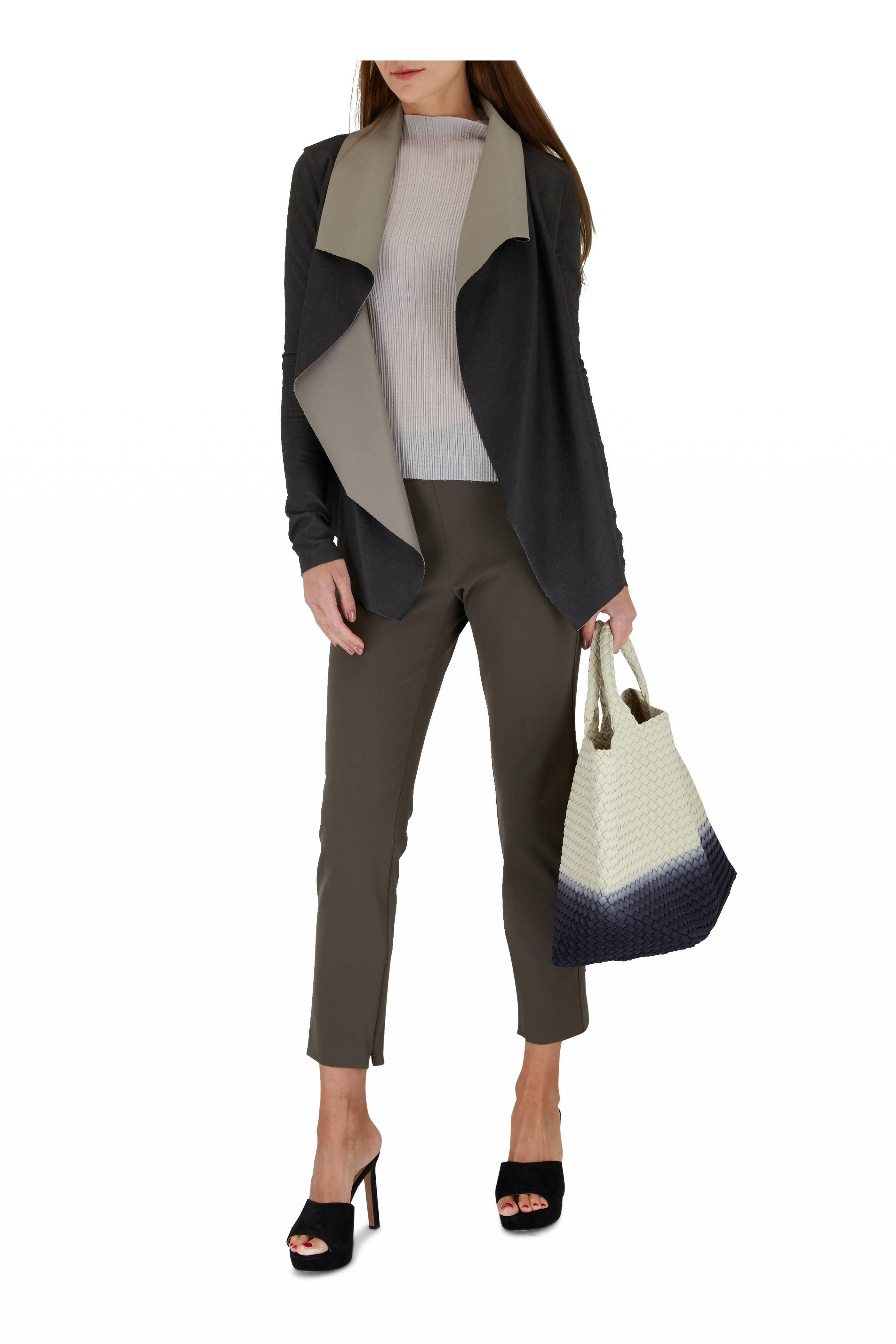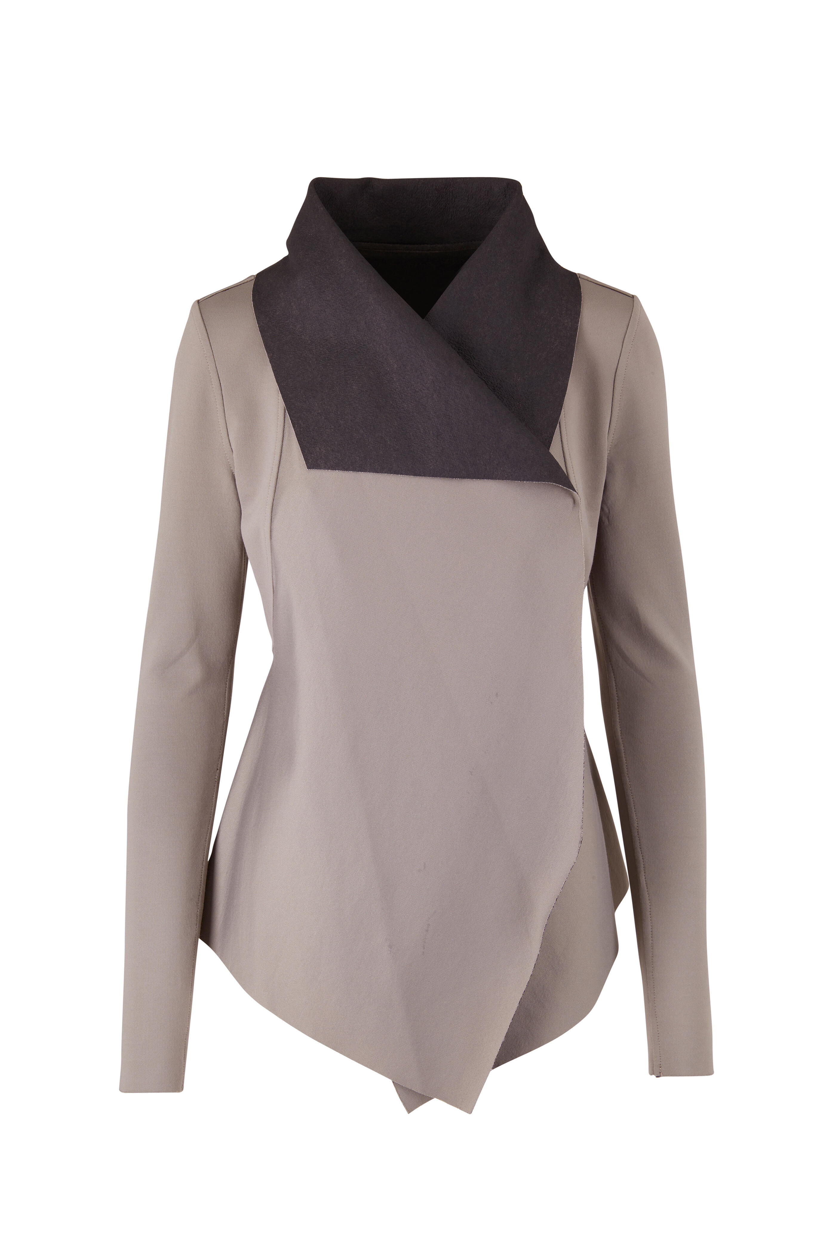 Drape neckline. Open front. Reversible. Made in NYC. 49% polyamide, 29% cotton, 3% elastane. Dry clean.