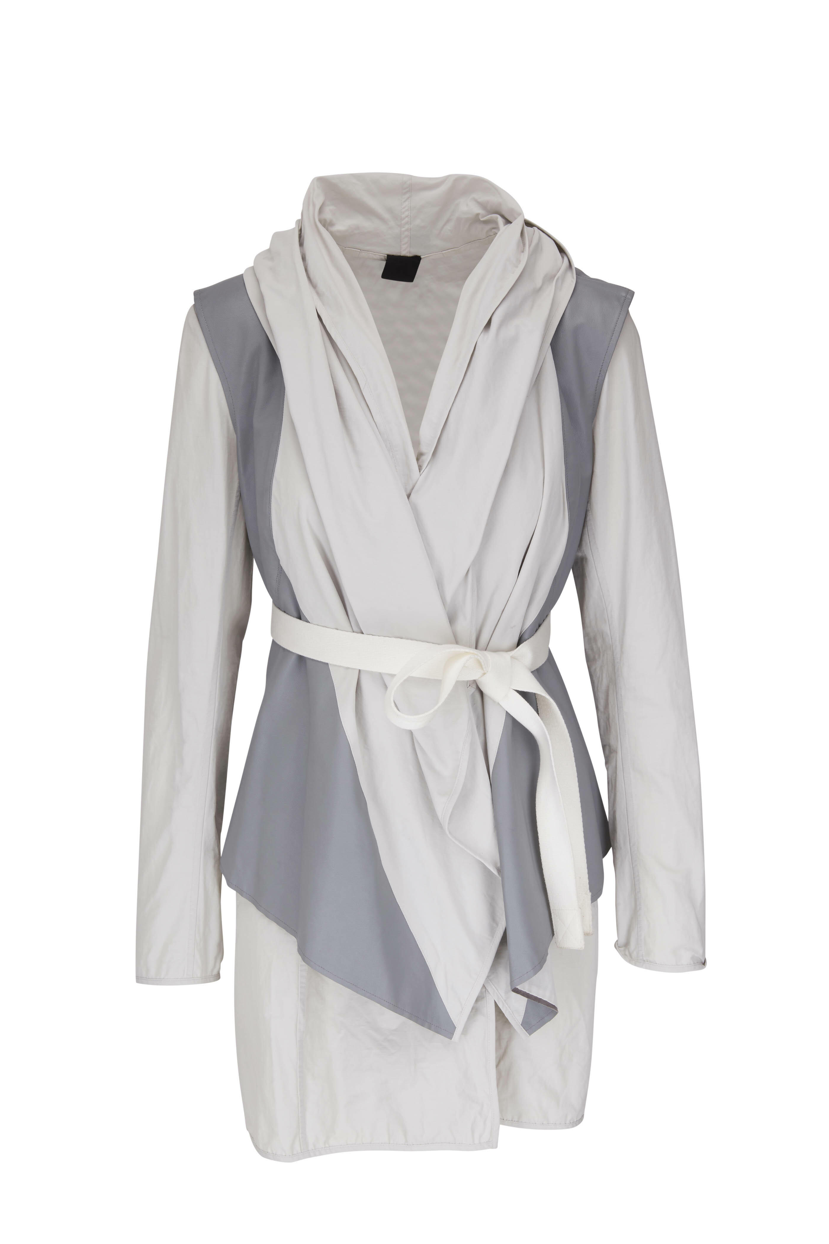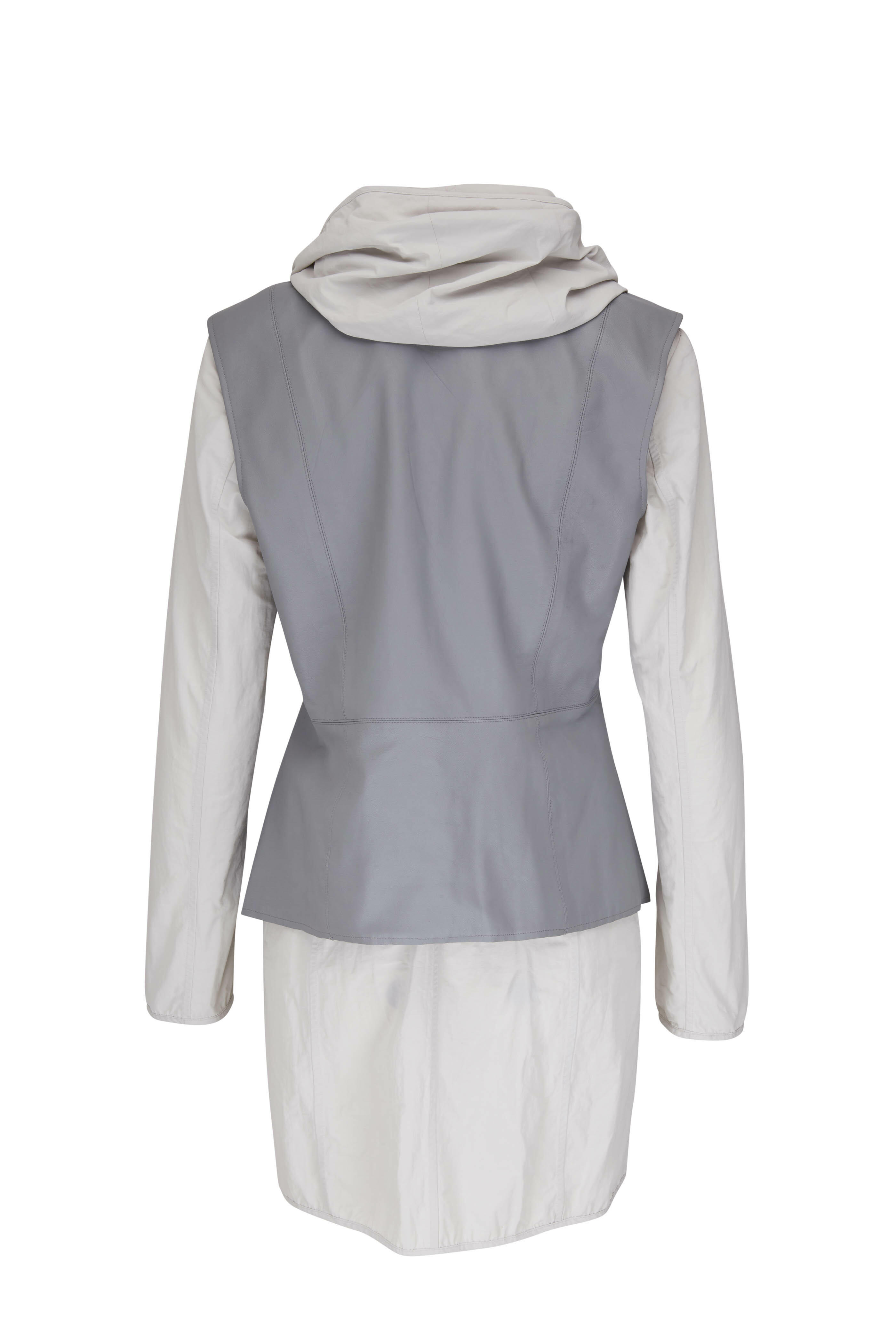 Attached hood. Concealed double button closure. Self-tie belt. Made in the USA. Jacket: 100% nylon; Vest: 100% nylon; Combo: 100% washable leather. Jacket: Dry clean. Vest: Machine wash.