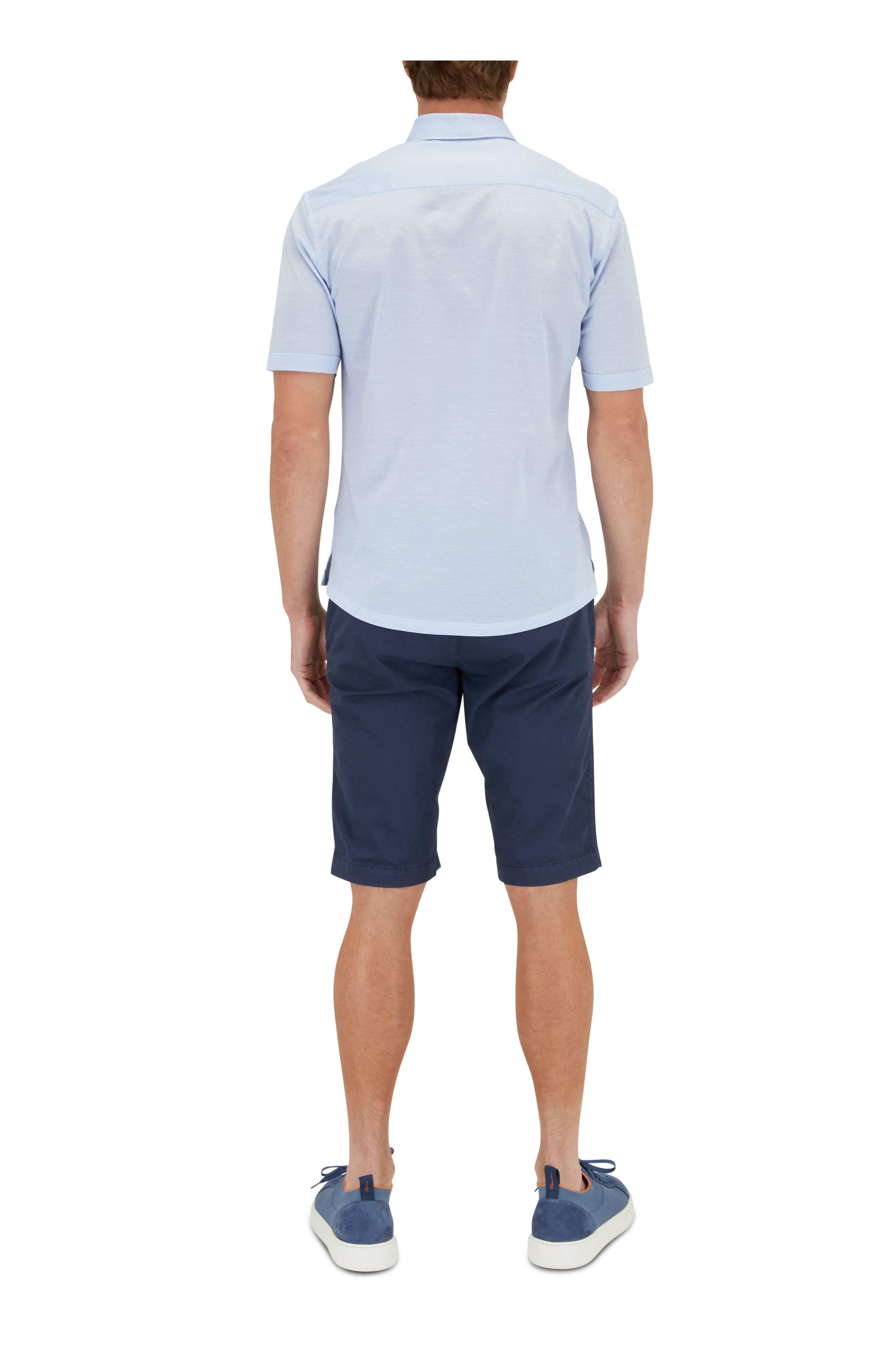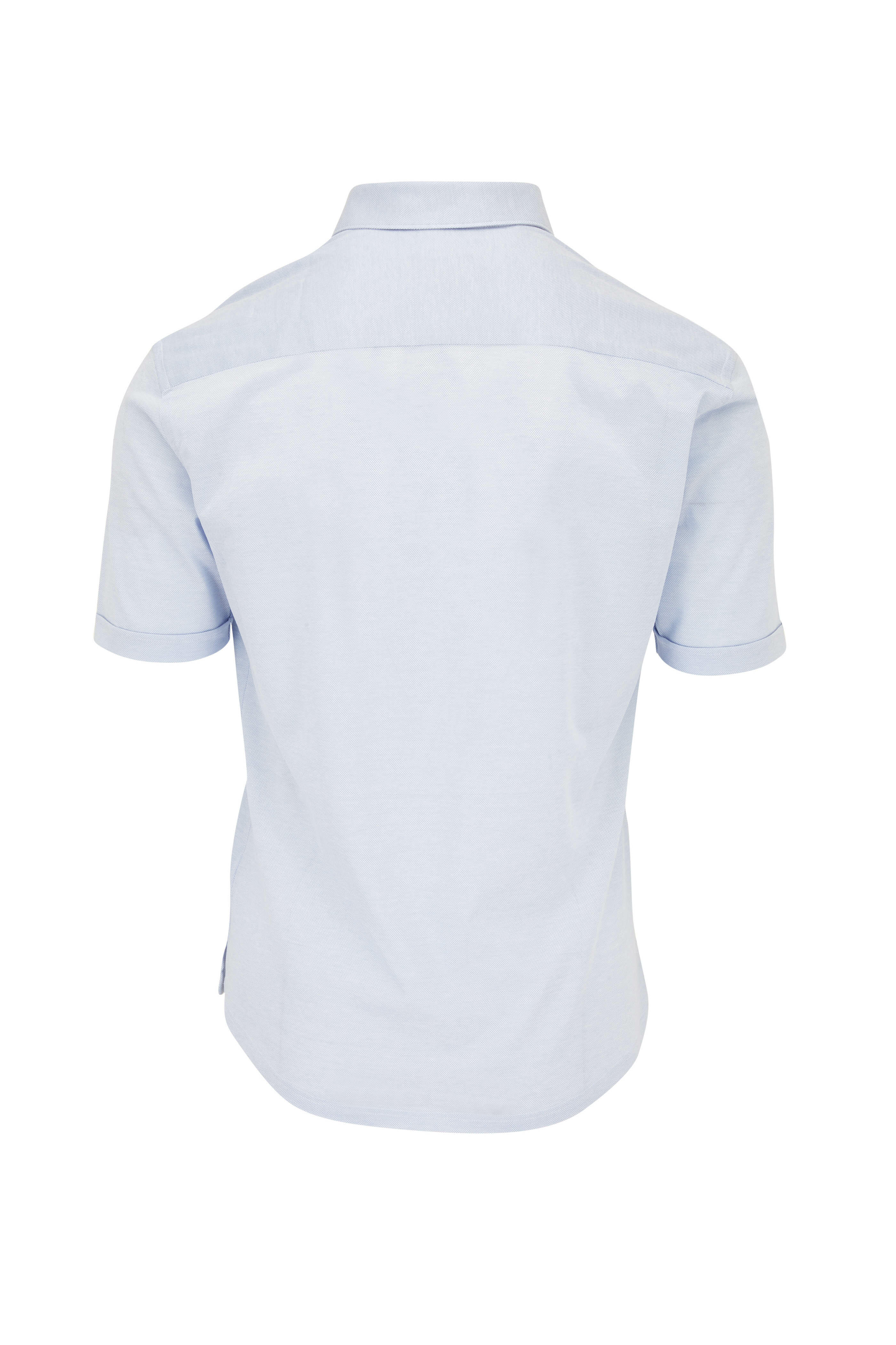 Button under collar. Three button placket. Turn up short sleeve. Pop-over style. Imported. Slim. 100% cotton. Machine wash.