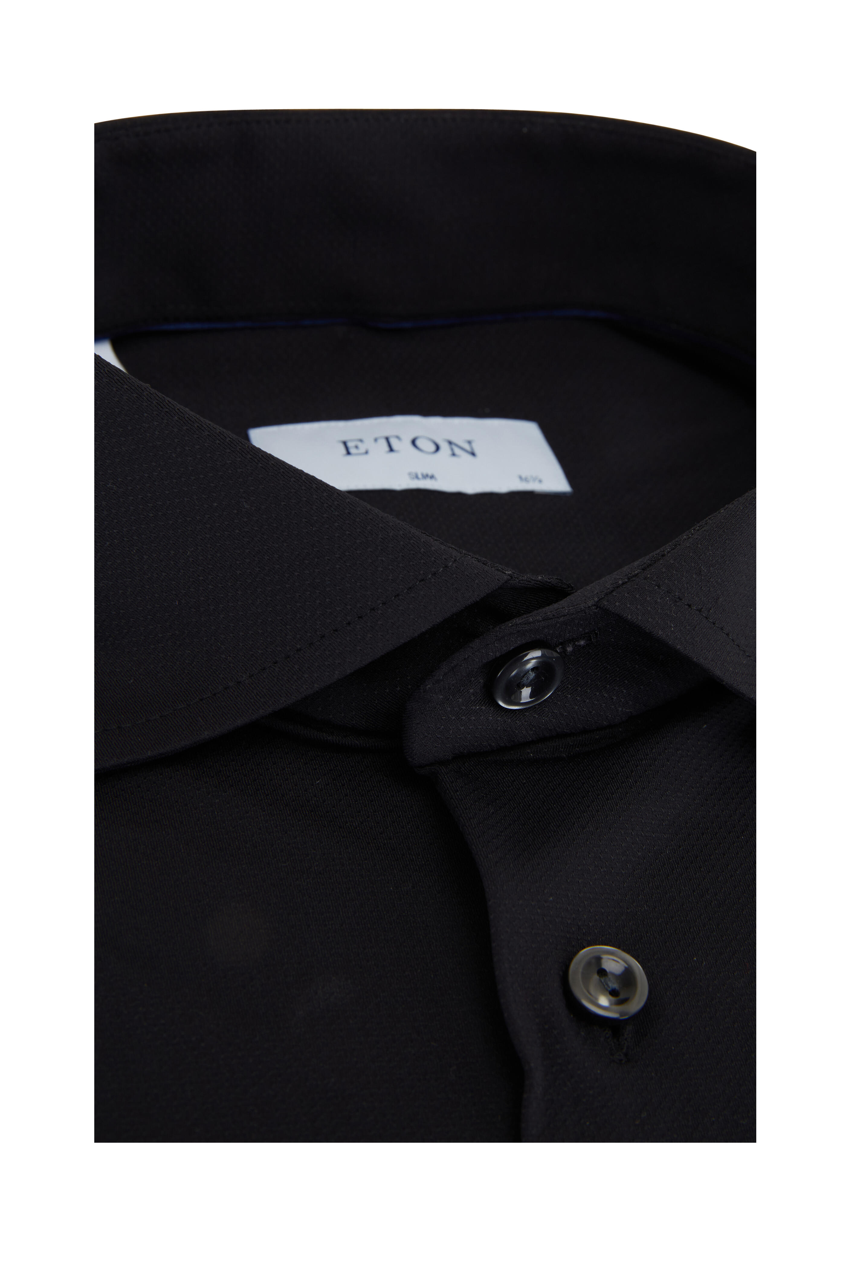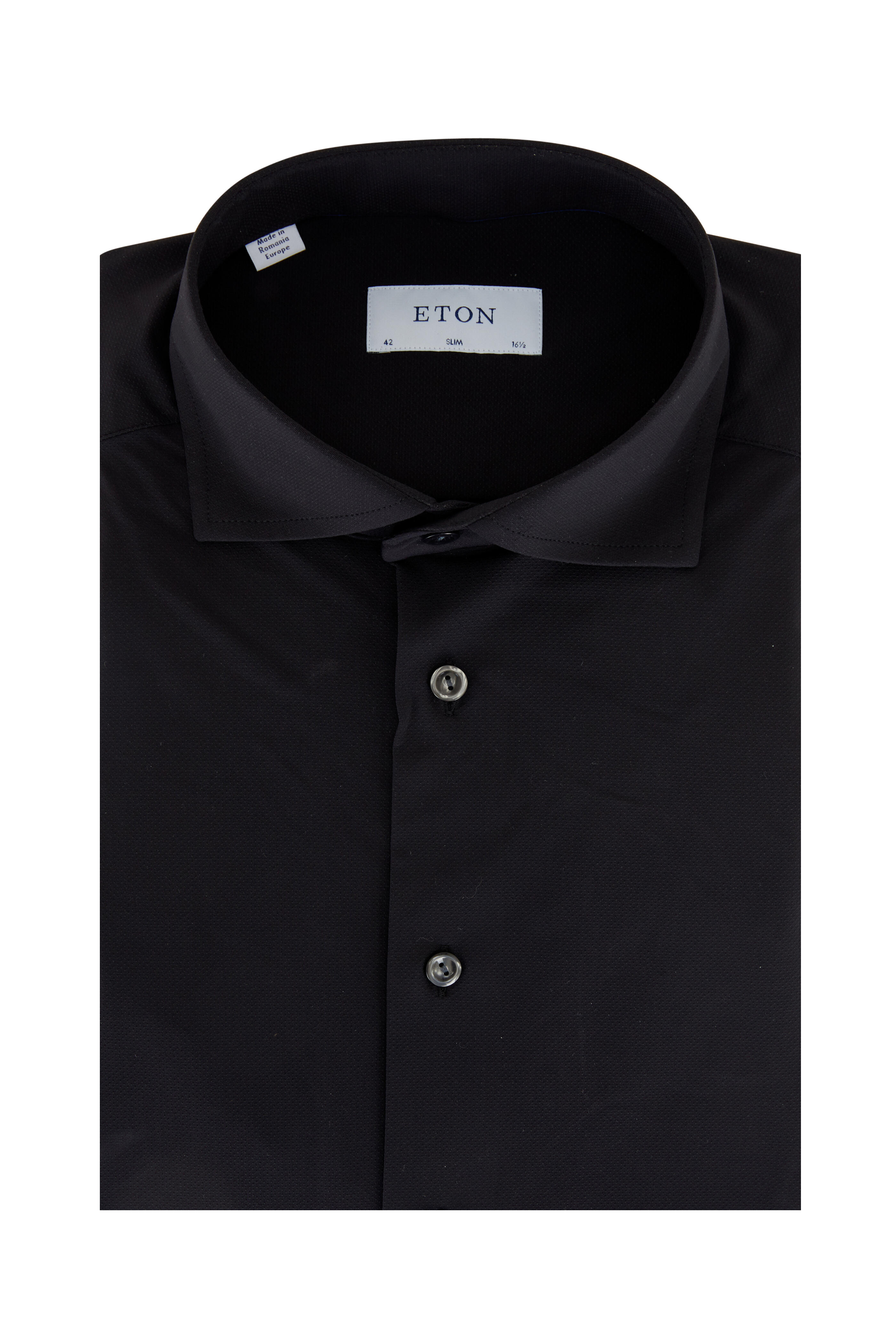 Spread collar. Single button rounded cuffs. Imported. Slim fit. 83% polyamide, 17% elastane. Machine wash.