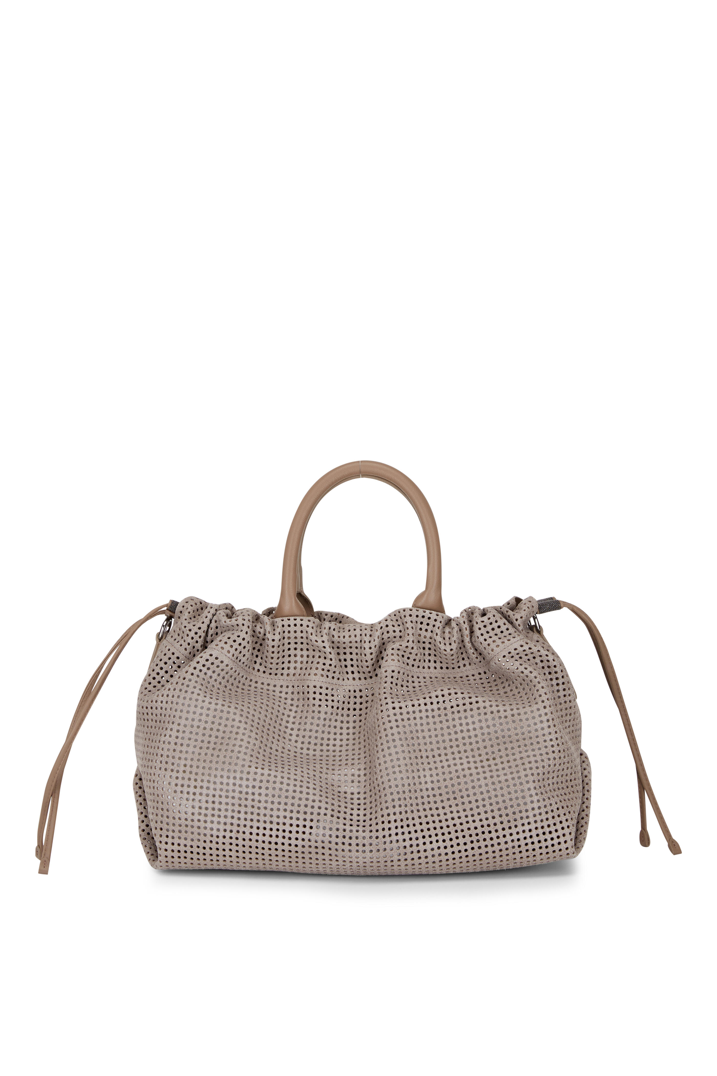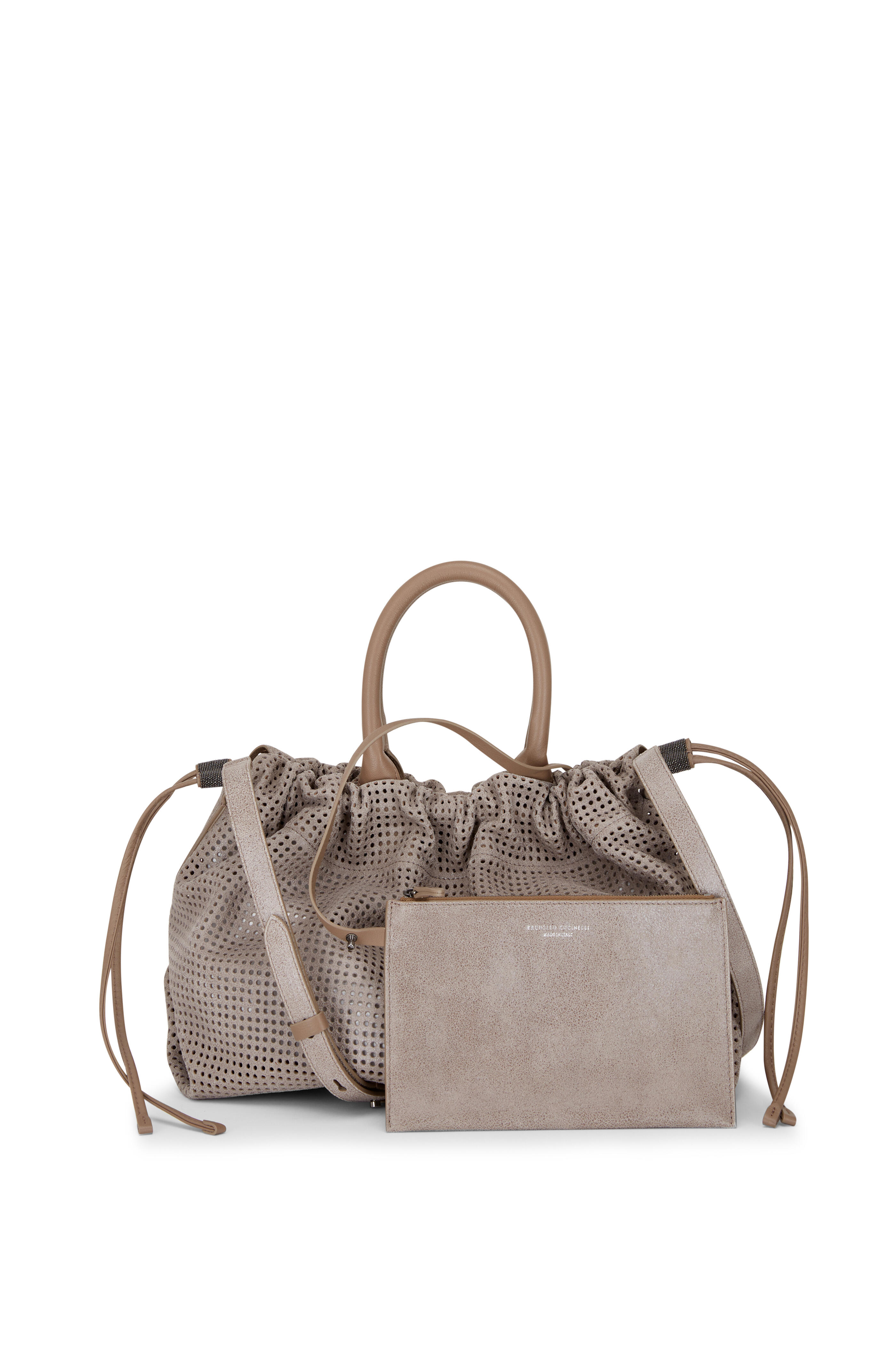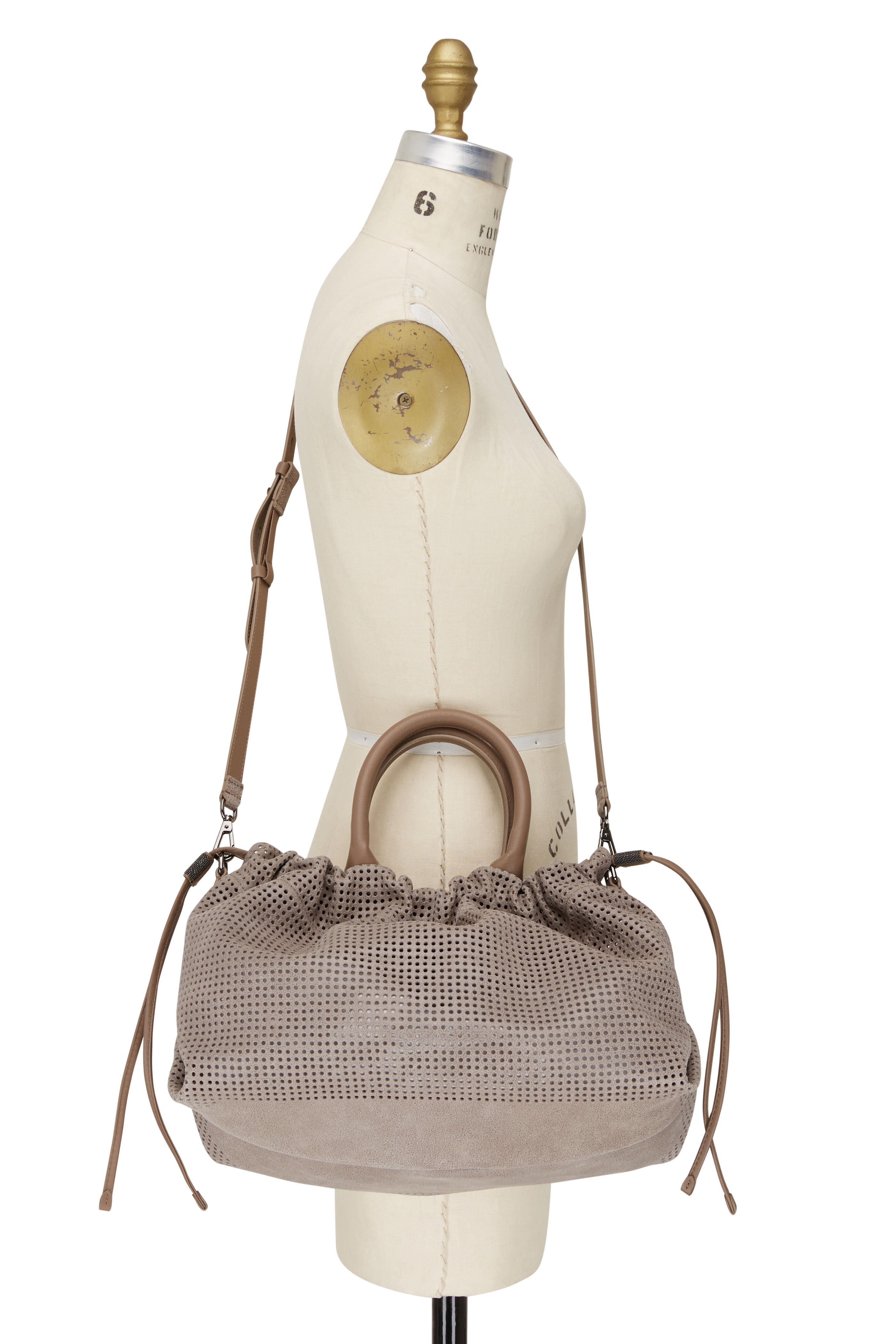 Perforated leather. Dual leather top handles. Removable and adjustable suede shoulder strap. Top magnetic closure; adjustable side drawstrings with monili detailing. Detachable suede zip pouch. Unlined. Made in Italy. Height: 9". Width: 14". Depth: 7". Handle drop: 5". Strap drop: 21".