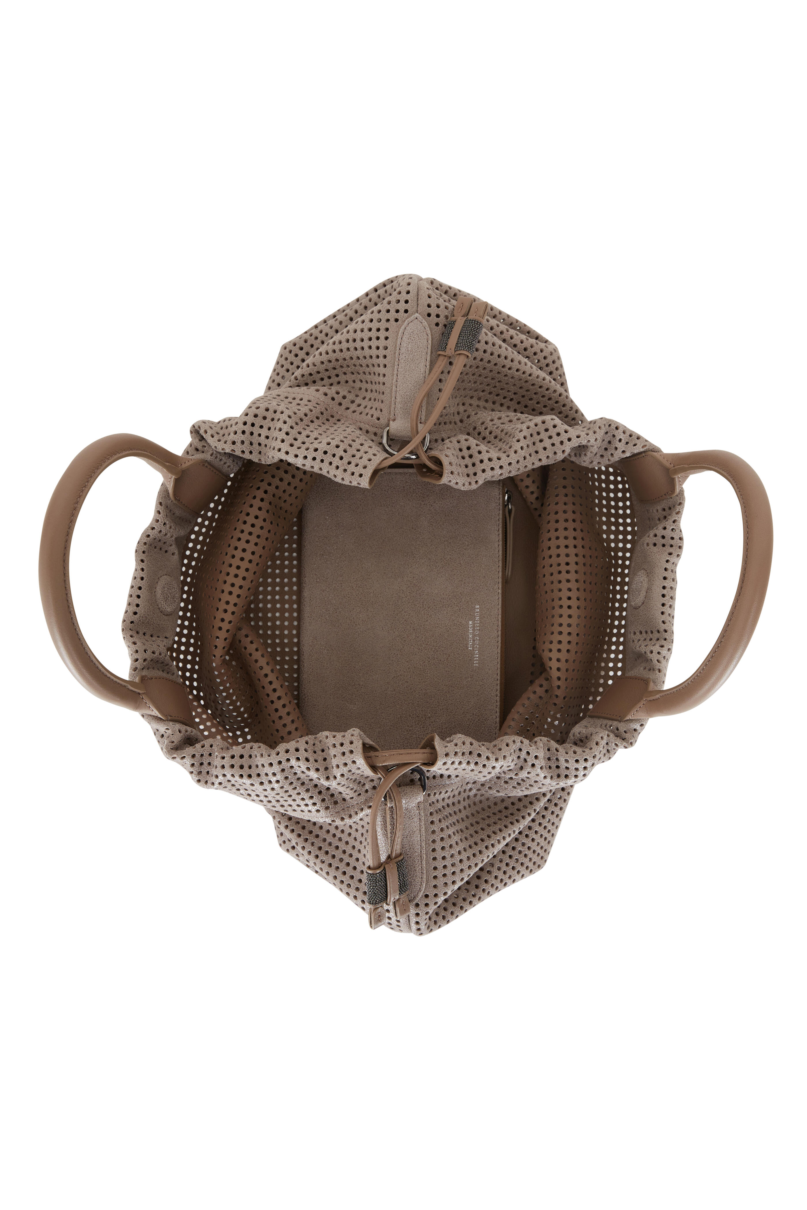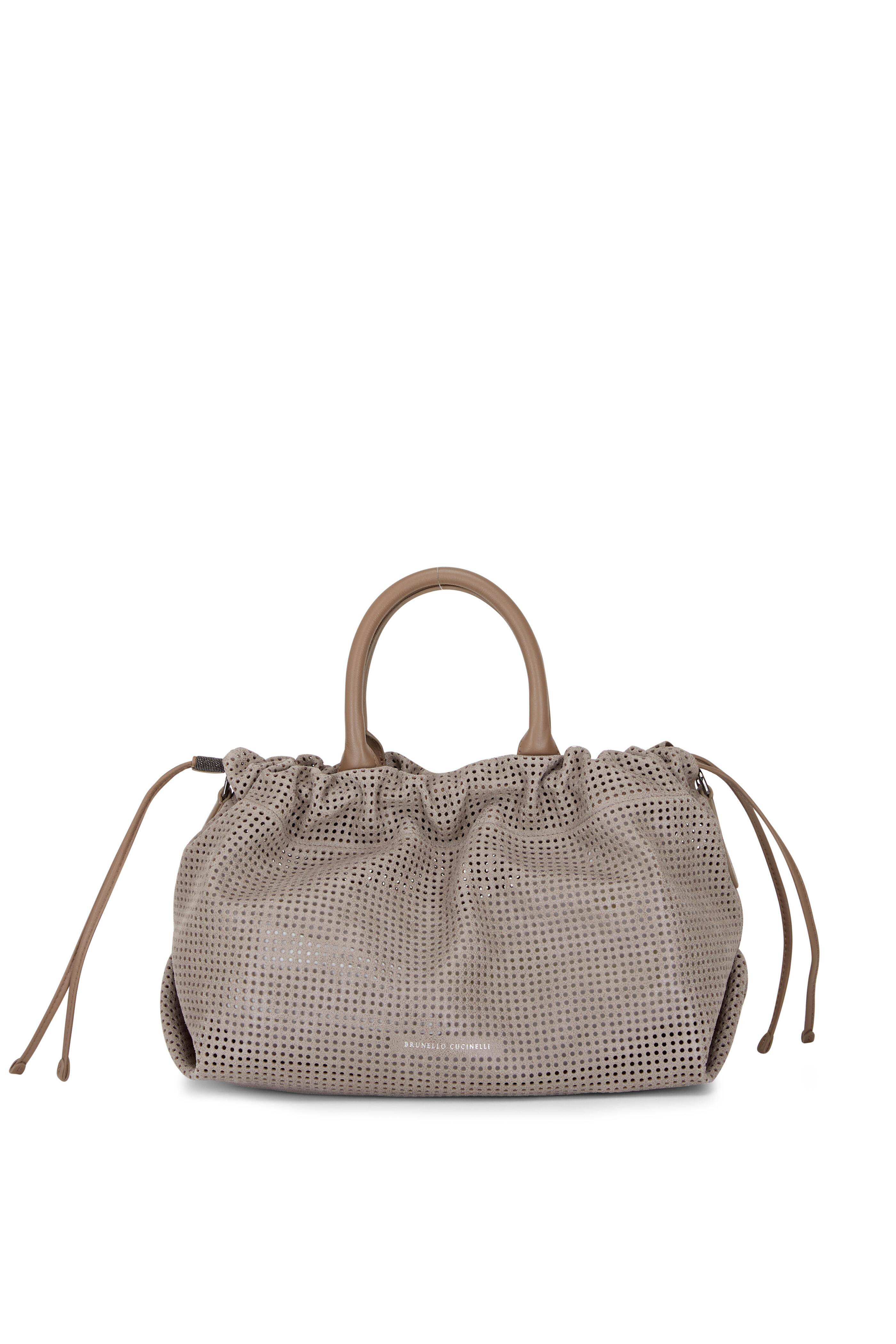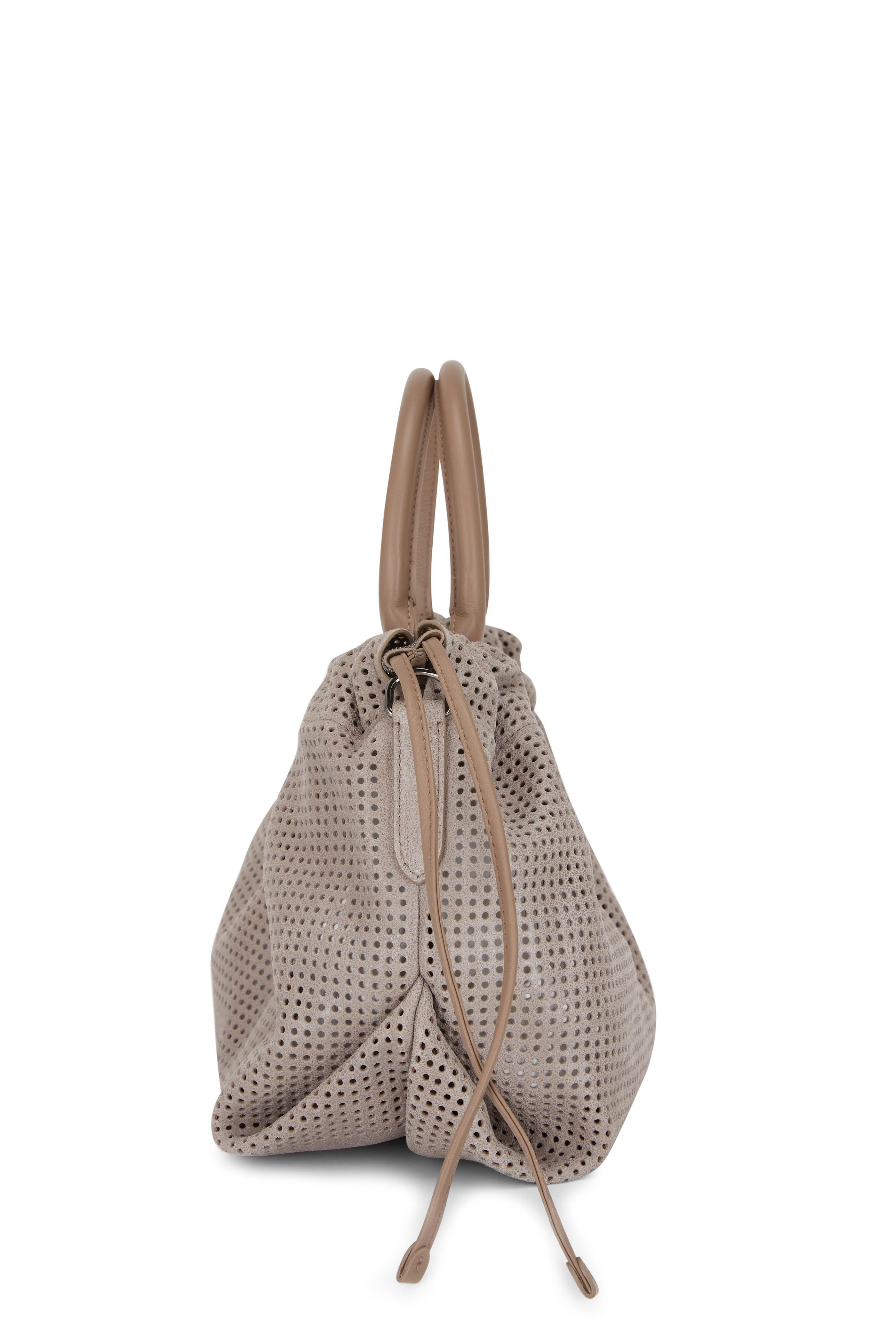 Perforated leather. Dual leather top handles. Removable and adjustable suede shoulder strap. Top magnetic closure; adjustable side drawstrings with monili detailing. Detachable suede zip pouch. Unlined. Made in Italy. Height: 9". Width: 14". Depth: 7". Handle drop: 5". Strap drop: 21".