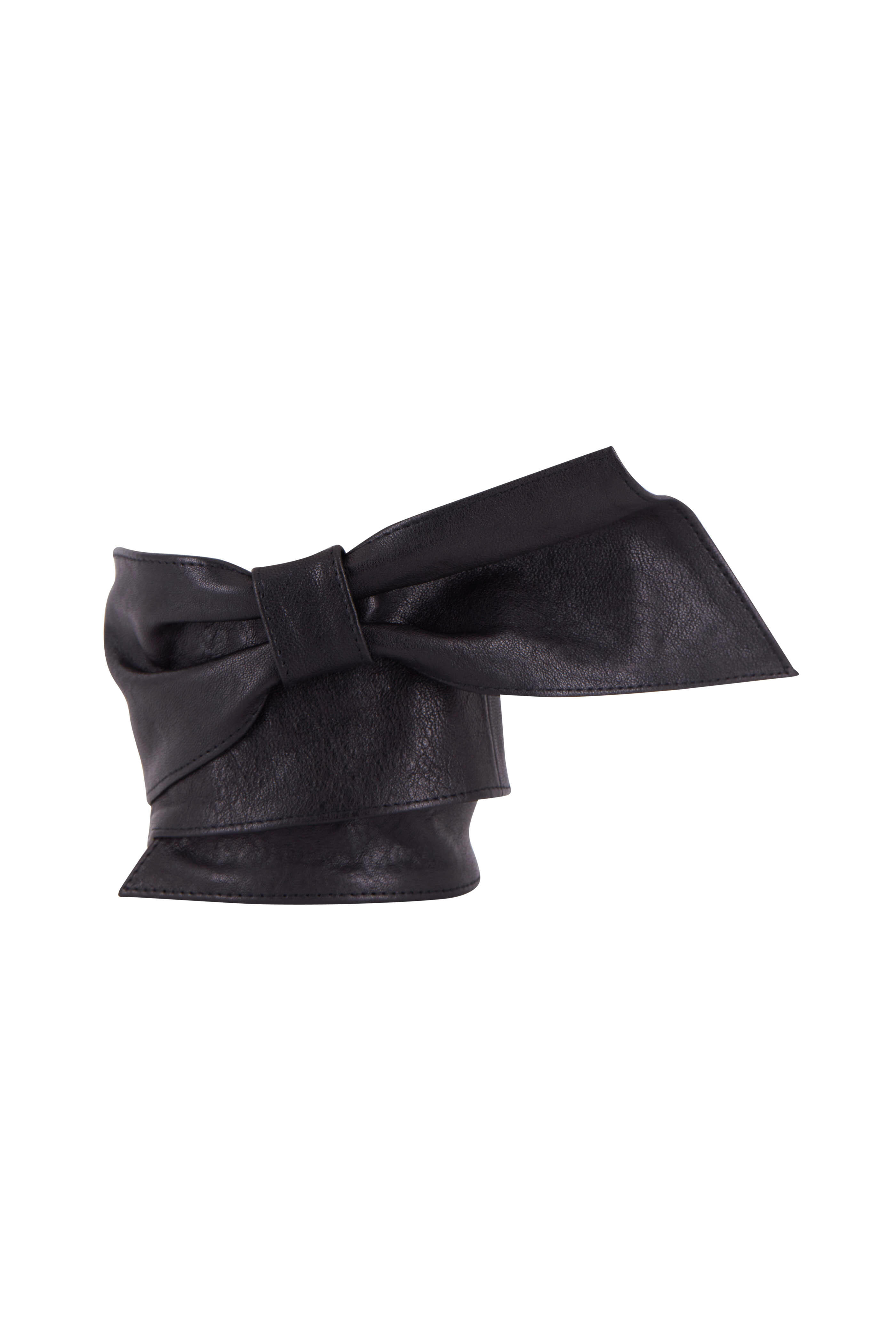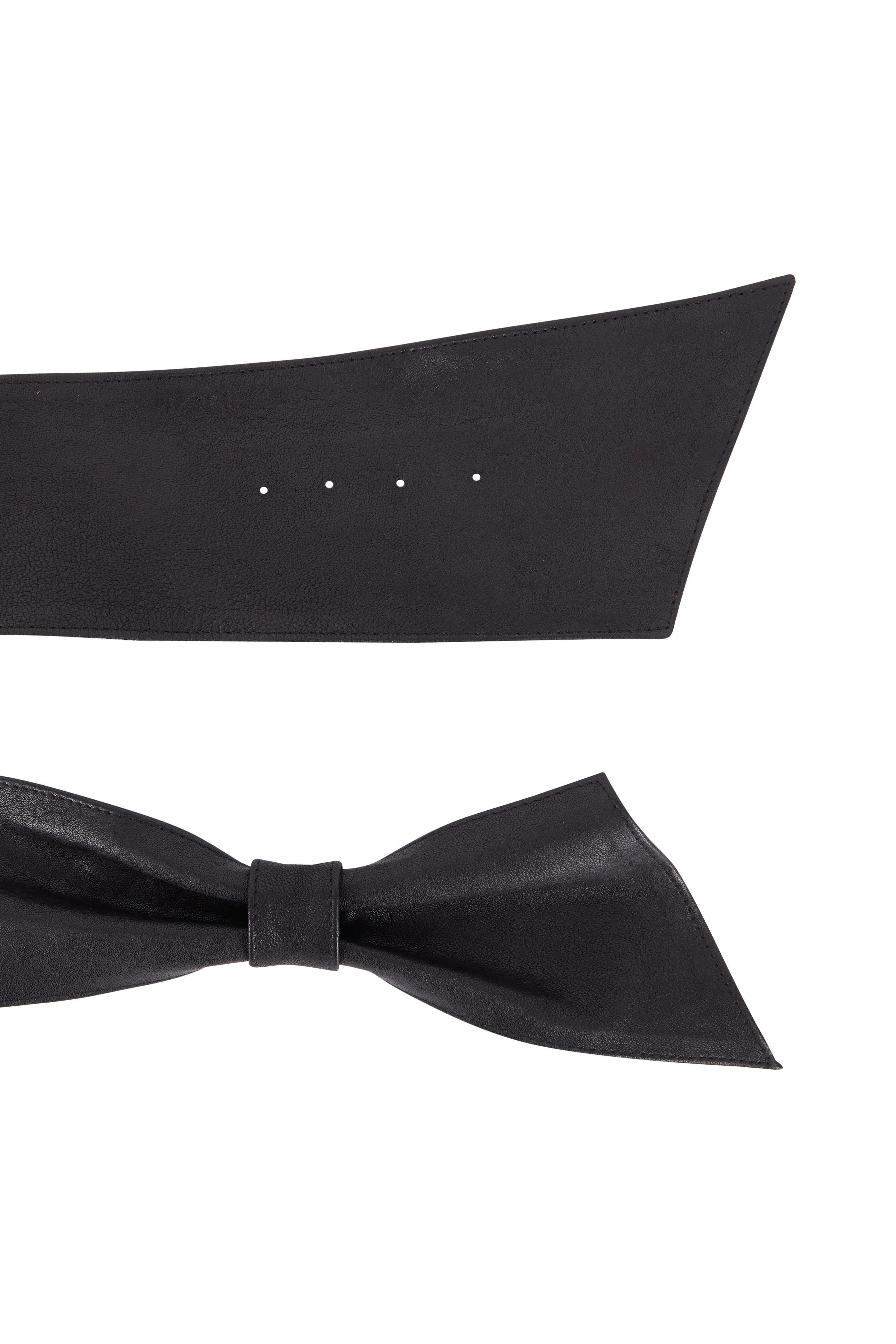 Leather. Concealed closure. Bow detail at waist. Made in the USA.