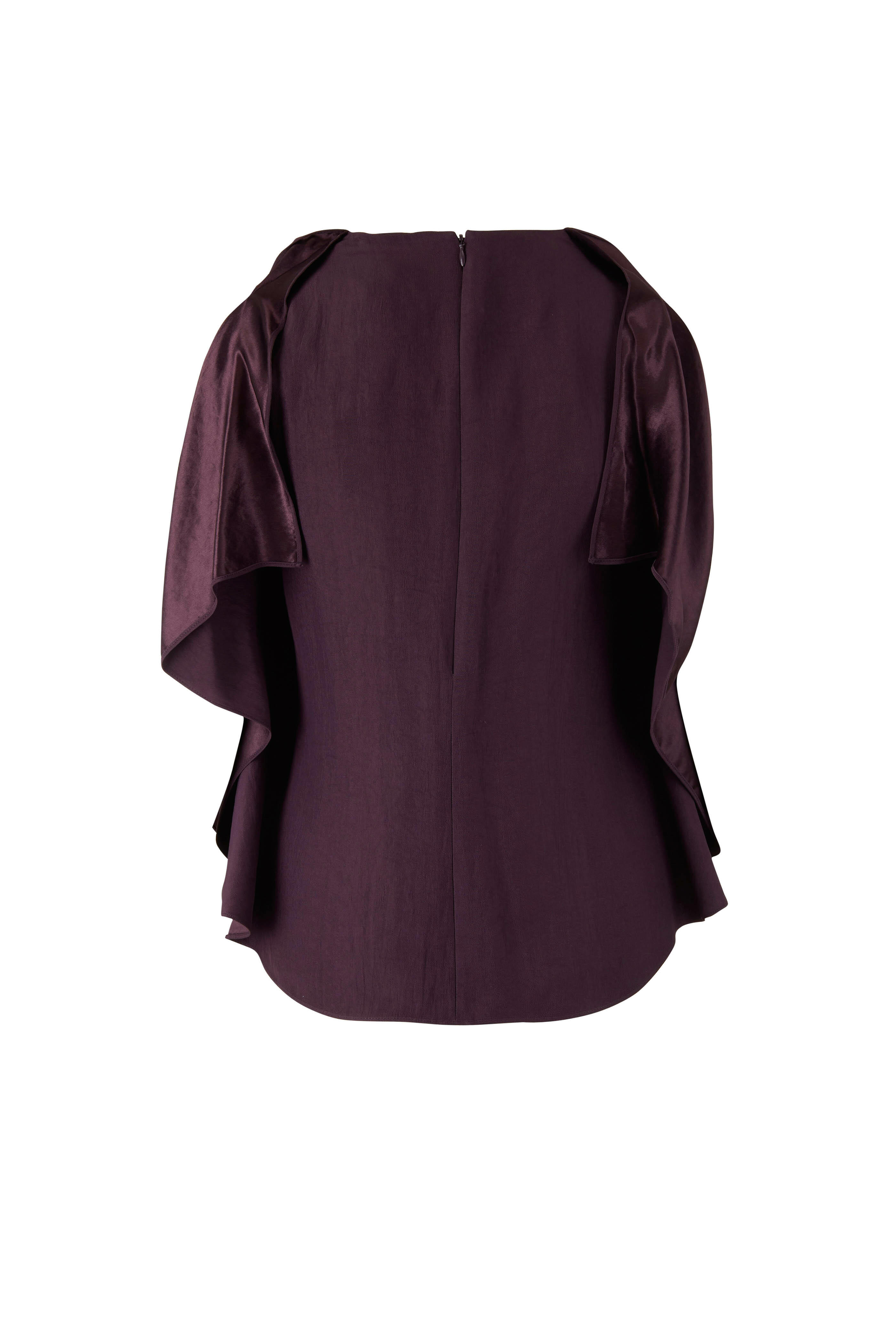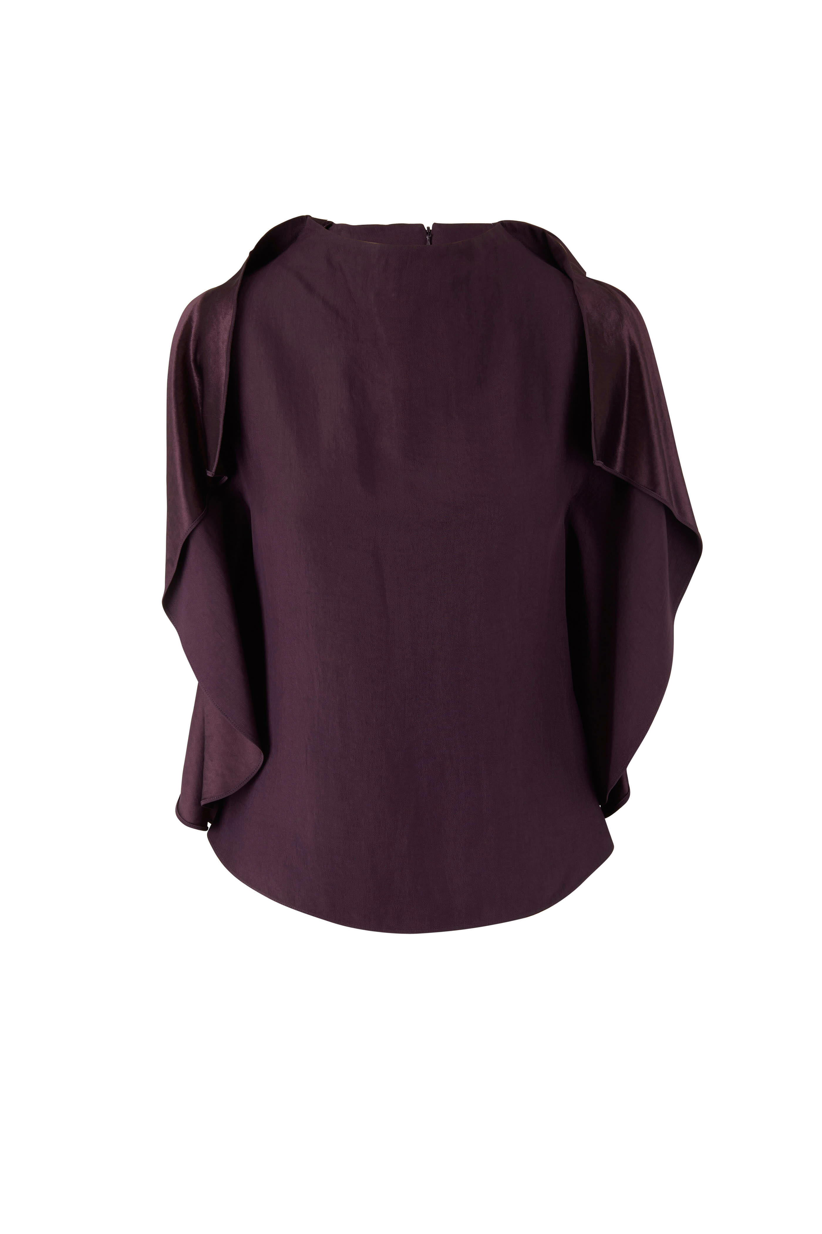 Concealed back zip. Draped sleeves. Made in the USA. 100% acetate. Dry clean.
