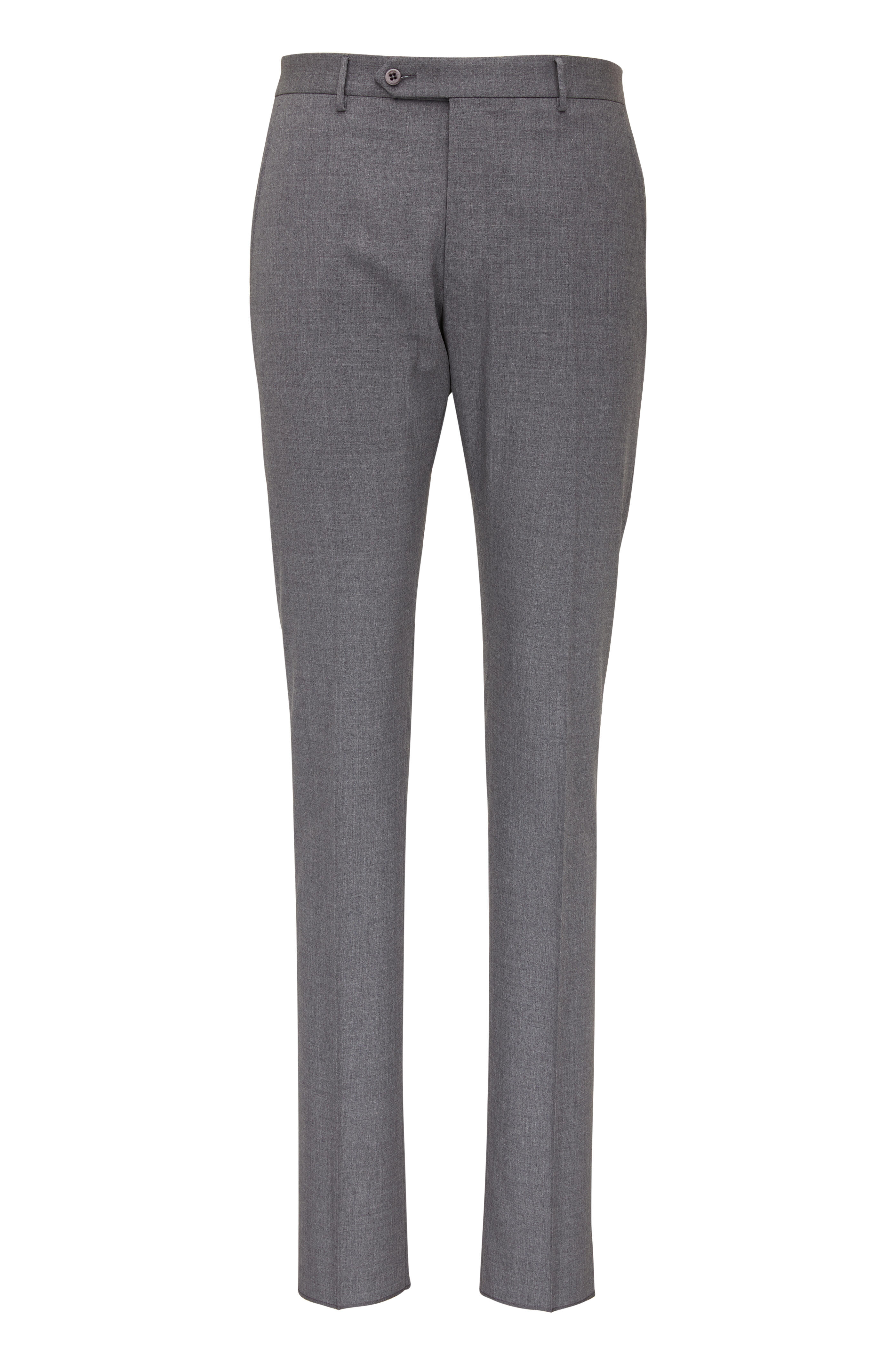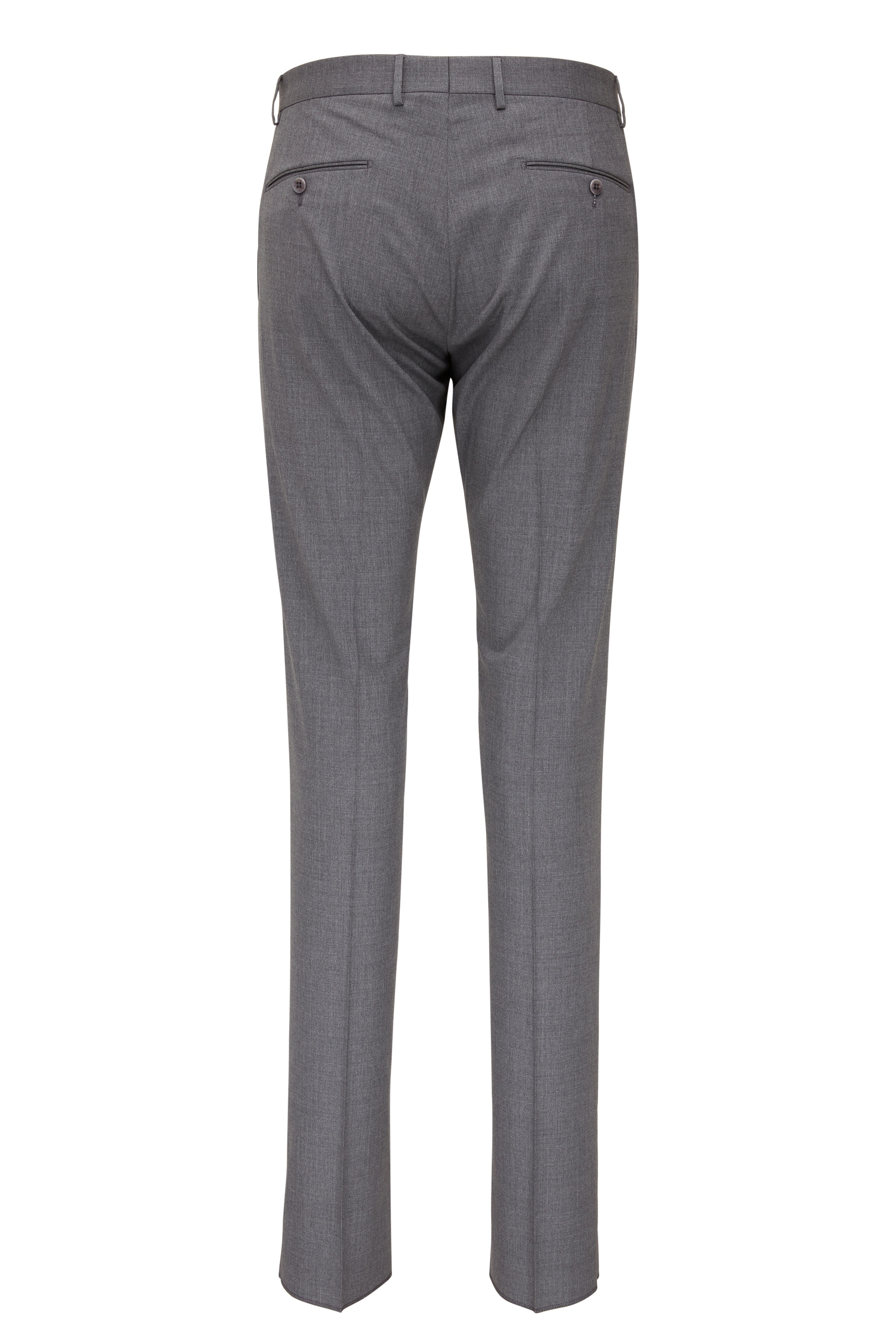 Zip fly with button tab. Side slash pockets; back welt pockets. Raw hem. Made in Italy. 98% virgin wool, 2% elastane. Dry clean.