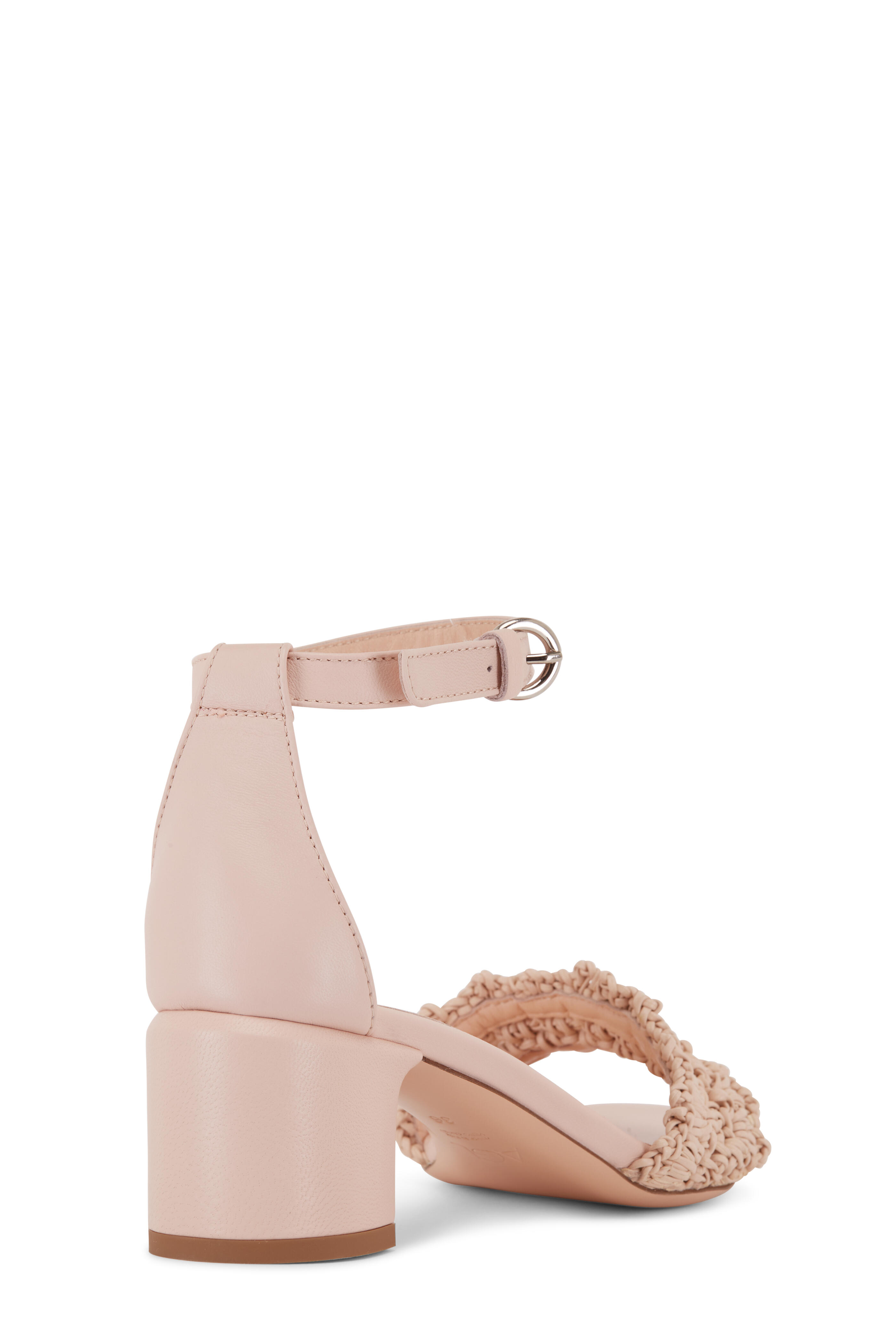 Smooth leather upper. Open, round toe. Adjustable buckle ankle strap. Crochet strap at vamp. Self-covered block heel. Leather and rubber sole. Made in Italy. Heel measurement: 50mm (about 2").