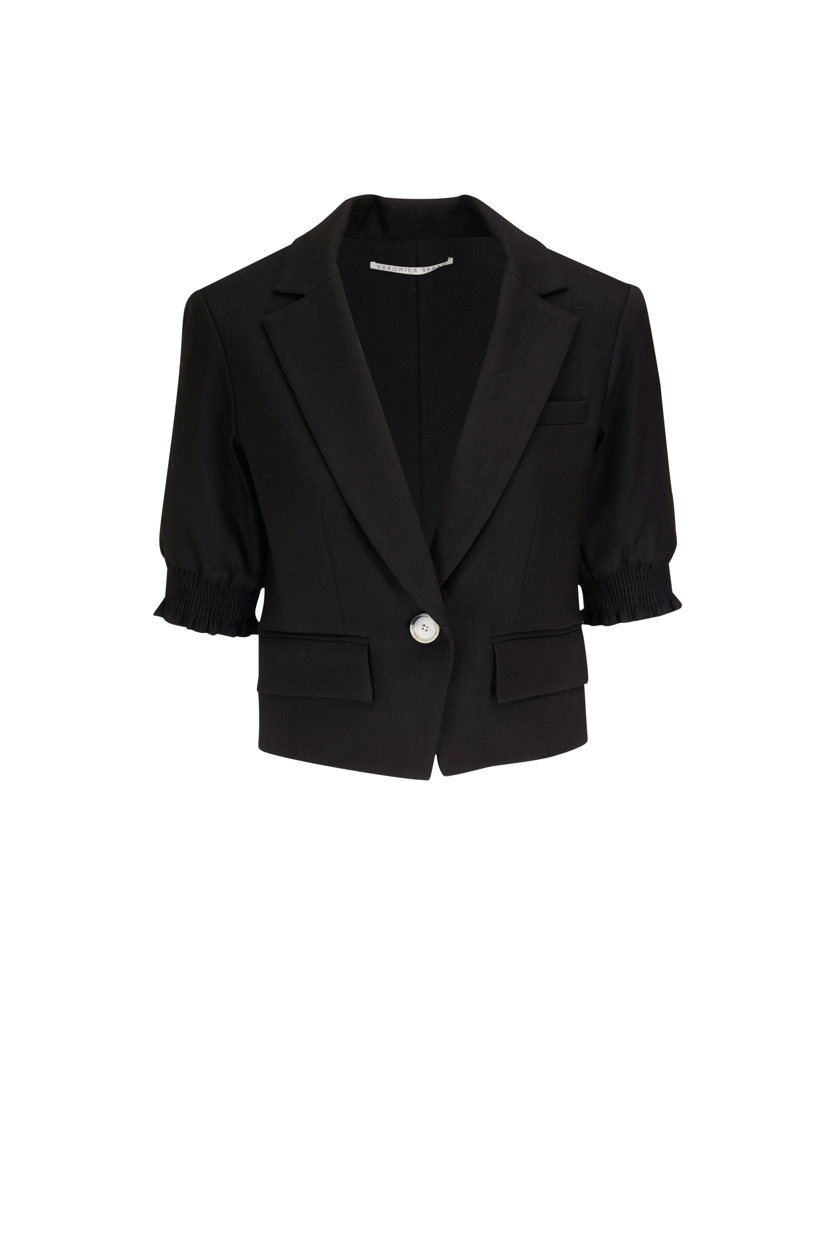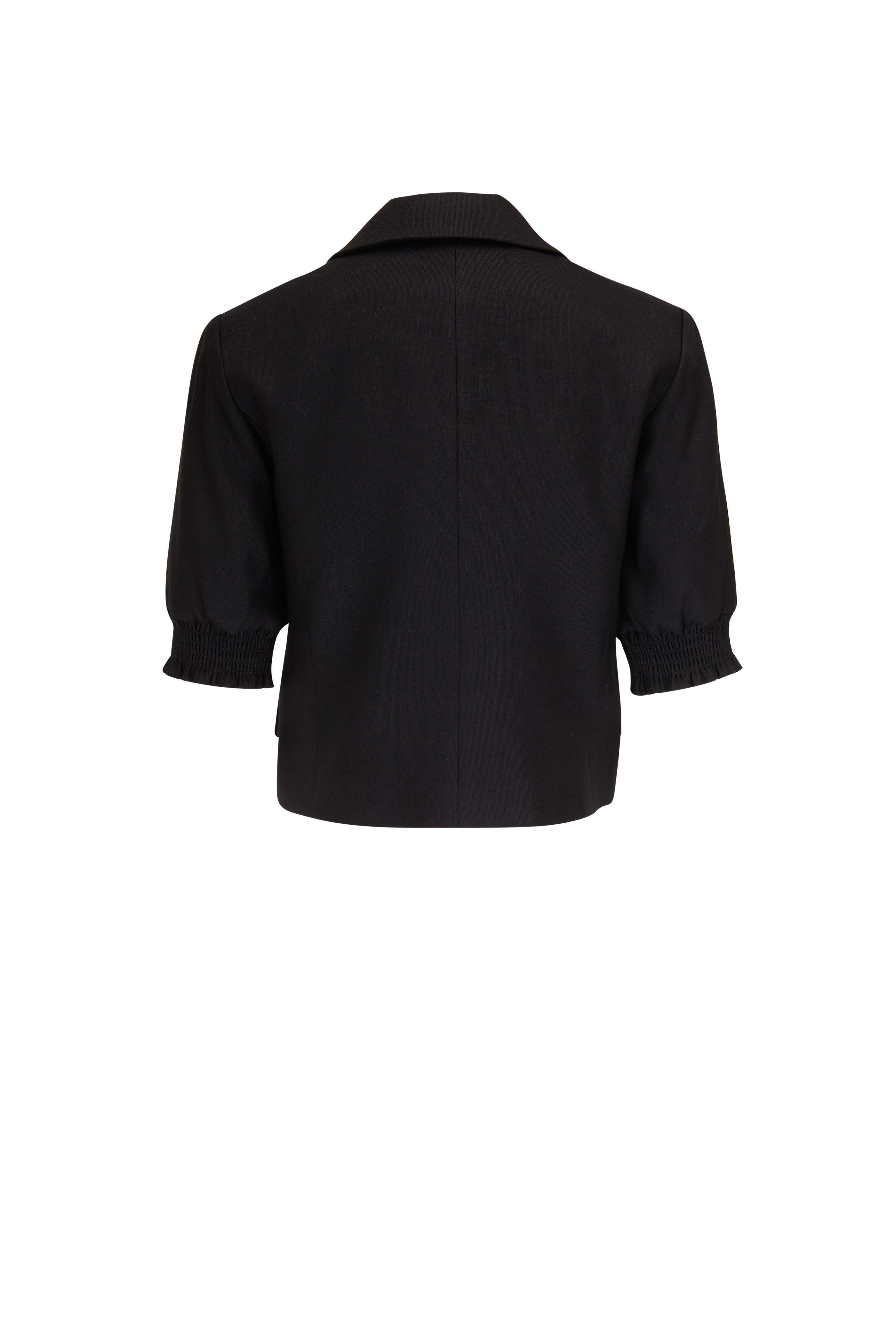 Notched lapels. Single button closure. Elasticized, ruffle cuffs. Lower flap pockets; chest welt pocket. Made in the USA. Cropped fit. 58% linen, 27% polyester, 14% viscose, 1% elastane; lined. Dry clean.