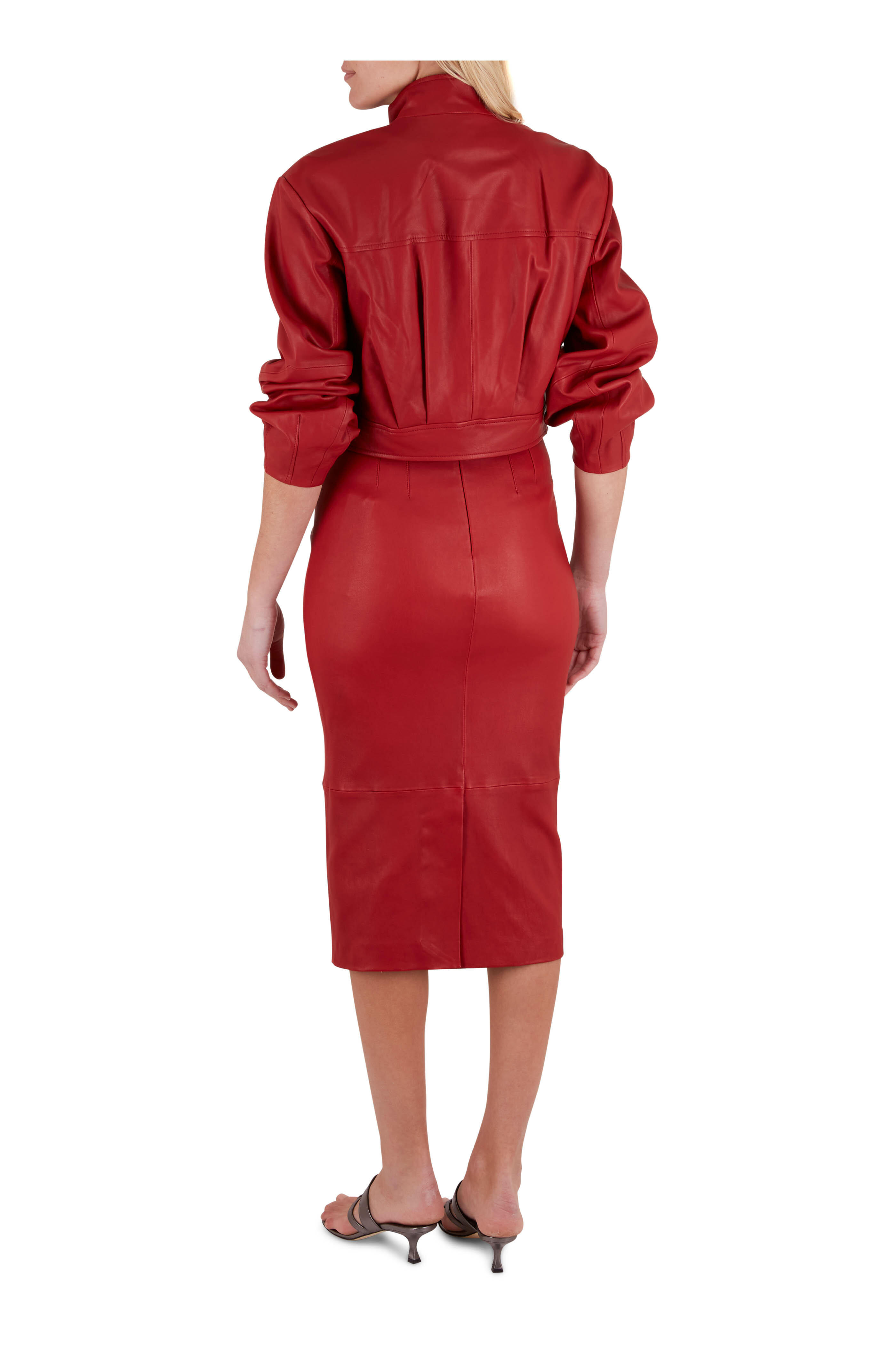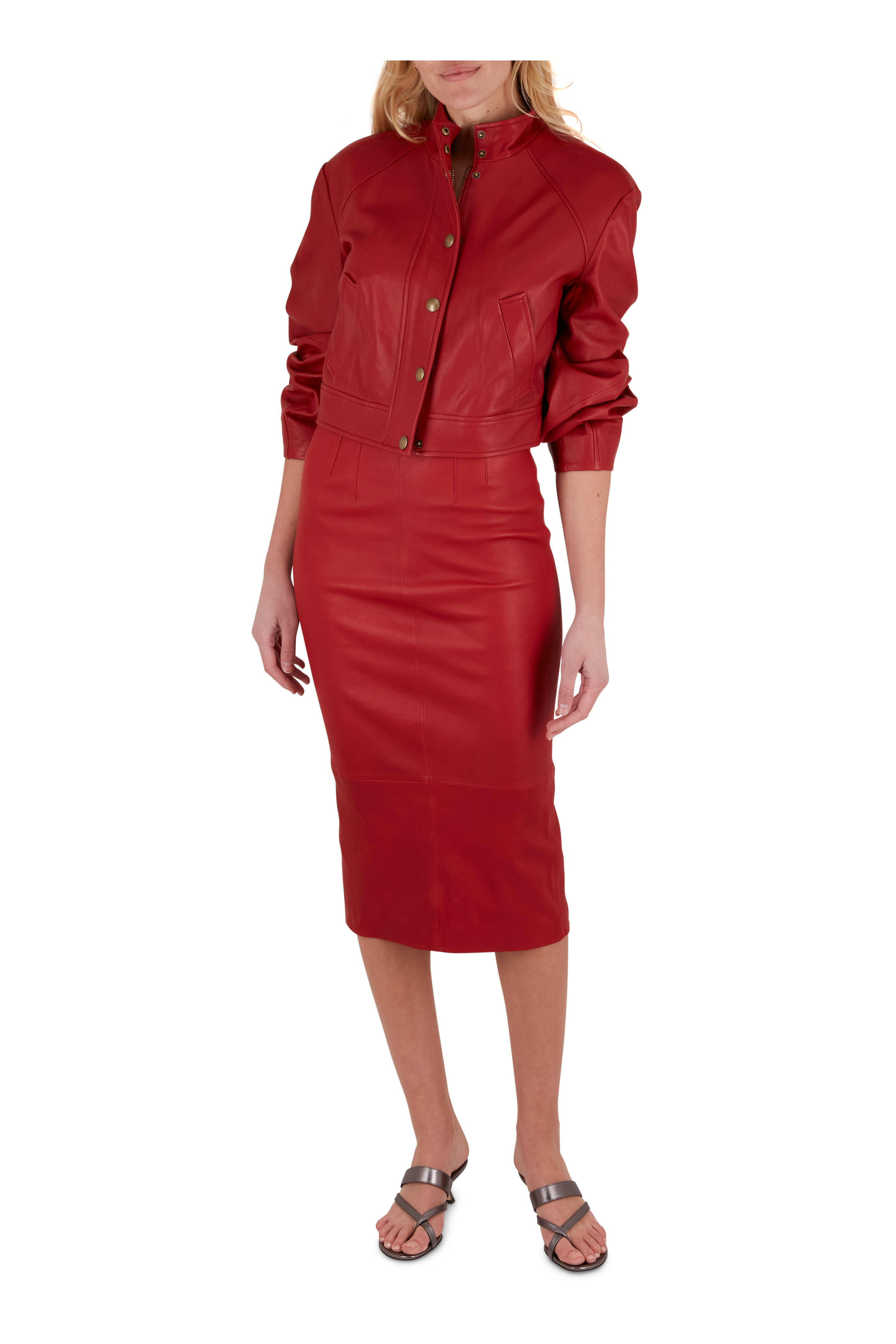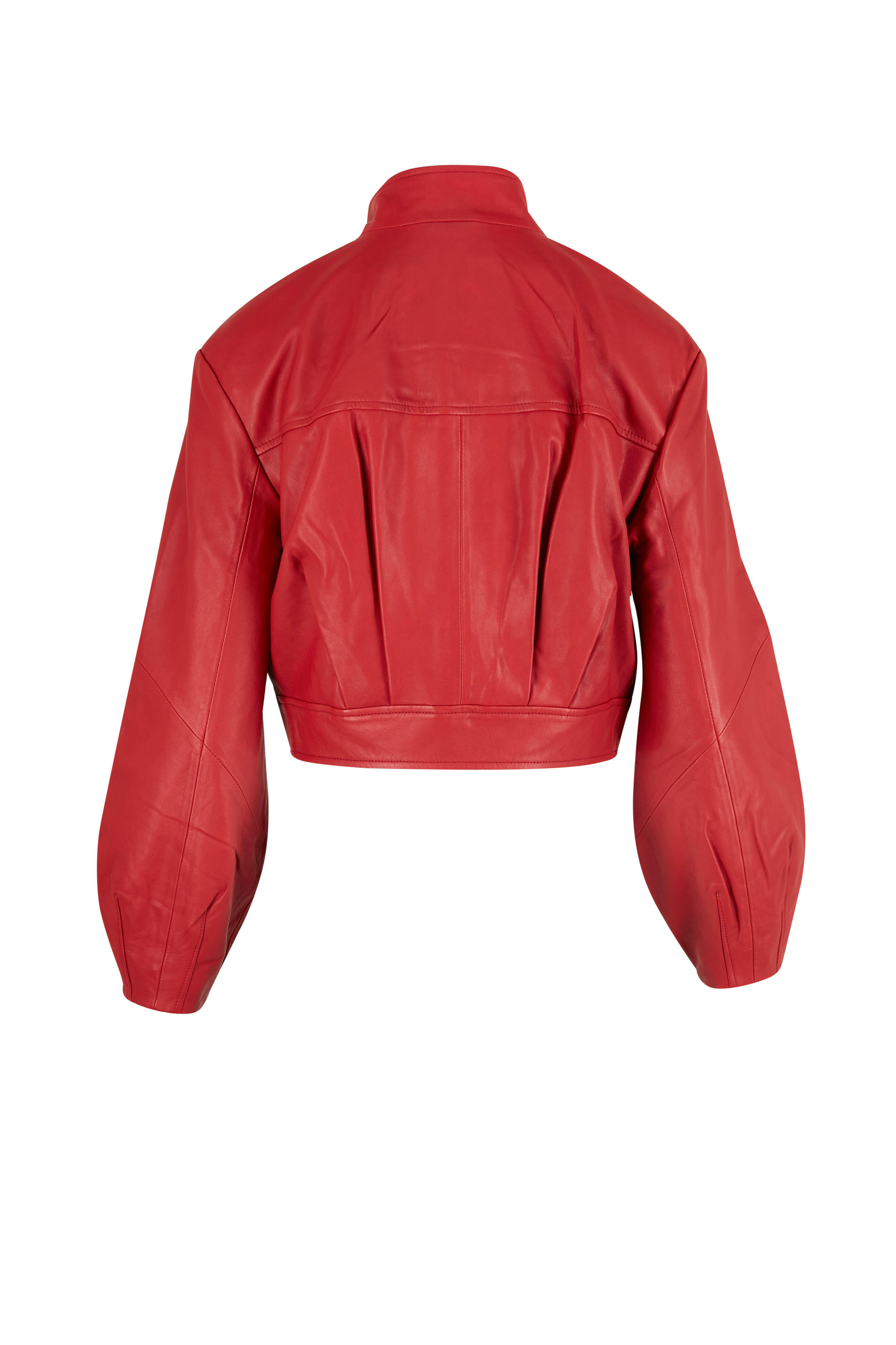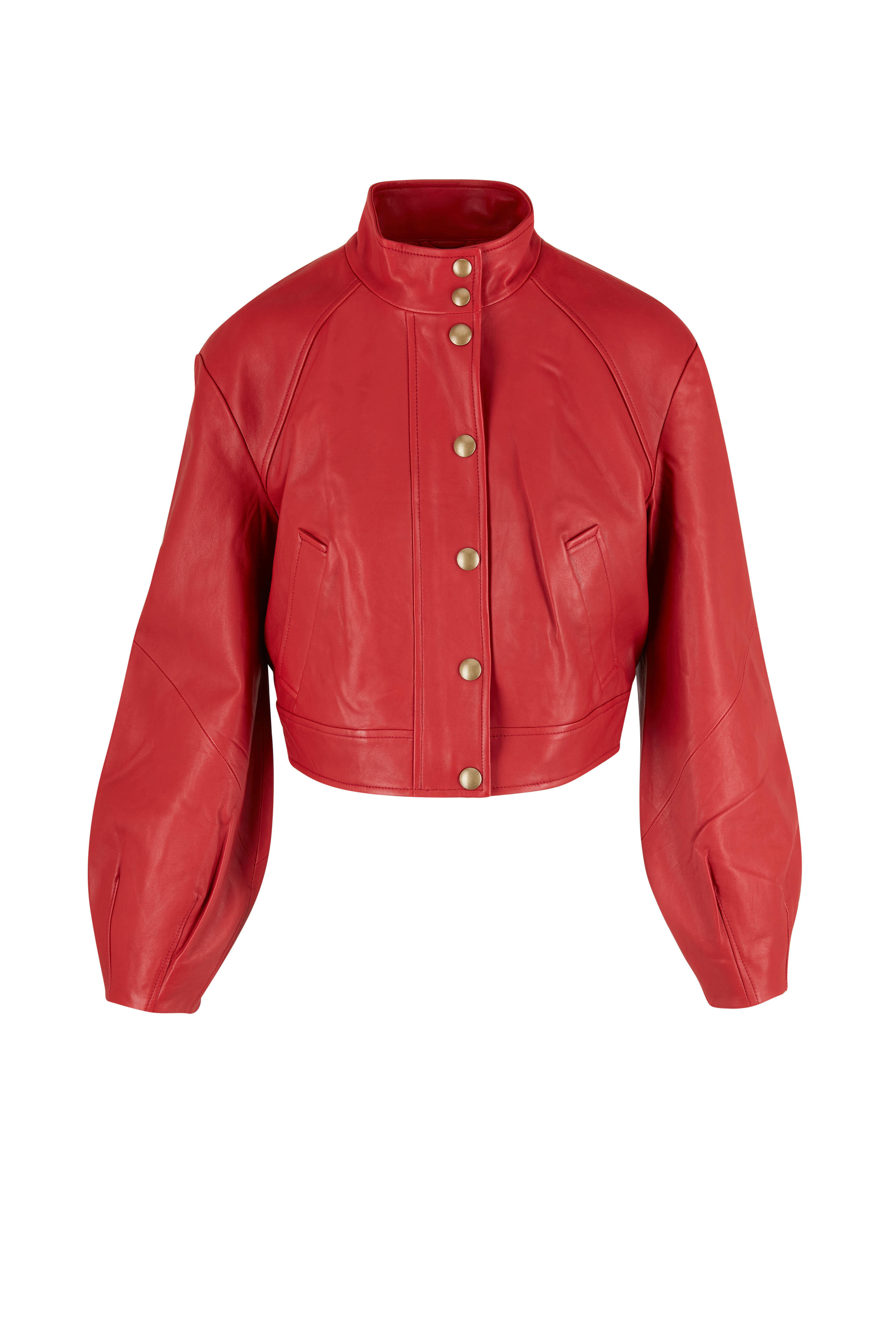 Leather; lined. Specialist clean. Banded collar; two snap closure. Concealed two-way zip; snap placket. Lower slip pockets. Imported. Cropped.