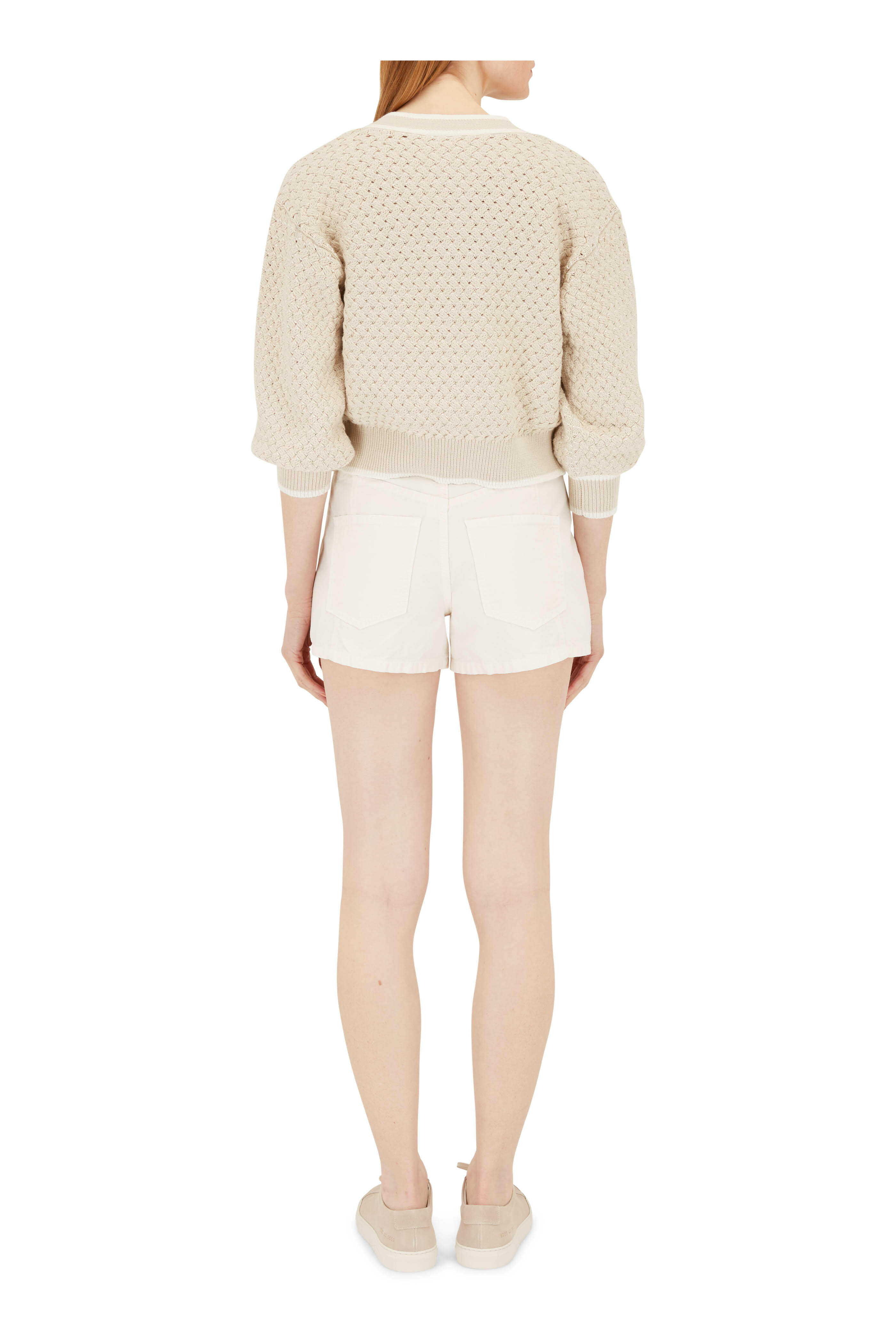V-neckline. Front button placket. Ribbed trim. Imported. 100% cotton. Dry clean.