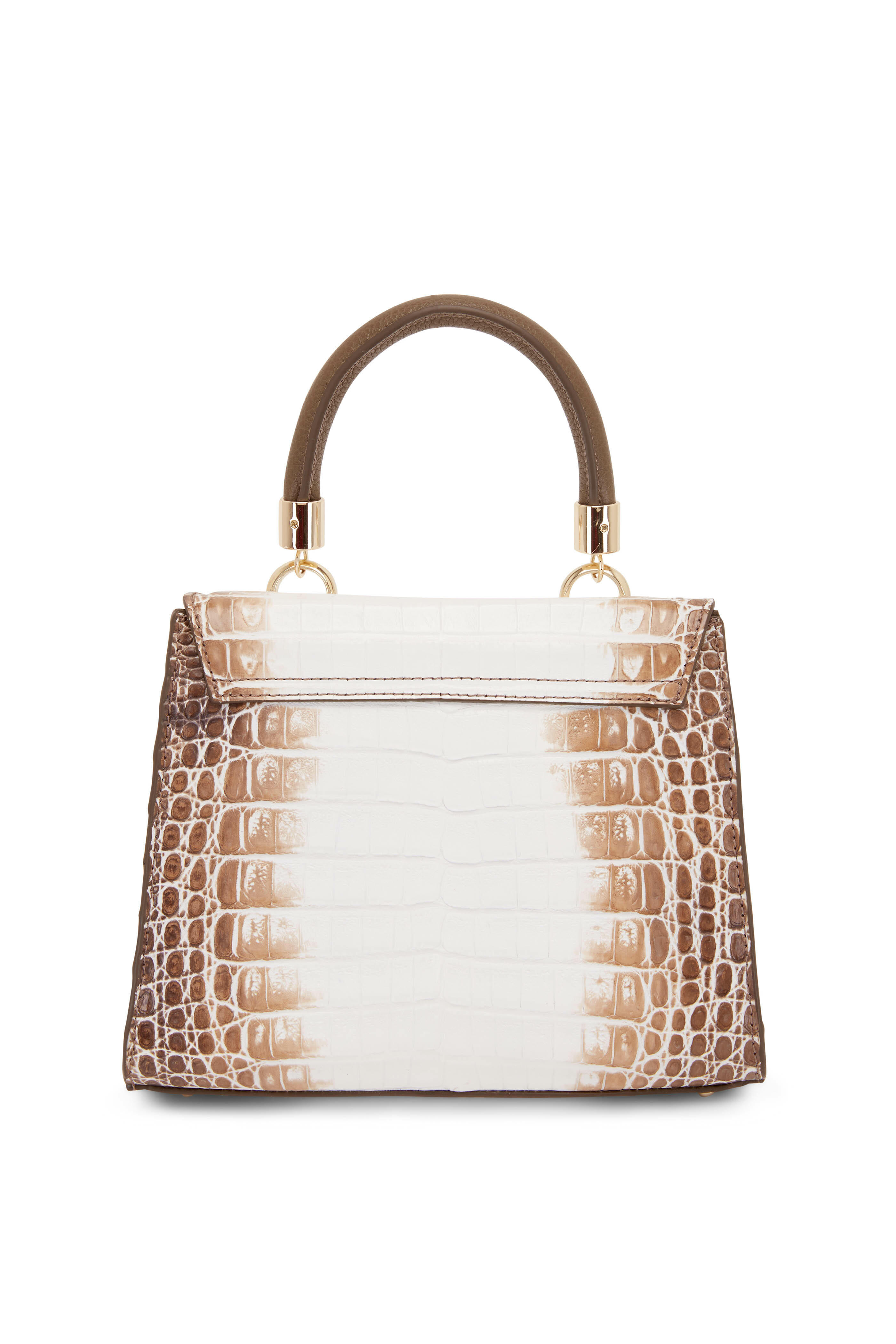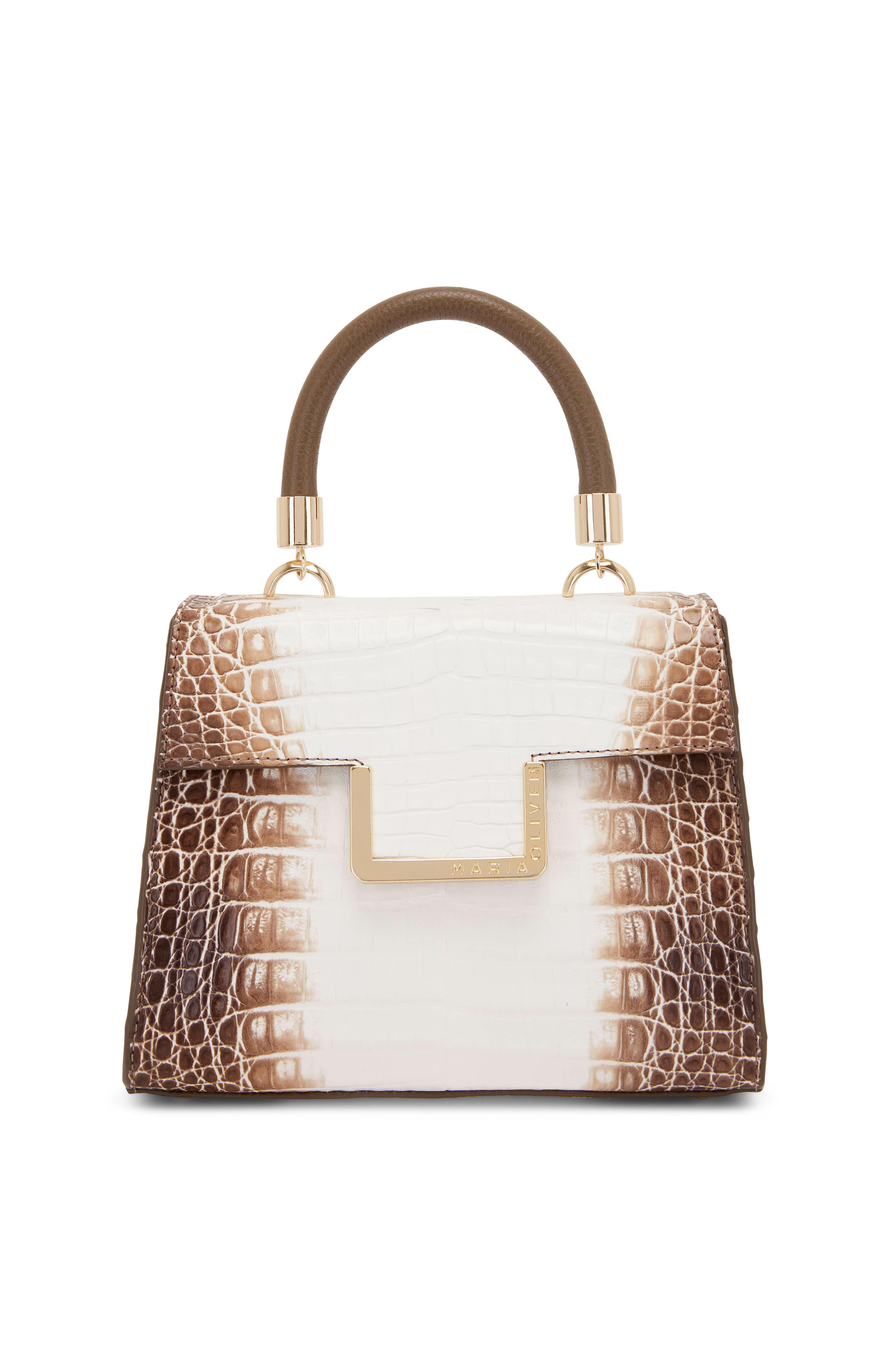 Caiman crocodile. Tubular top handle. Front flap; magnetic snap closure. Interior slip pocket. Leather lining. Made in Spain. 8"H x 9"W x 3"D.