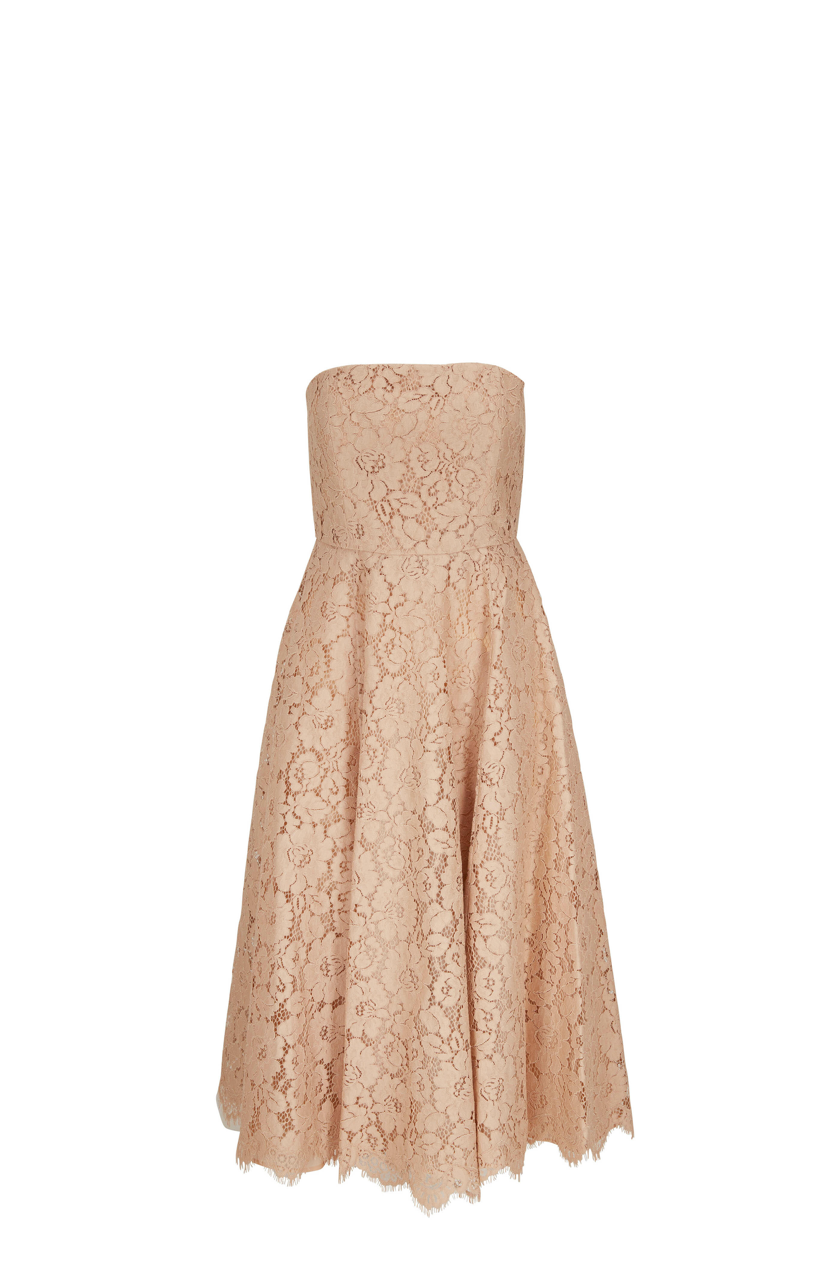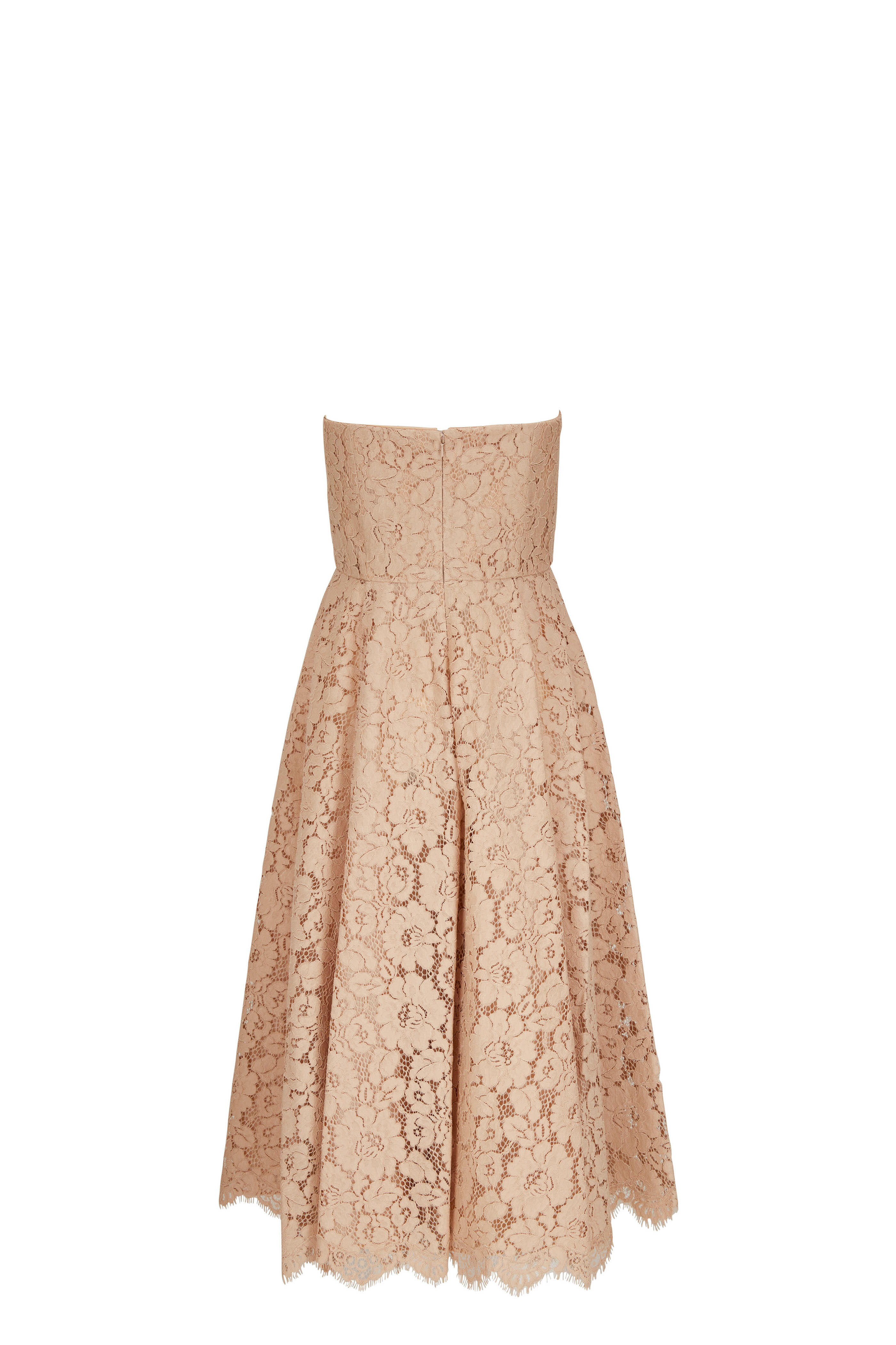 Concealed back zip. Strapless. Raw lace hem. Made in Italy. 62% cotton, 23% polyamide, 15% rayon; top lining: 100% silk; second lining: 76% acetate, 24% silk. Dry clean.