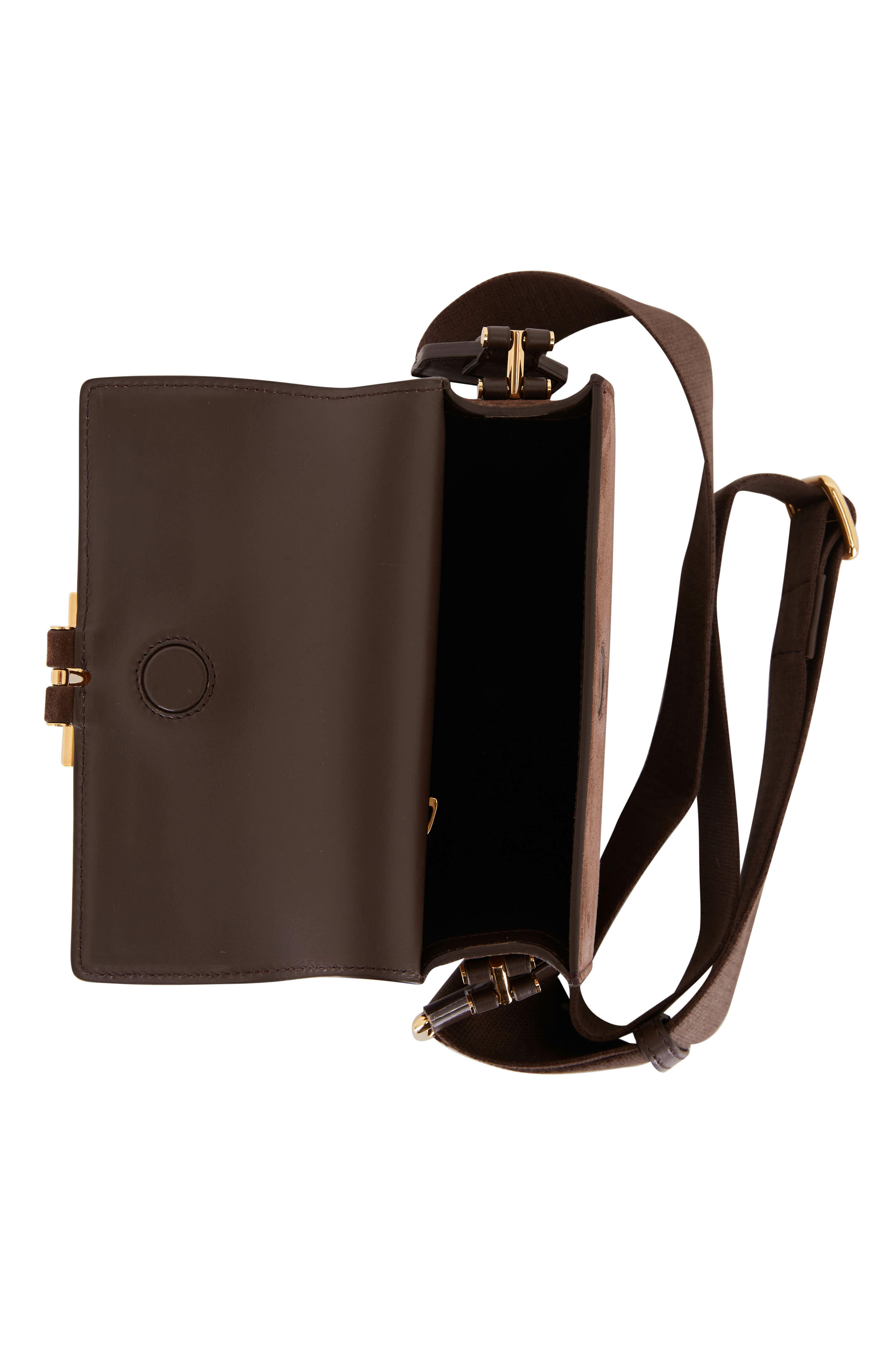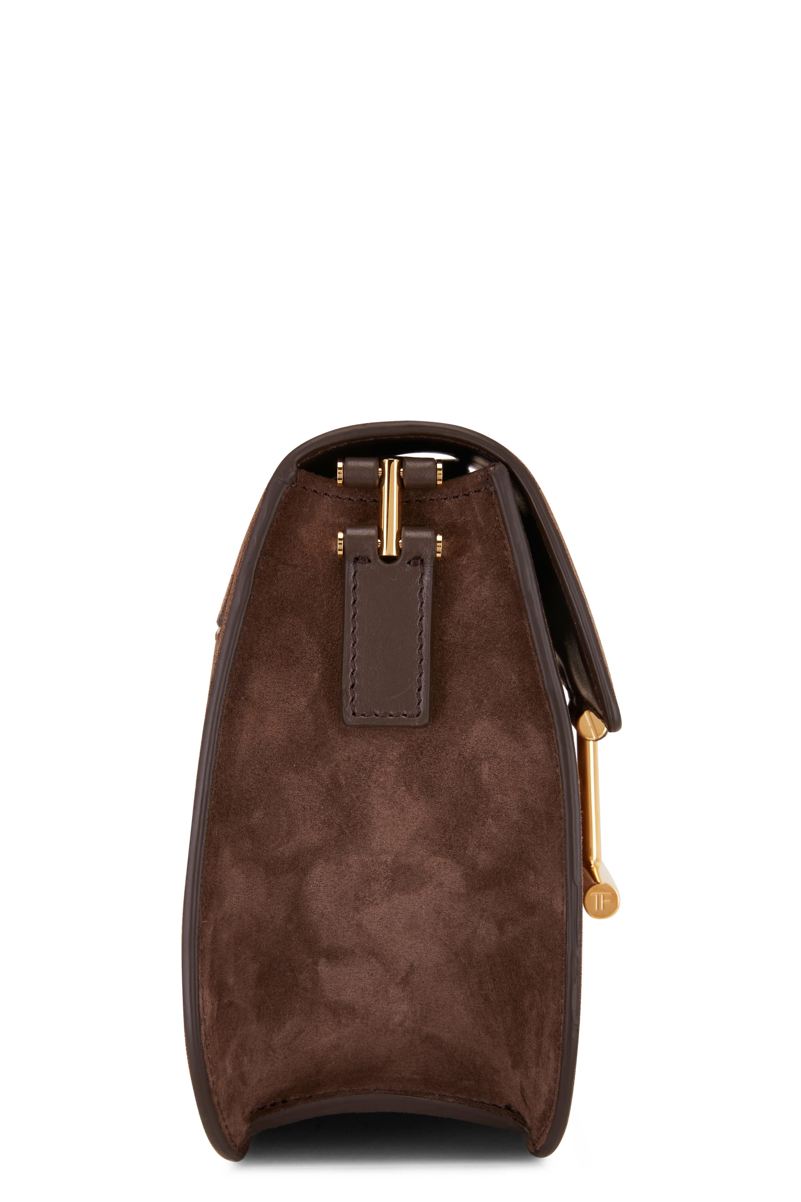 Suede. Adjustable nylon shoulder strap. Front front; magnetic snap closure. Signature gold-tone T clasp. Exterior back slip pocket. One interior zip pocket. Lined in leather. Made in Italy. Width: 8". Height: 7 ½". Depth: 3". Adjustable strap drop: 22".