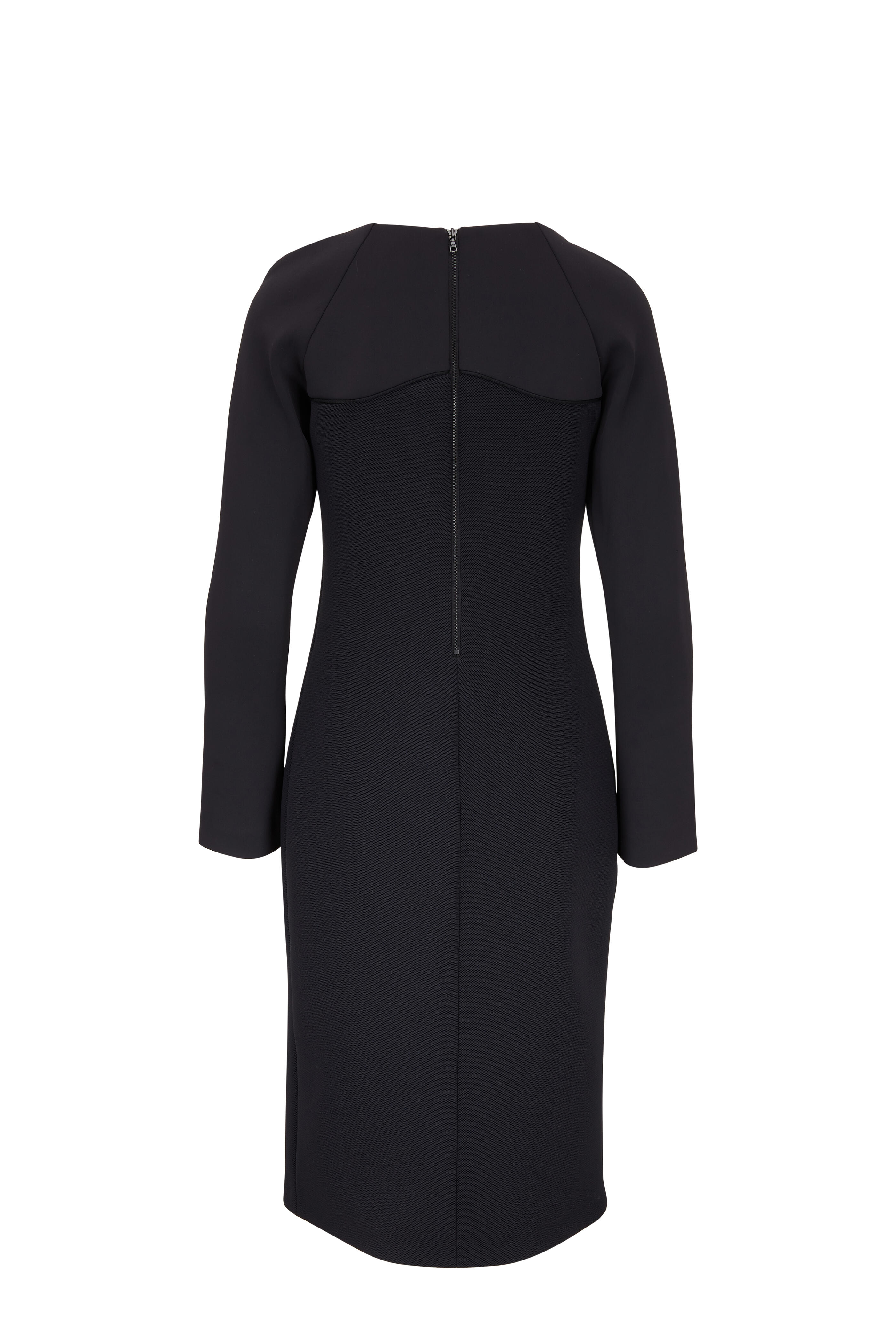 Round neckline. Exposed back zip. Made in the USA. 42½" shoulder to hem. 90% polyester, 10% elastane. Dry clean.