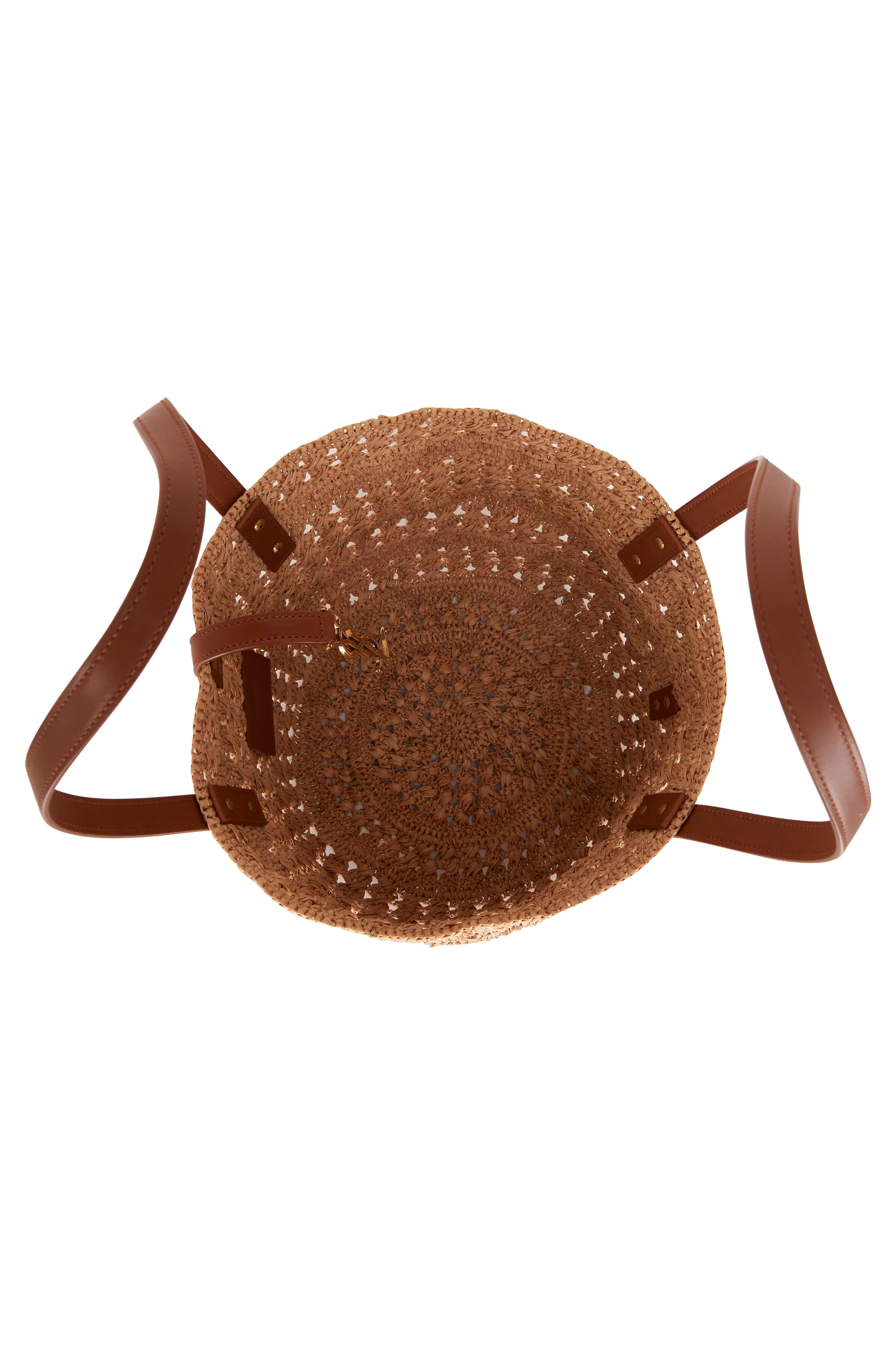 Raffia. Dual leather top handles. Sliding logo closure. Unlined. Made in Italy. 15" X 7.9" X 8.3". Strap drop: 11".