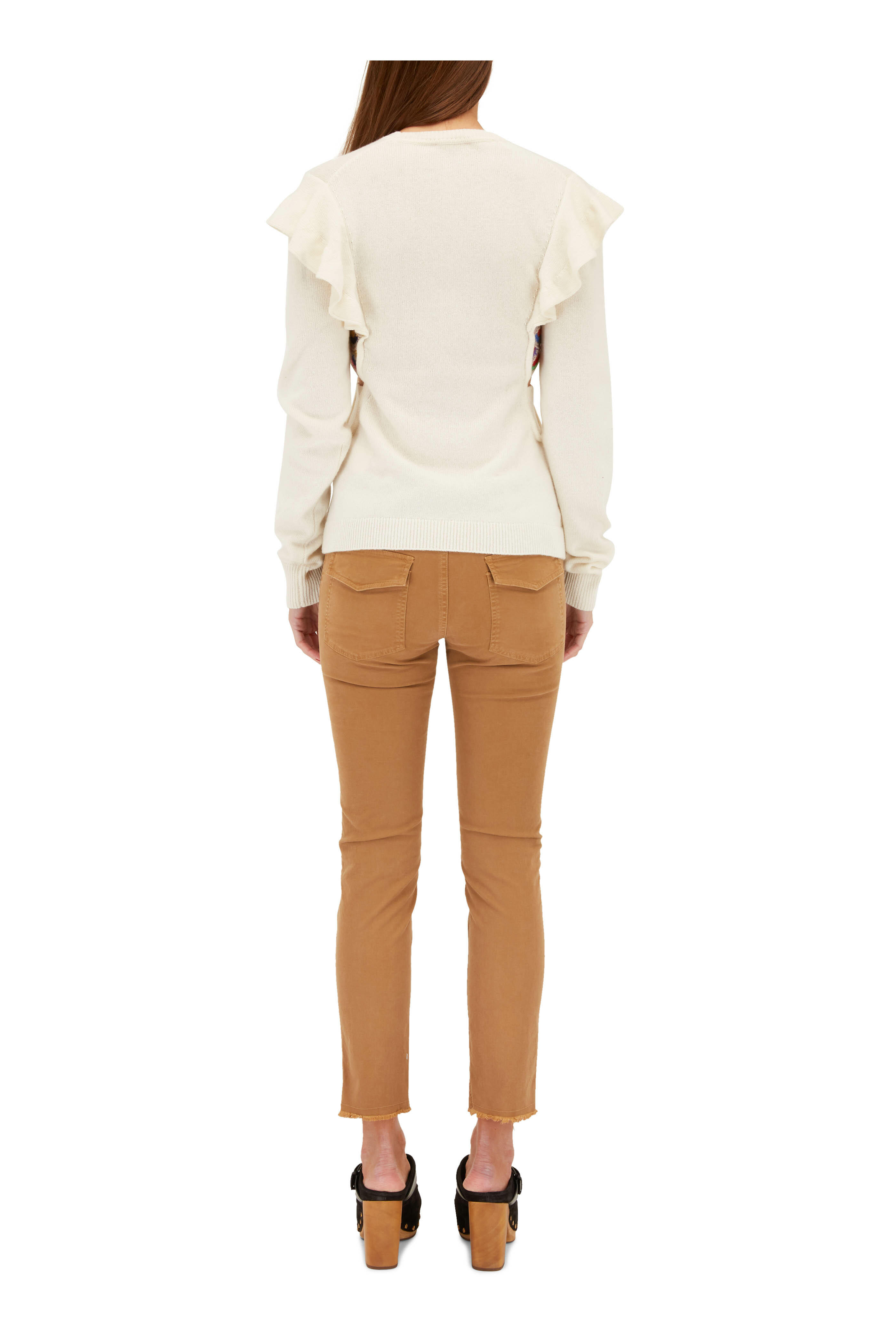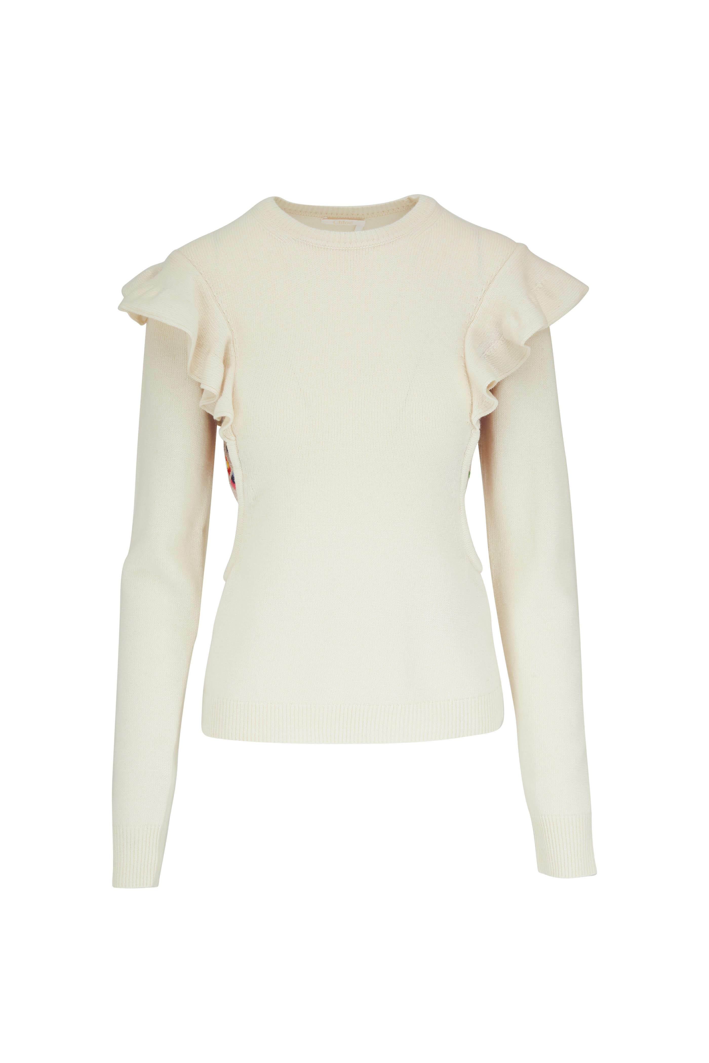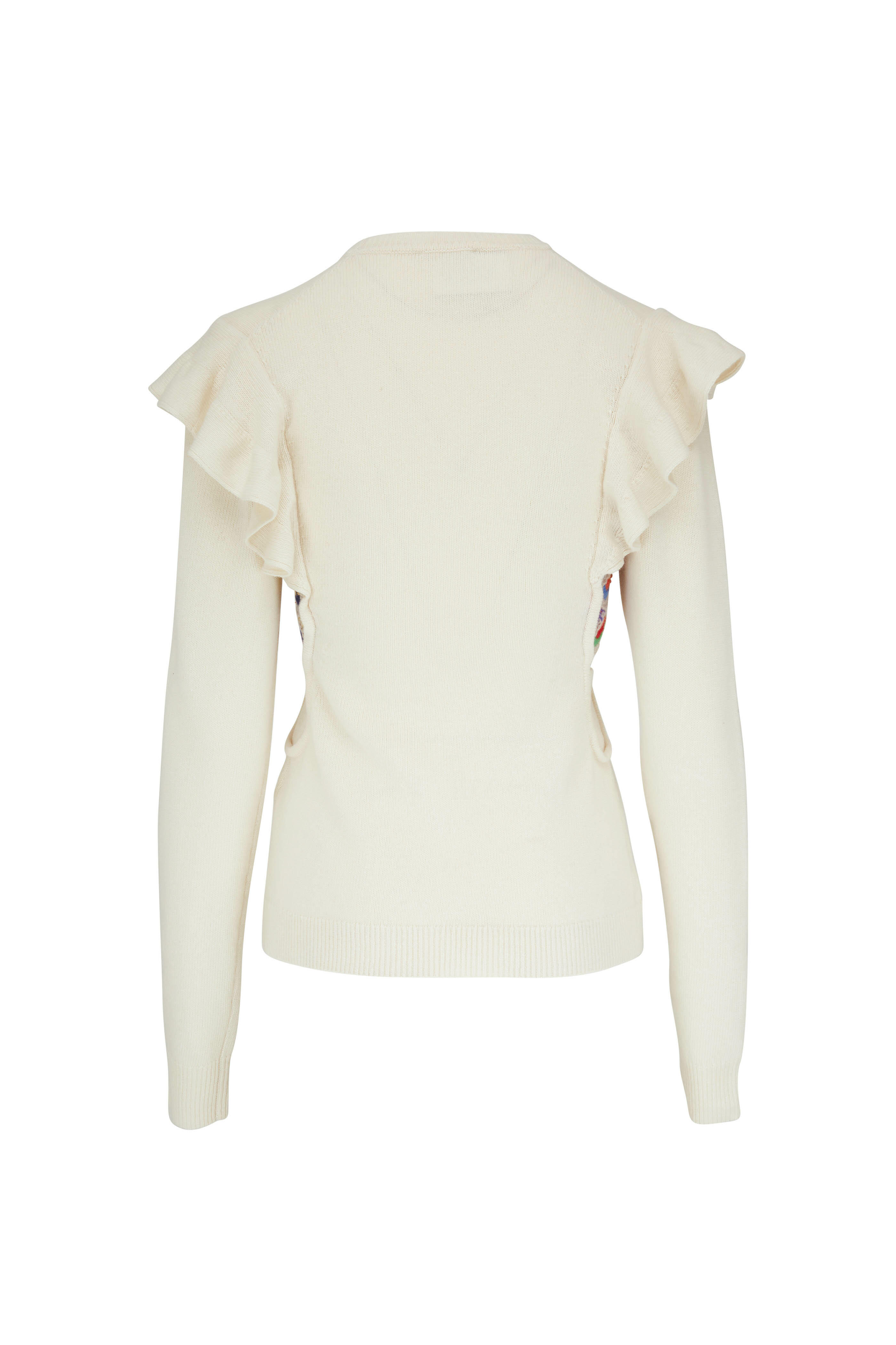 Crewneck. Long sleeves; ruffle detailing at shoulders. Rainbow crochet detailing at sides. Ribbed trims. Imported. 56% wool, 44% cashmere wool; sides: 80% cashmere wool, 20% wool. Dry clean.