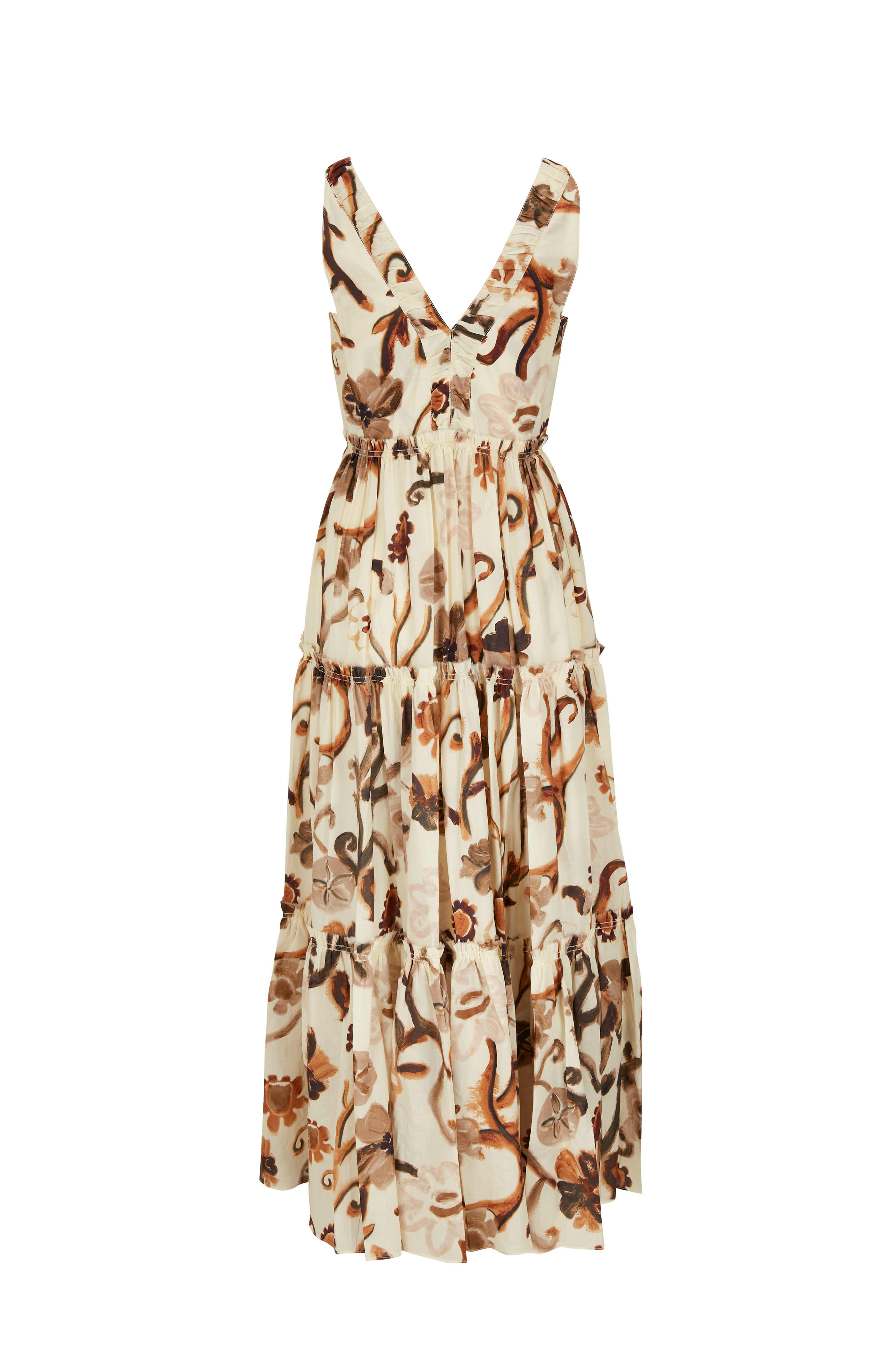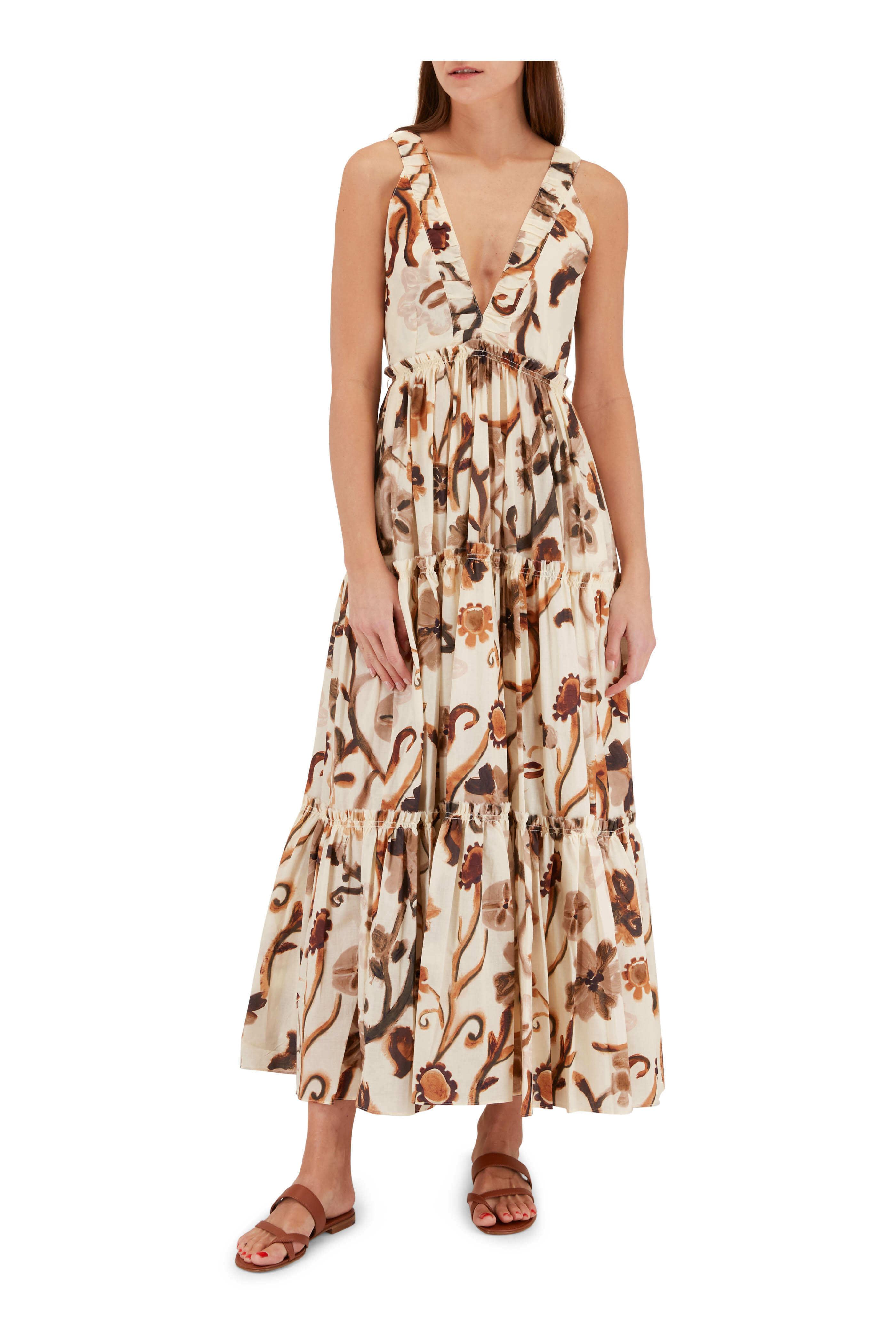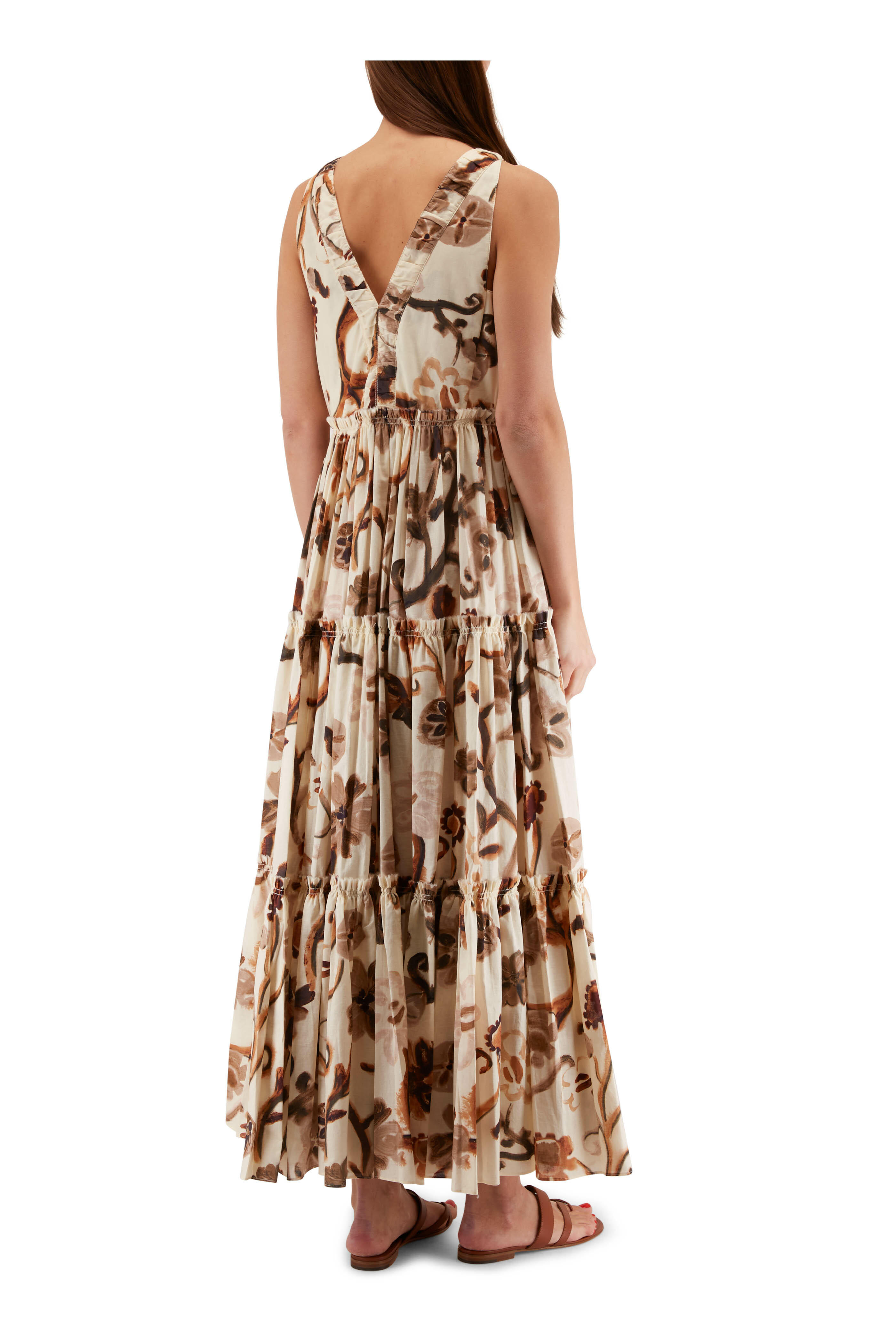 V-neckline; v-back. Concealed side zip. On-seam pockets. Tiered skirt. Imported. 54" shoulder to hem (size small). 100% cotton. Machine wash.