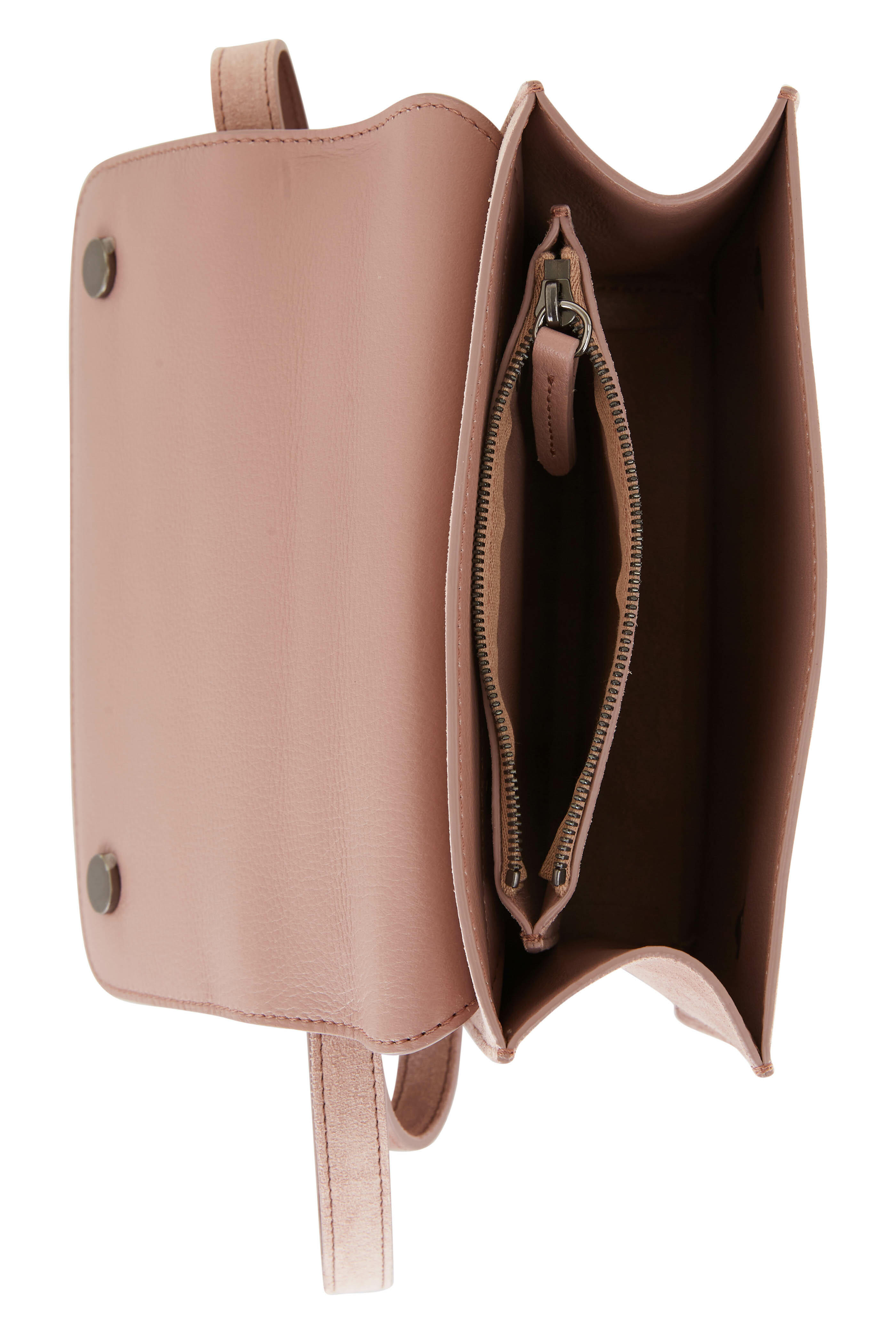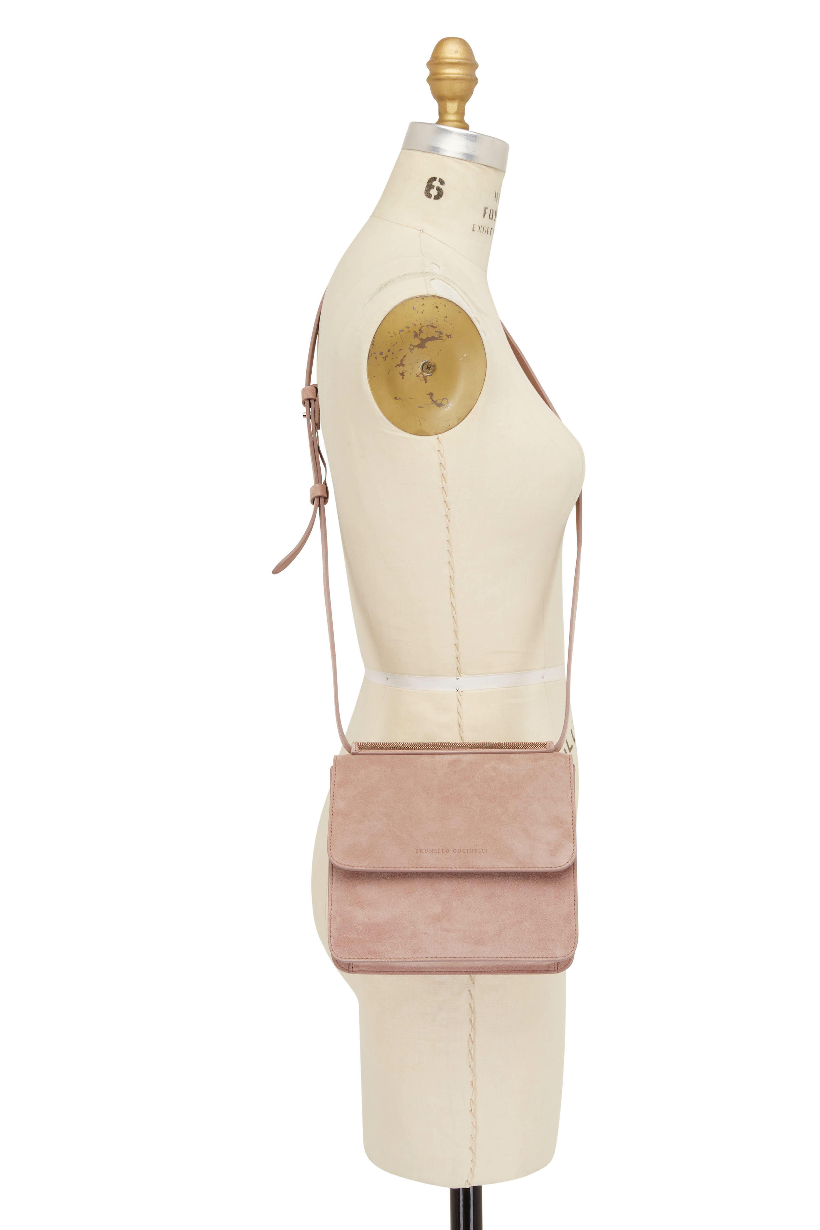 Suede. Front flap; magnetic snap closure. Adjustable shoulder strap. Interior zip pocket. Rose gold monili detailing. Made in Italy. 7½" width. 7" height. 2½" depth. 19" strap drop.