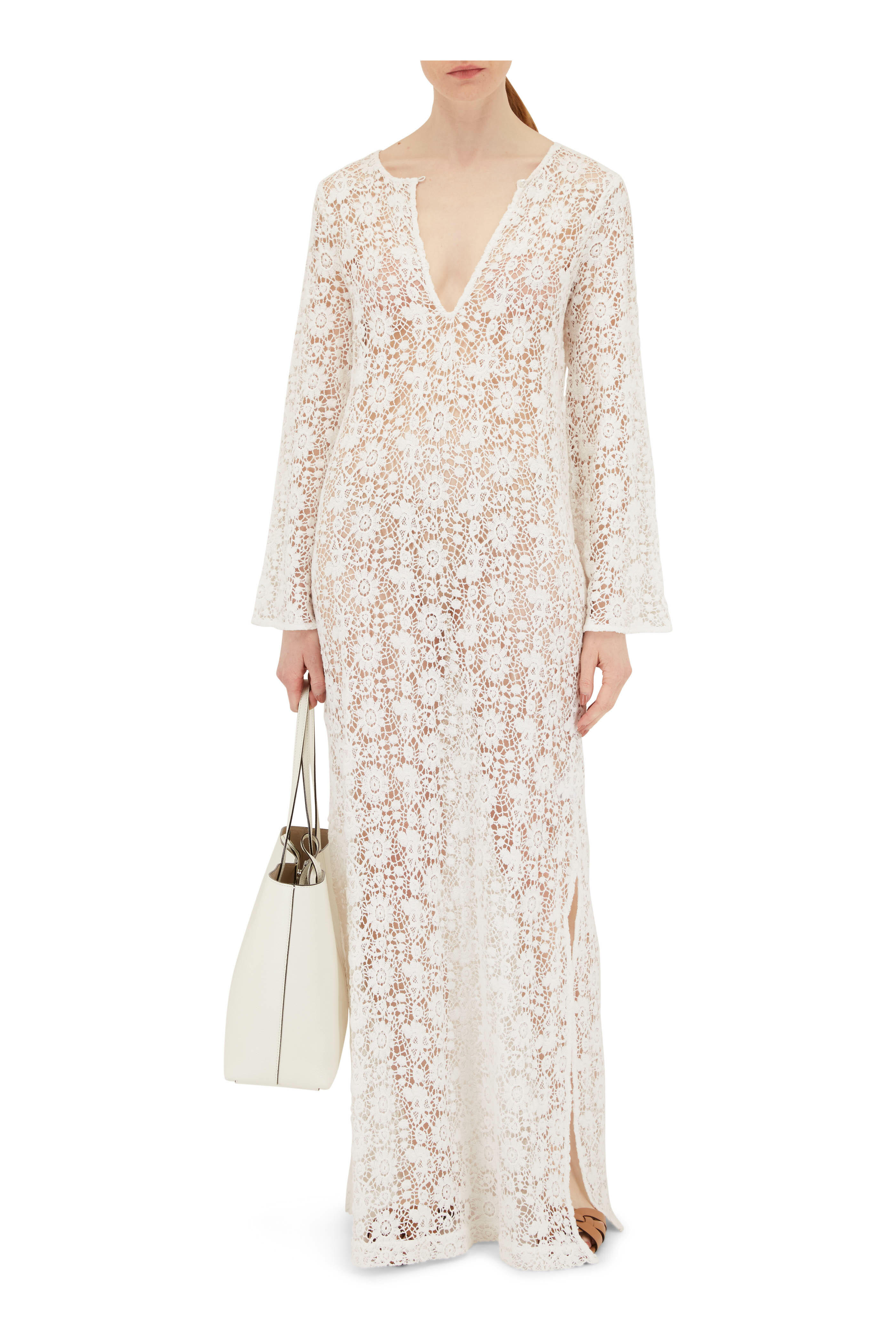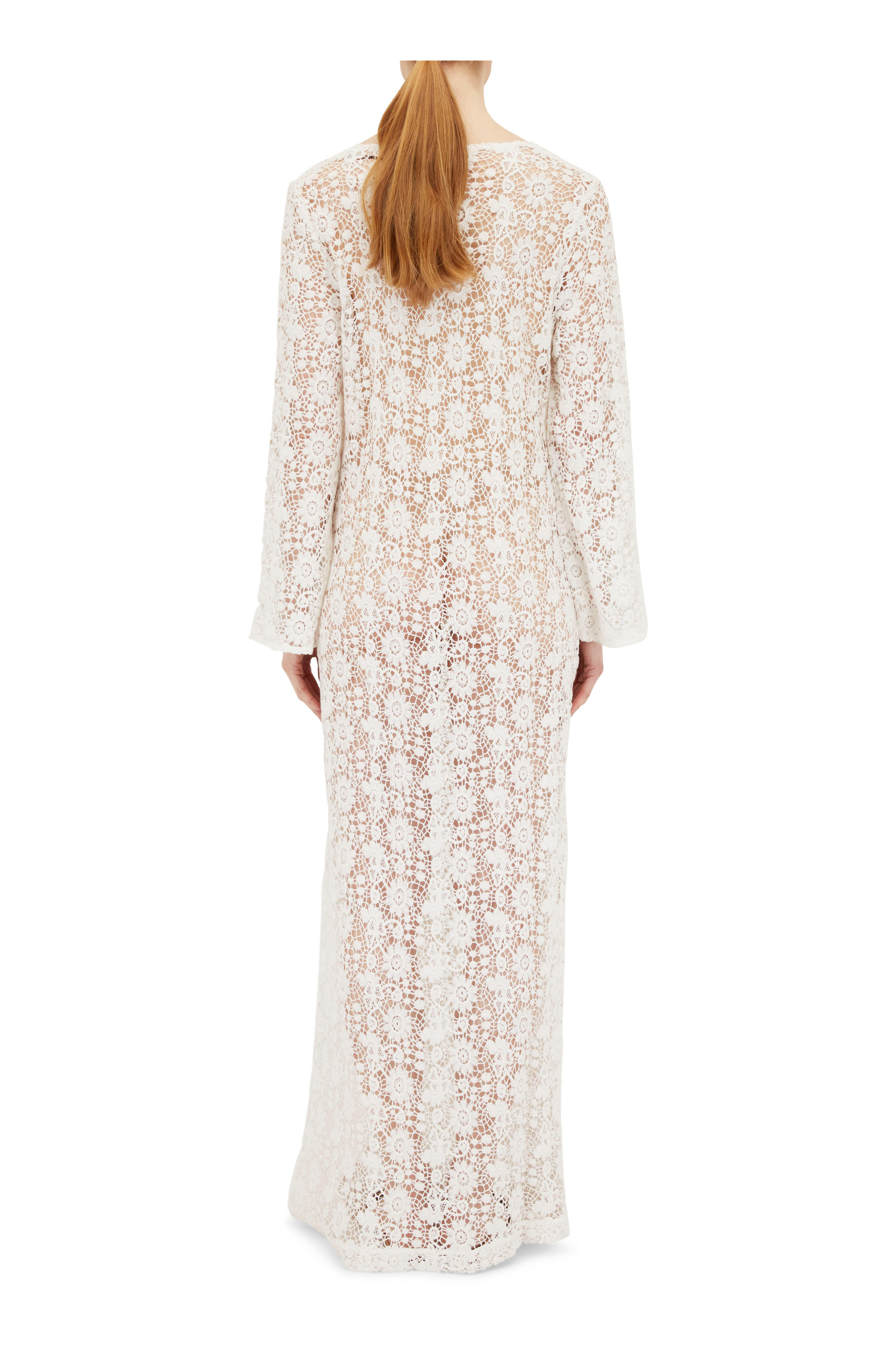 Round neck; keyhole front. Long sleeve. Pull over style. Side slits. Imported. About 57" shoulder to hem. 100% cotton; unlined. Dry clean.