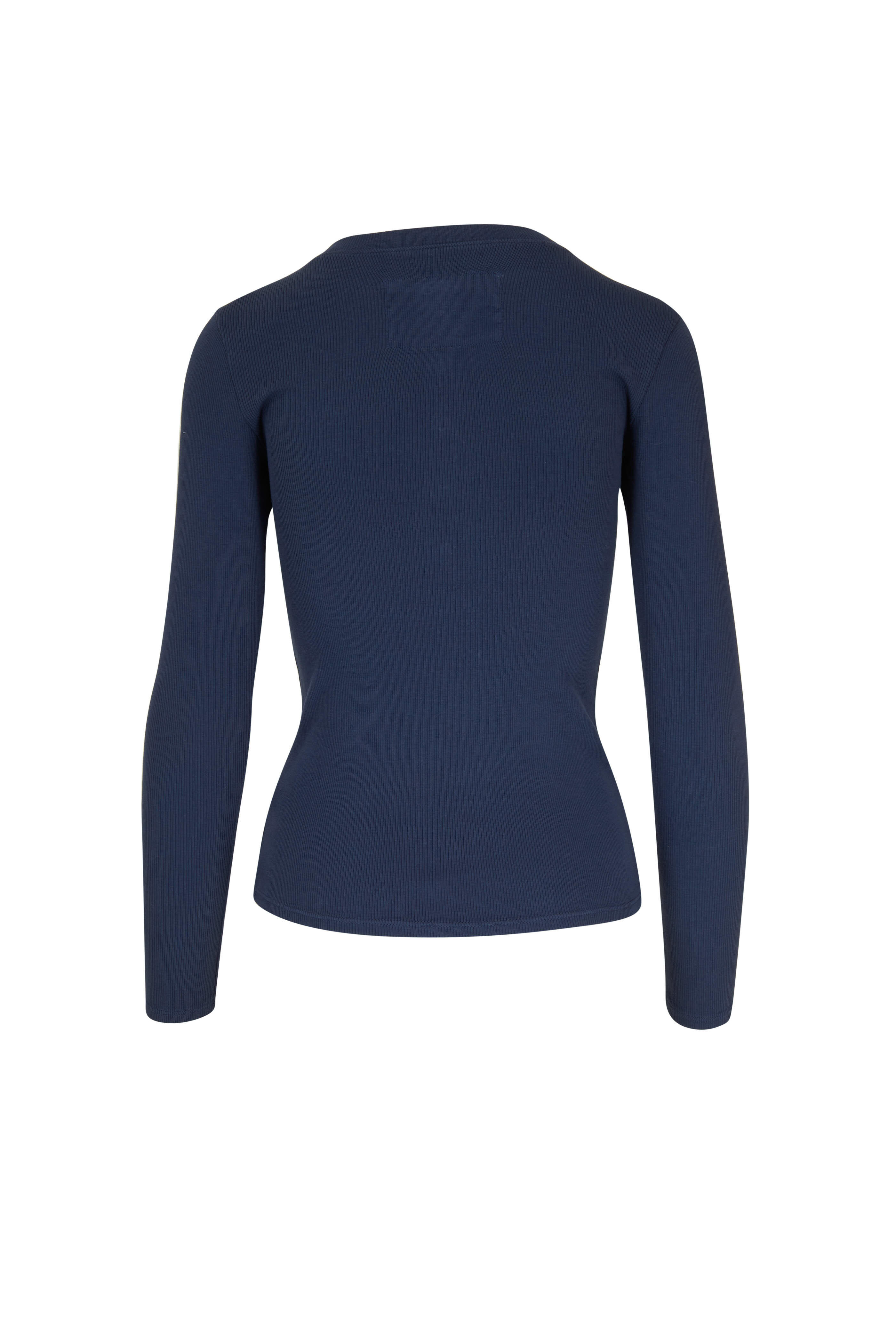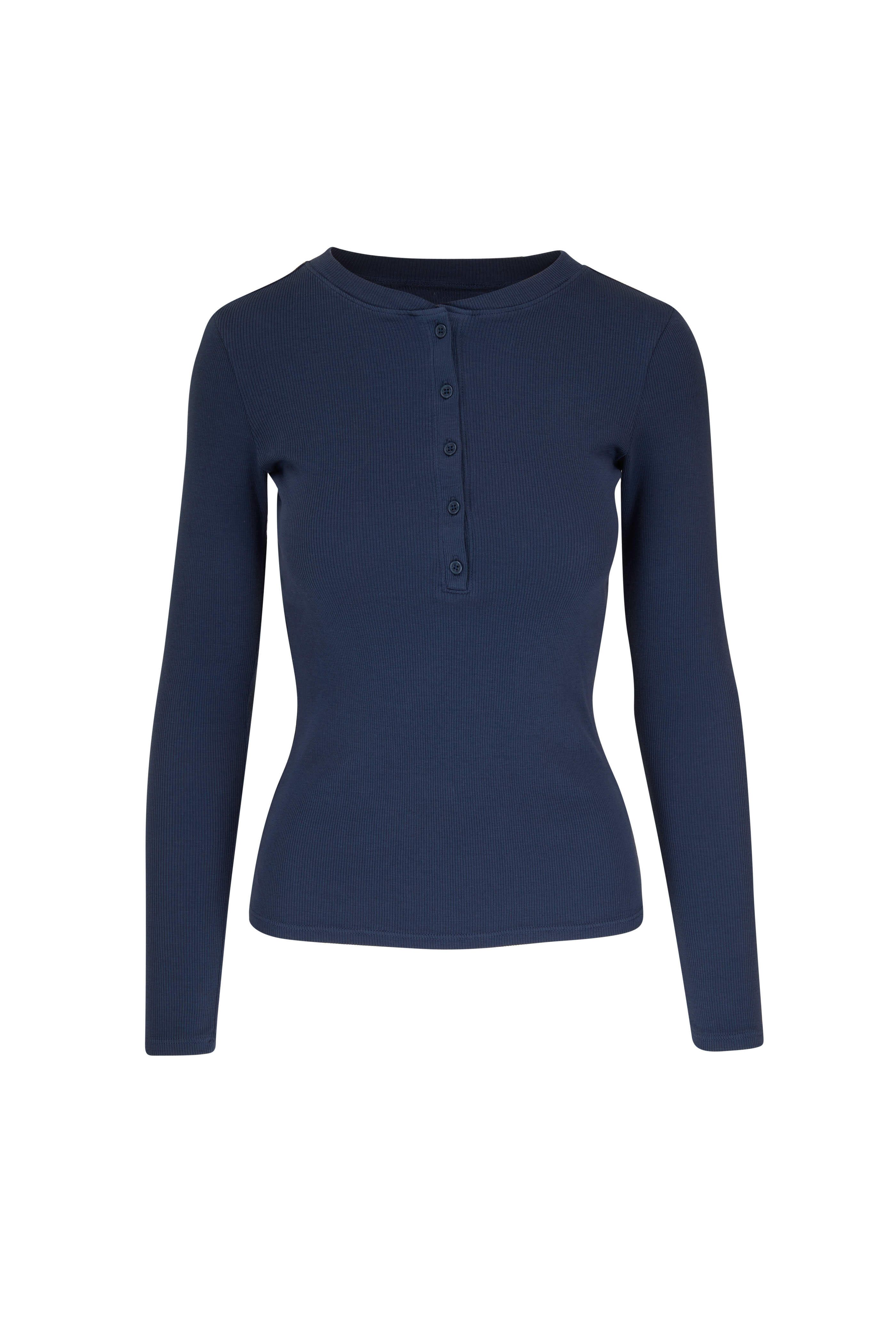Five button henley neckline. Ribbed. Made in the USA. 100% cotton. Machine wash.
