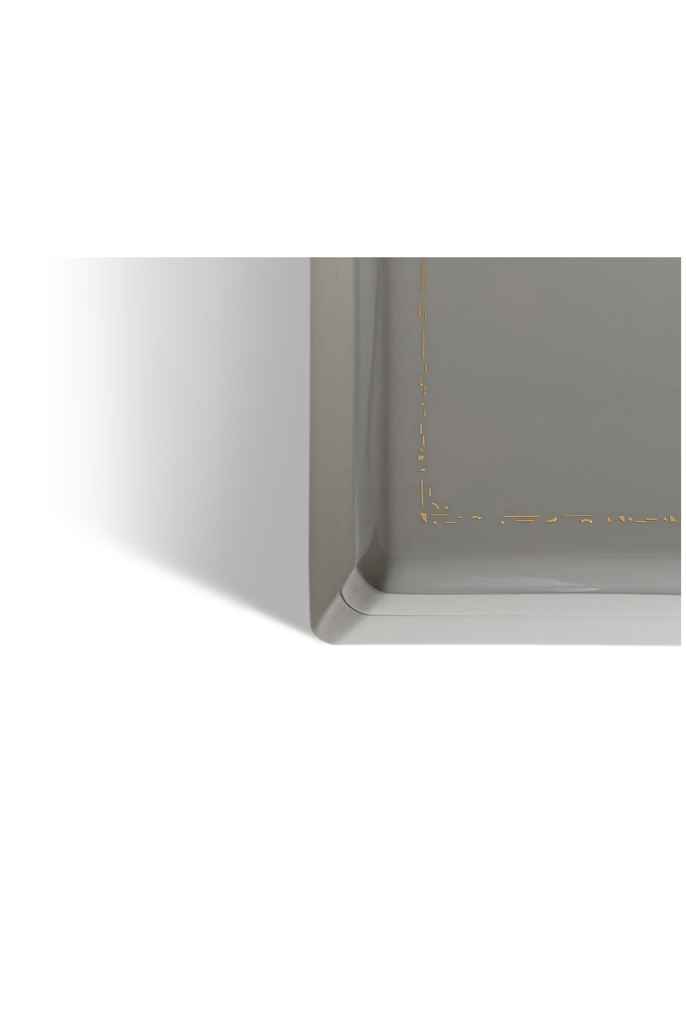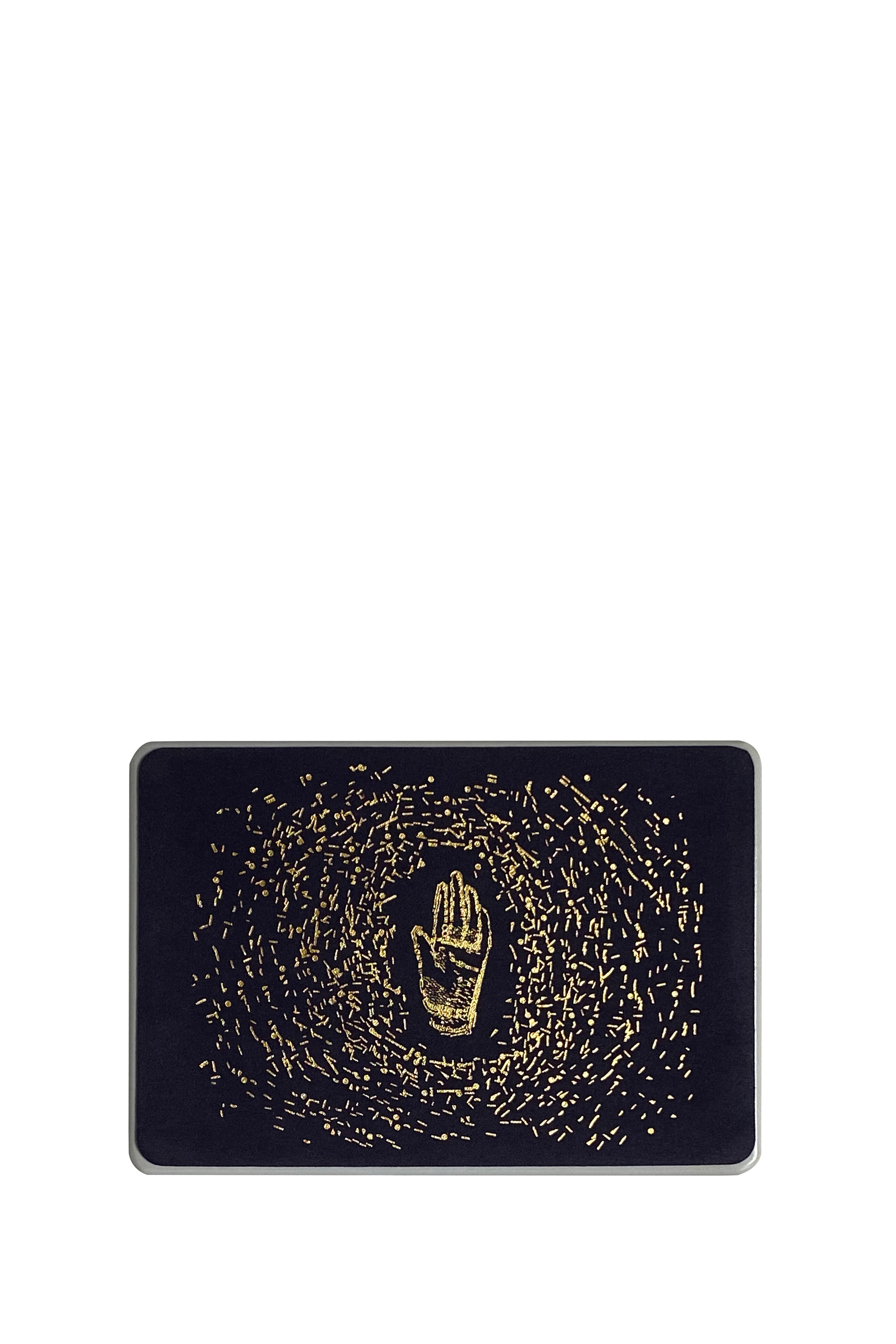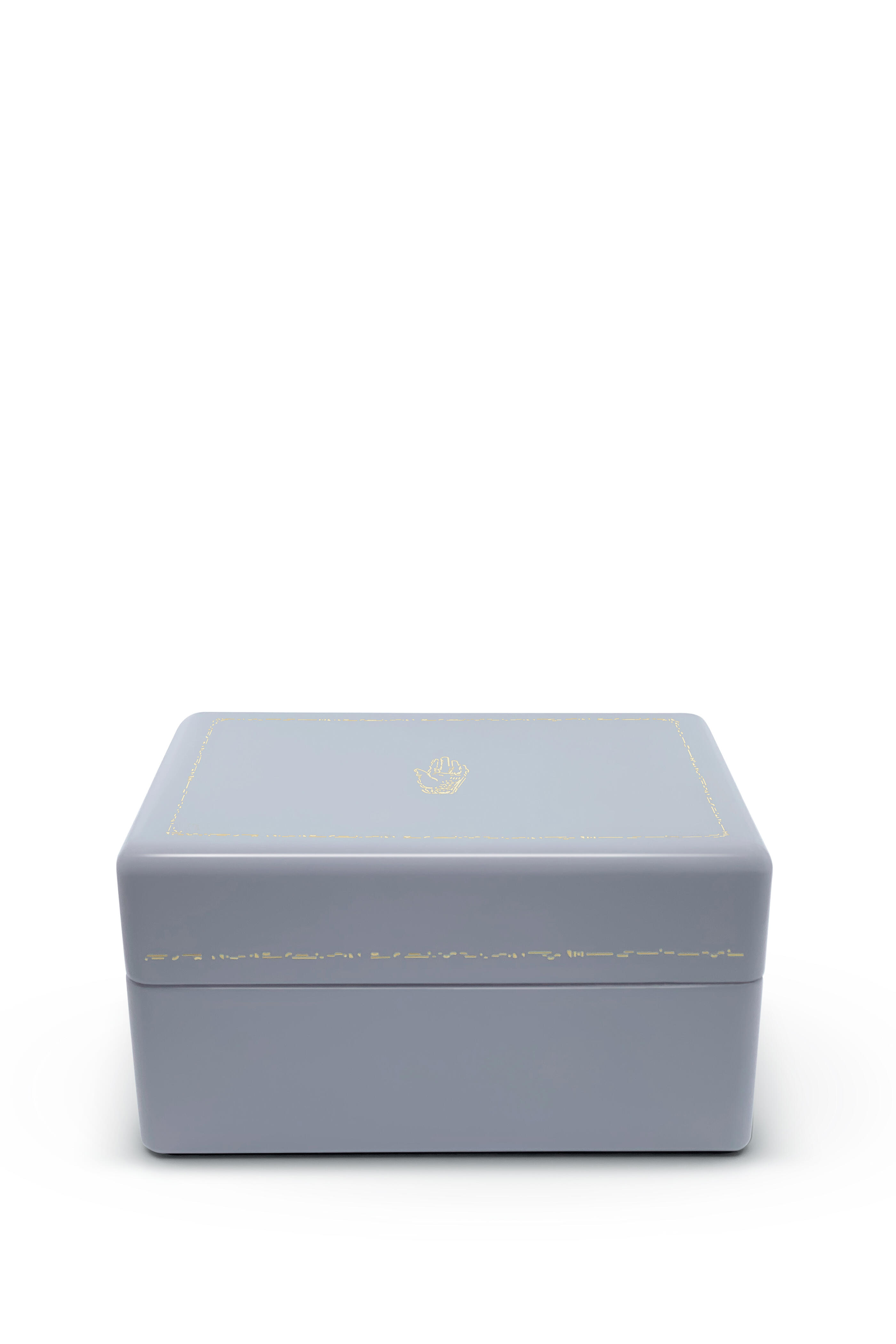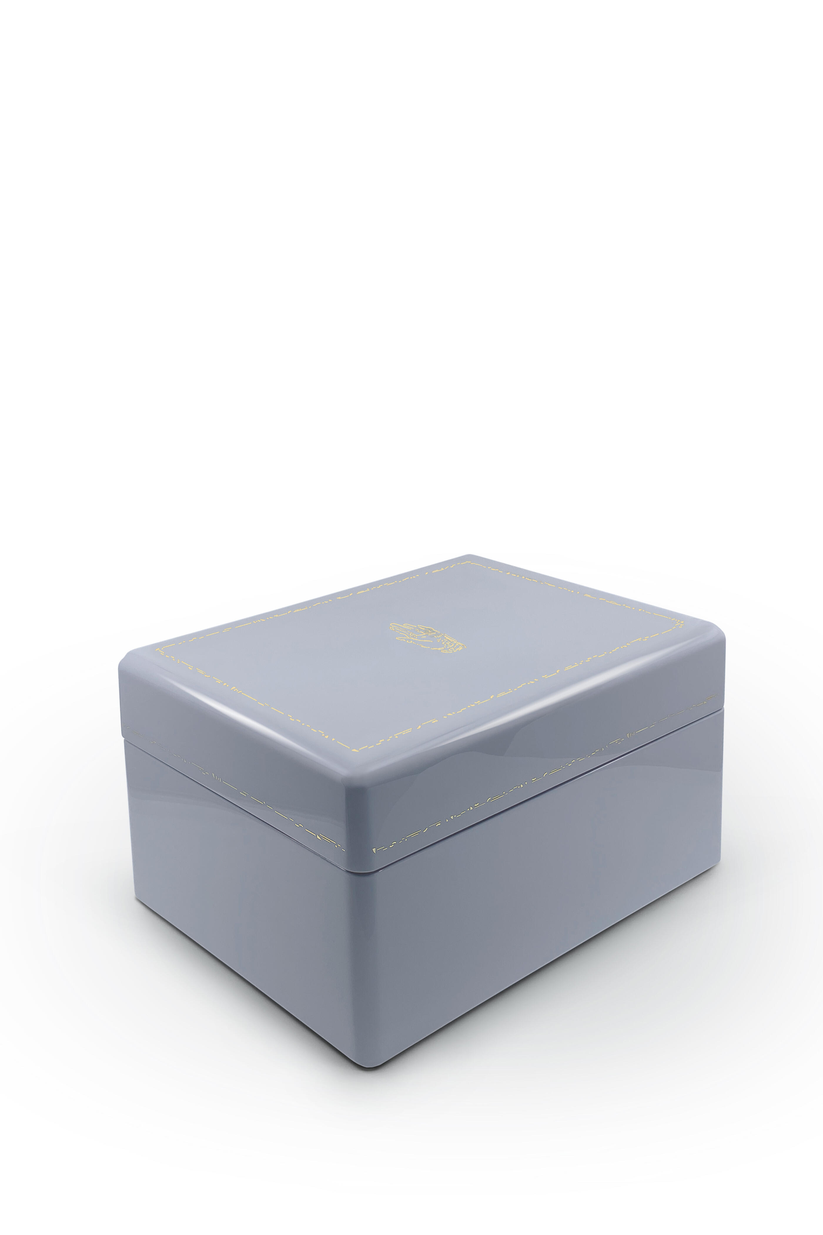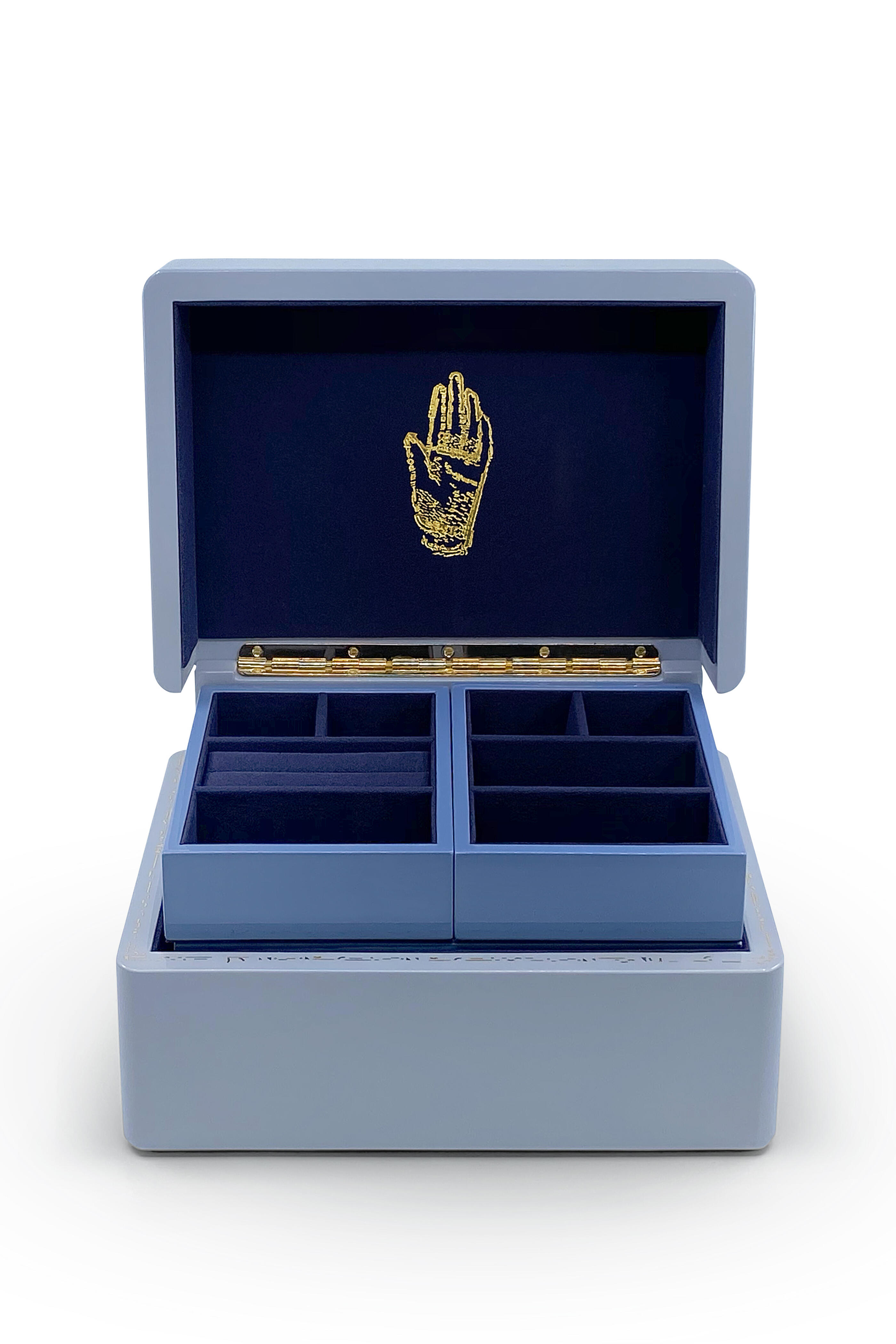 Wood with high lacquer finish. 3 levels of storage. Features delicate gold effect inlay. Brass plated hardware. Faux suede interior. 10.2" wide. 6.8" deep. 5.1" high.