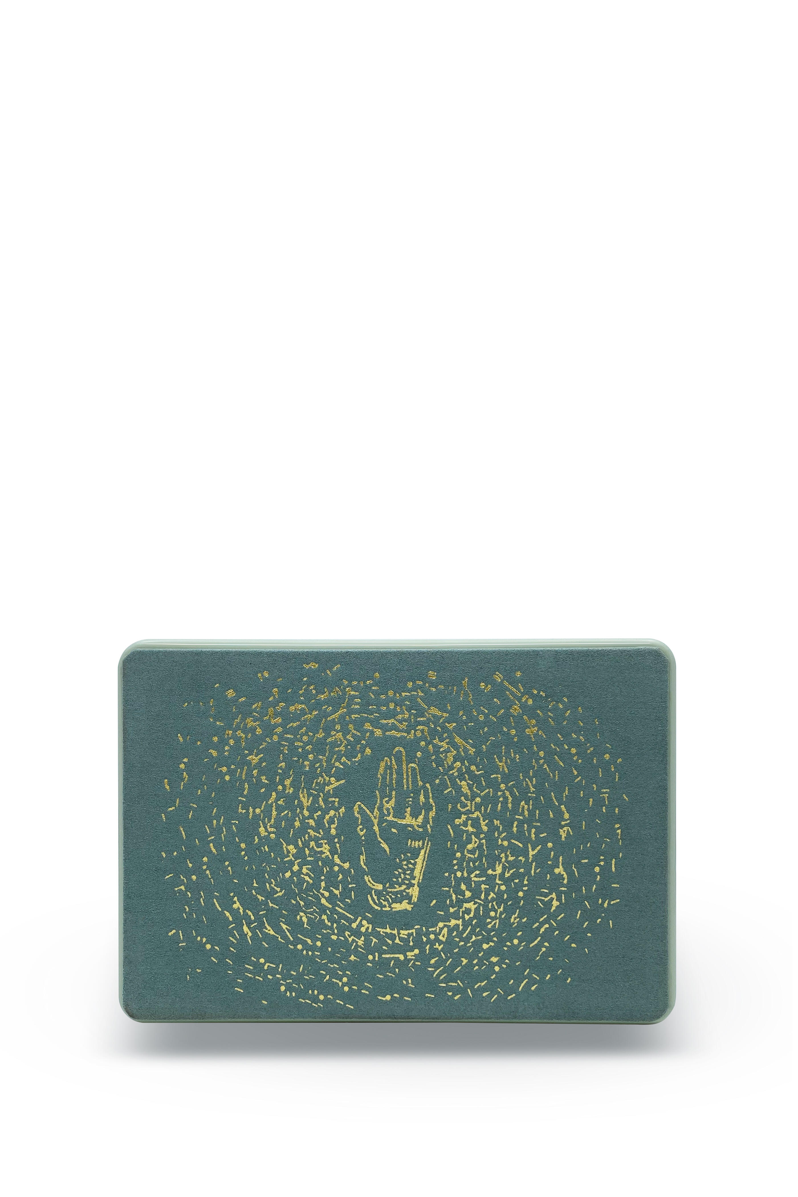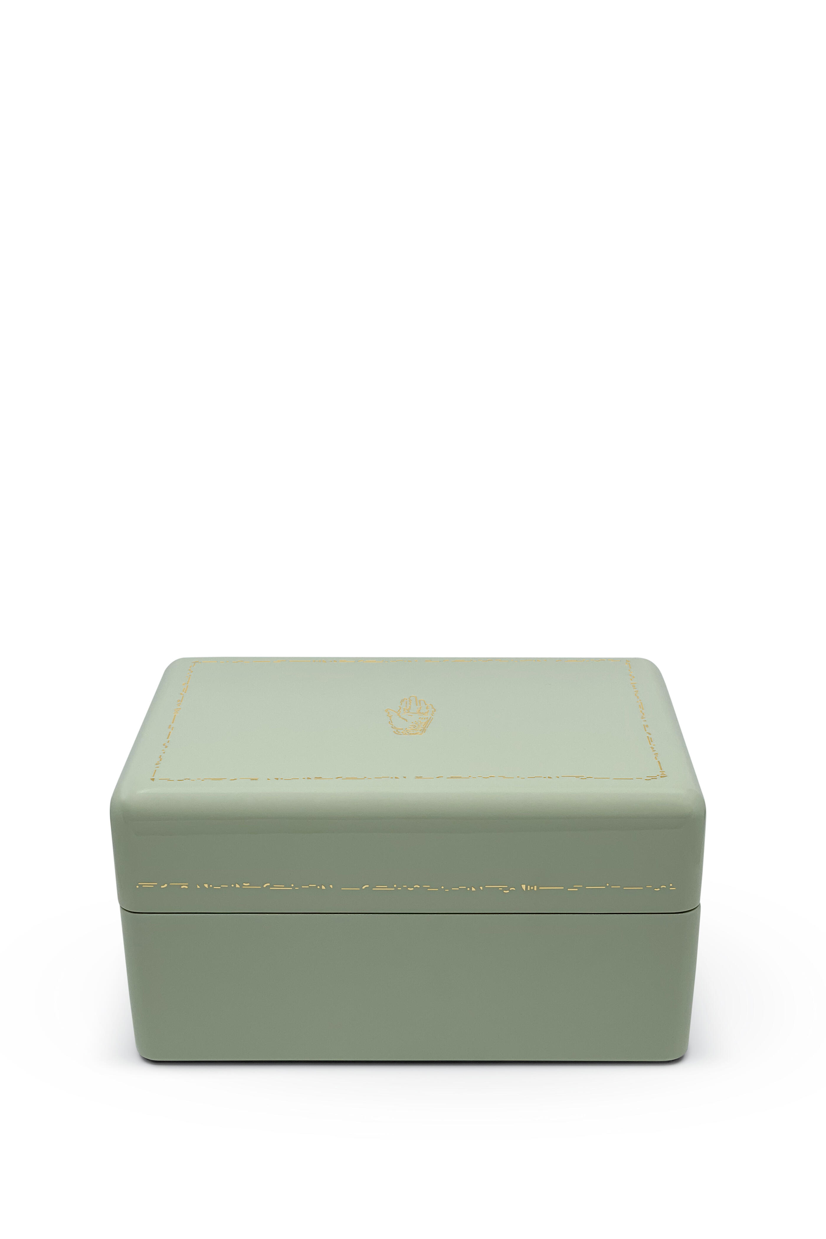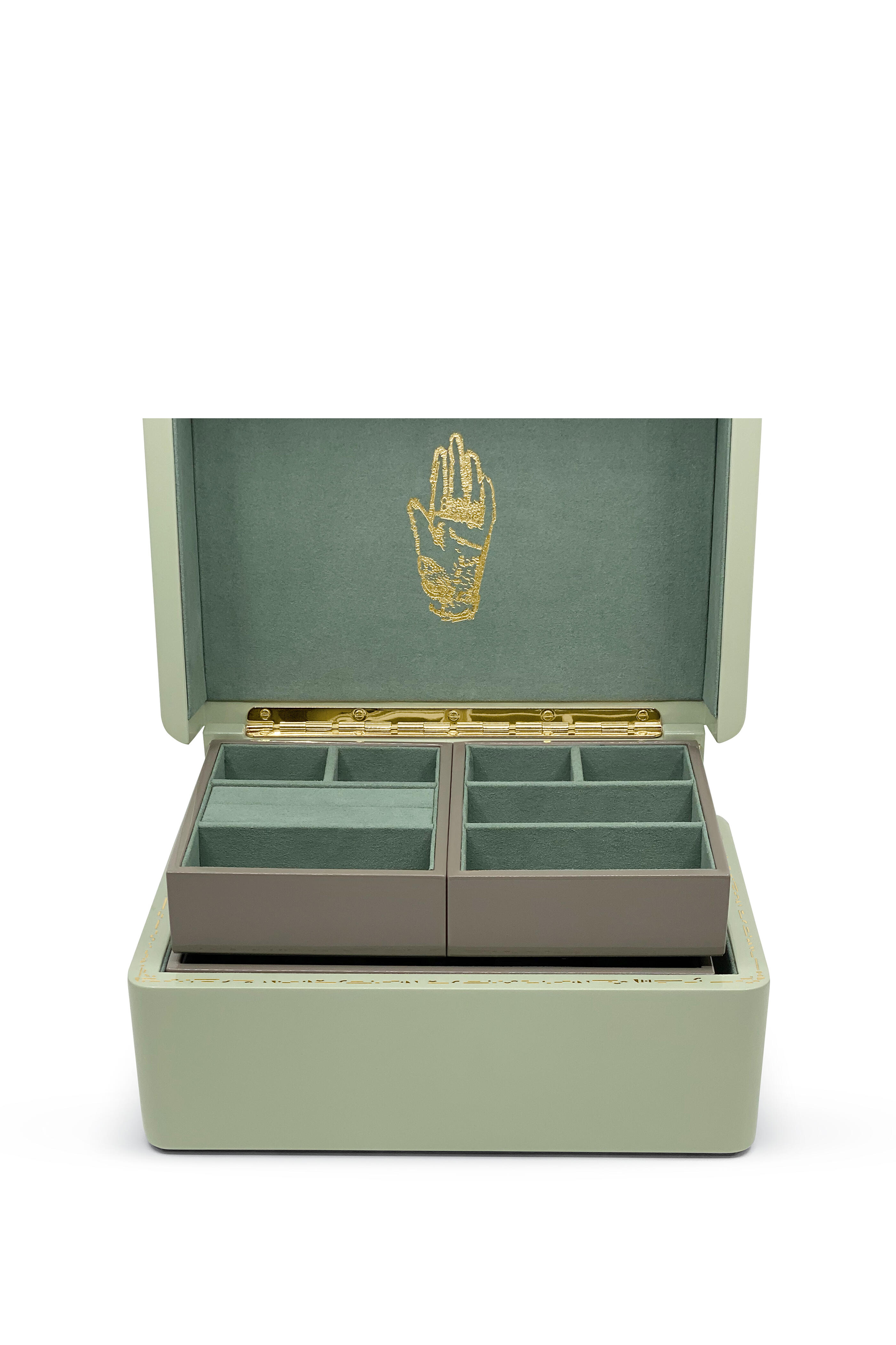 Wood with high lacquer finish. 3 levels of storage. Features delicate gold effect inlay. Brass plated hardware. Faux suede interior. 10.2" wide. 6.8" deep. 5.1" high.