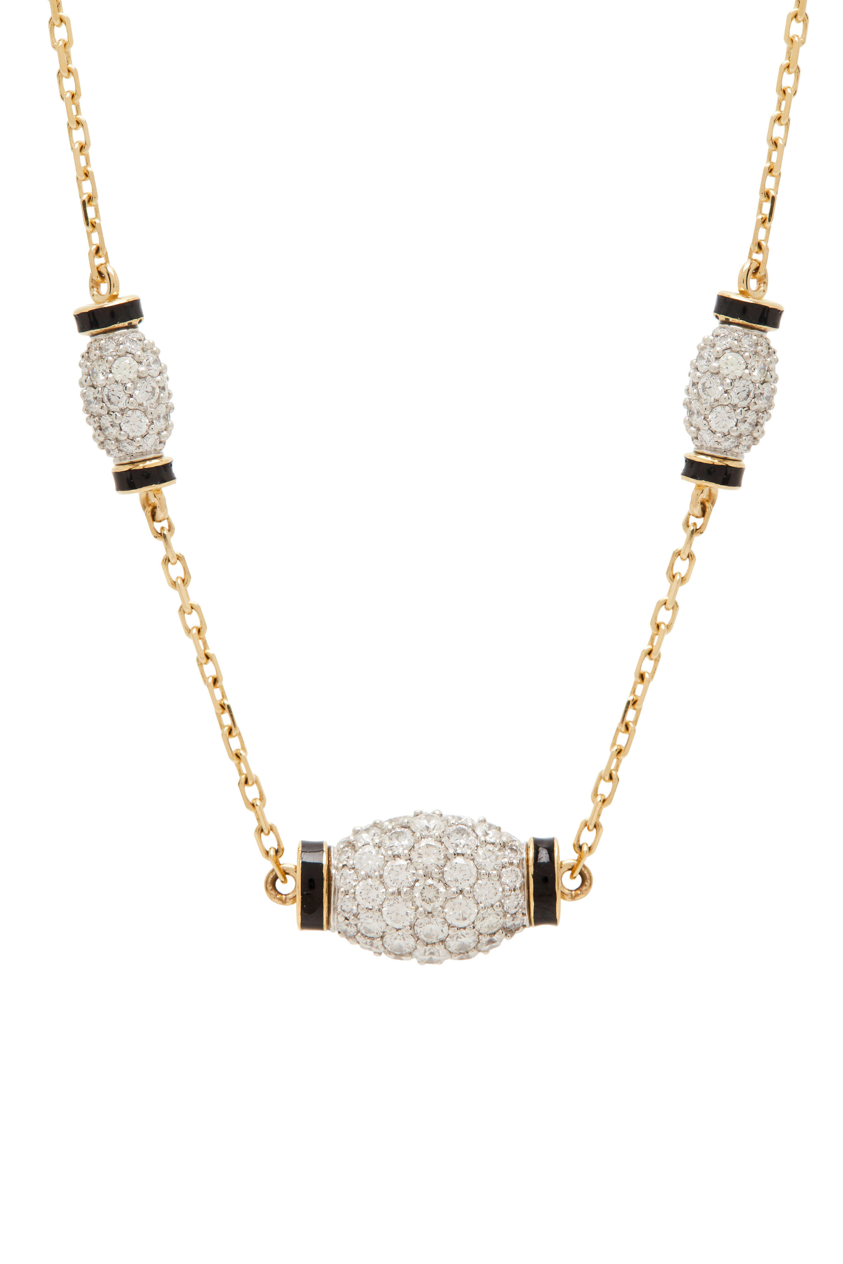 18k yellow gold. Platinum. 2.63 carat diamonds. Black enamel.