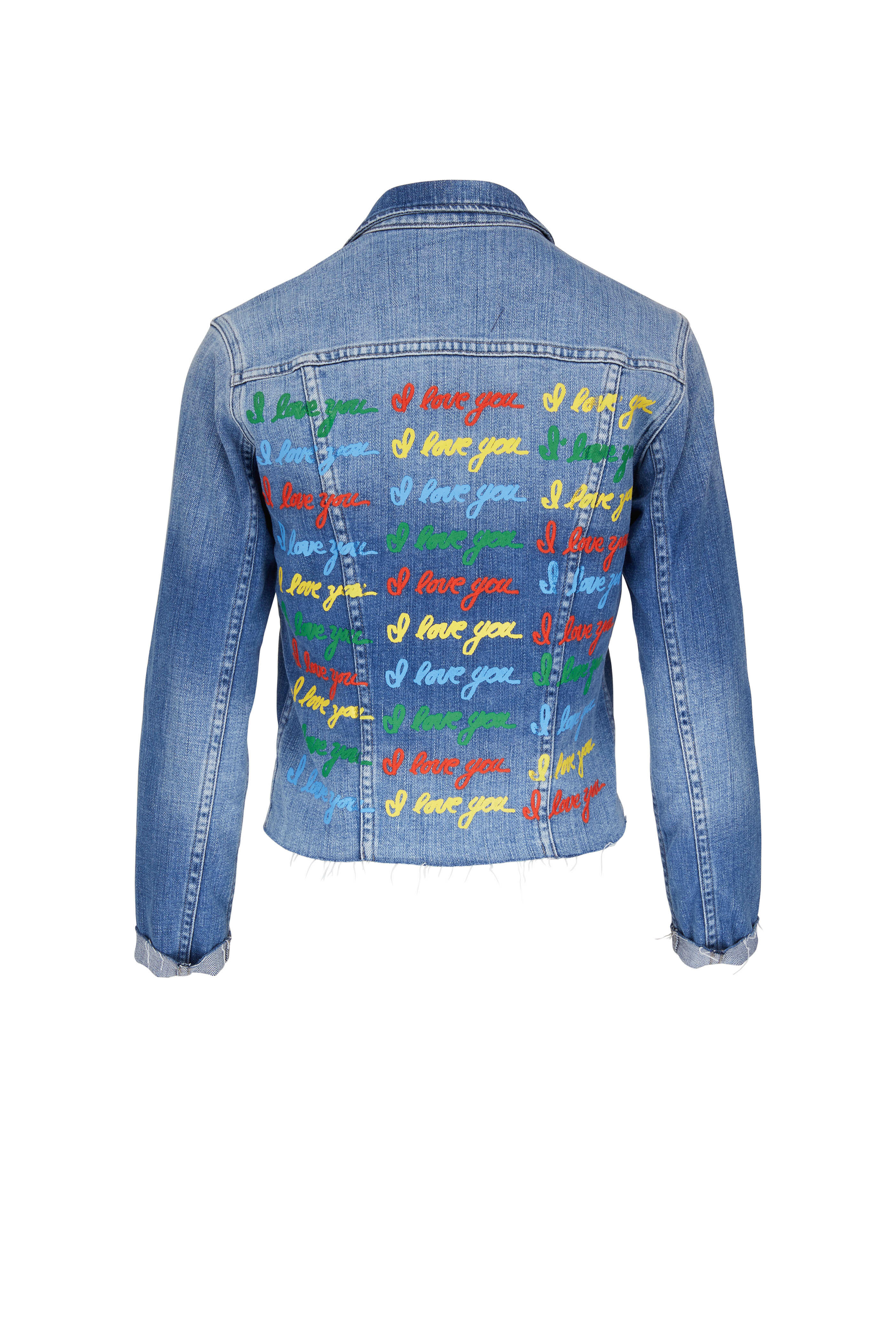 Spread collar. Front button closure. Chest patch pockets, lower slip pockets. Raw edge hem and cuffs. Embroidered "I love you" at back. Made in the USA. Color: Lancaster I Love You. Slim fit. 94% cotton, 5% polyester, 1% spandex. Machine wash.
