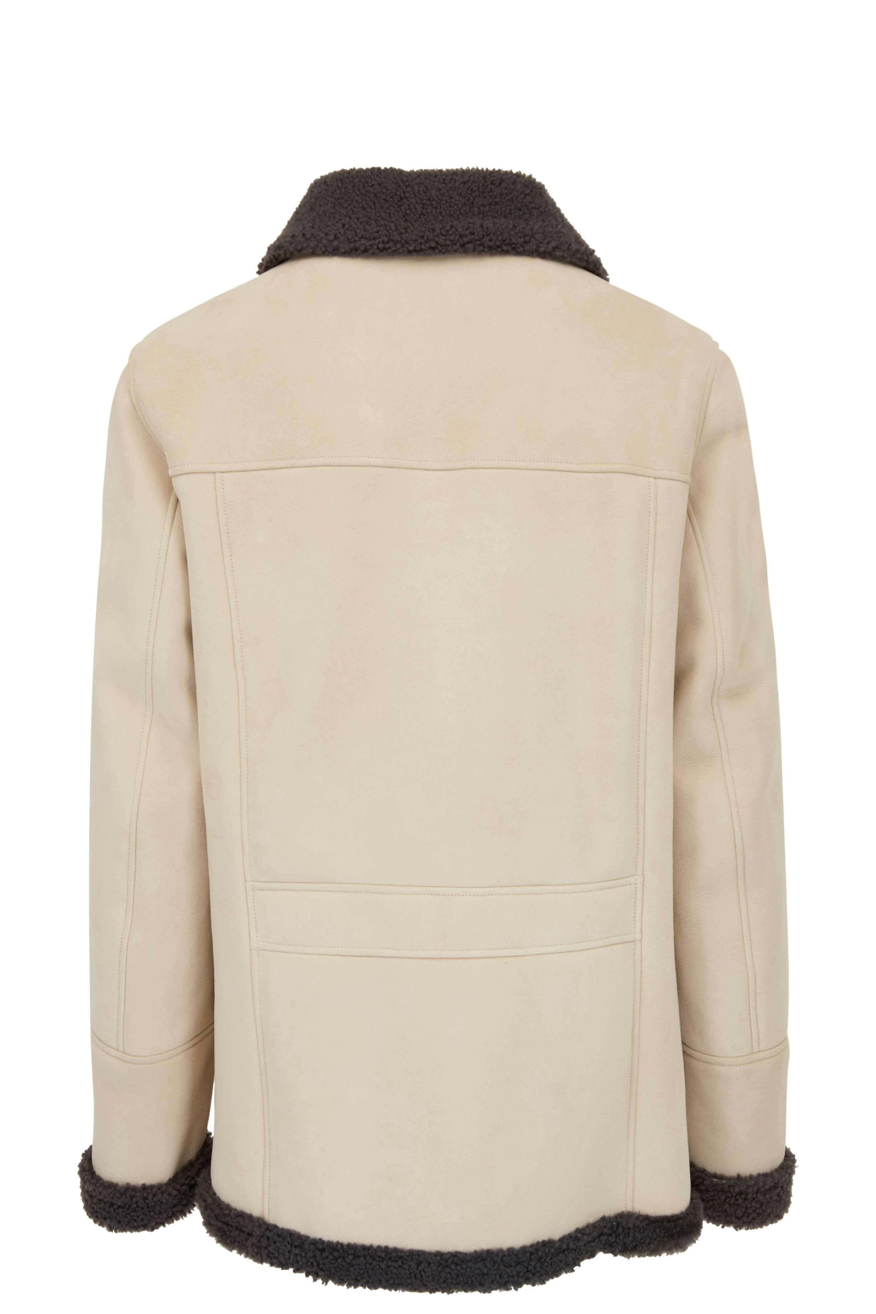 Speicalist clean. Spread collar. Button down placket. Lower button pockets with side entry; chest patch pockets. Made in Italy. 100% lambskin; shearling lining.
