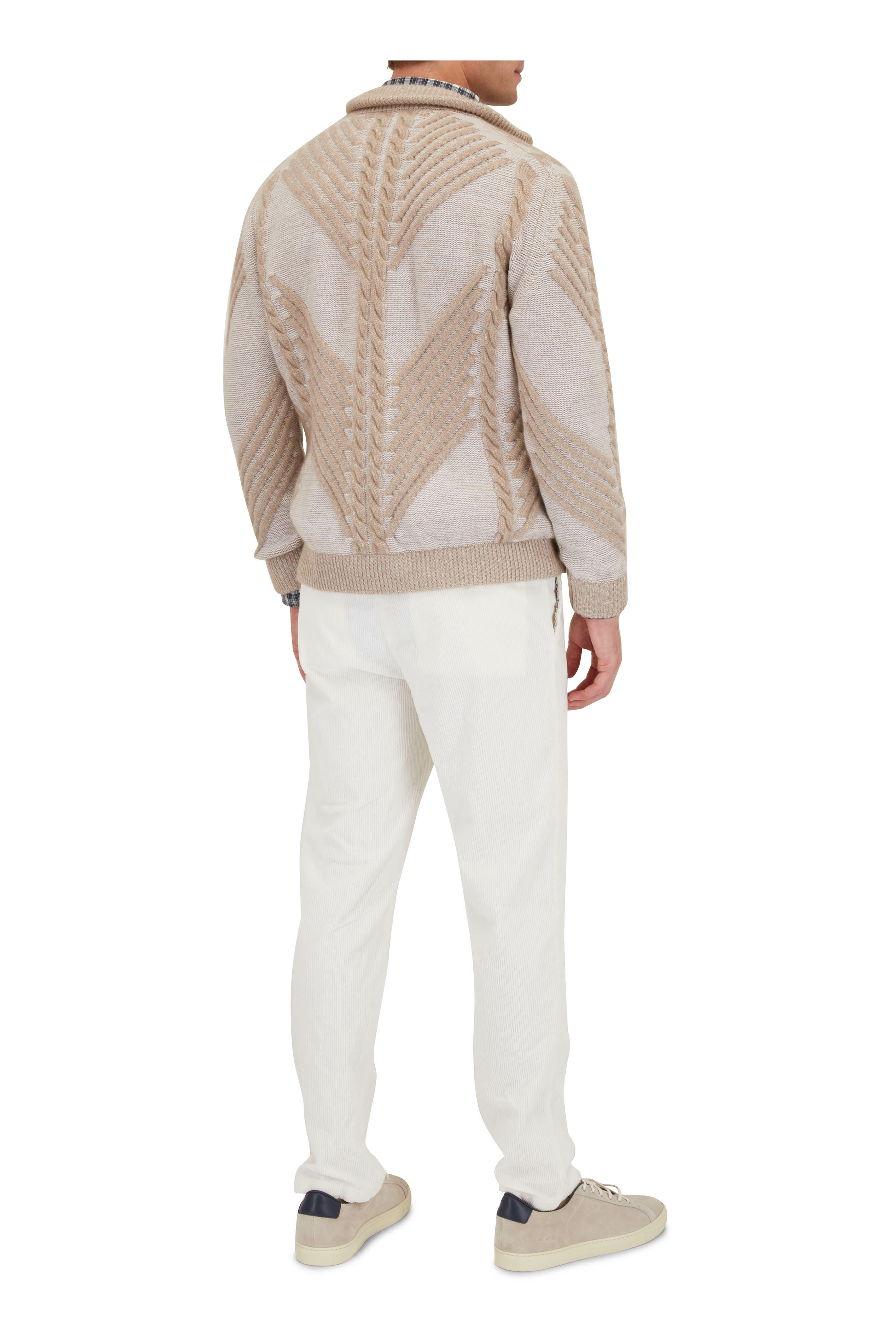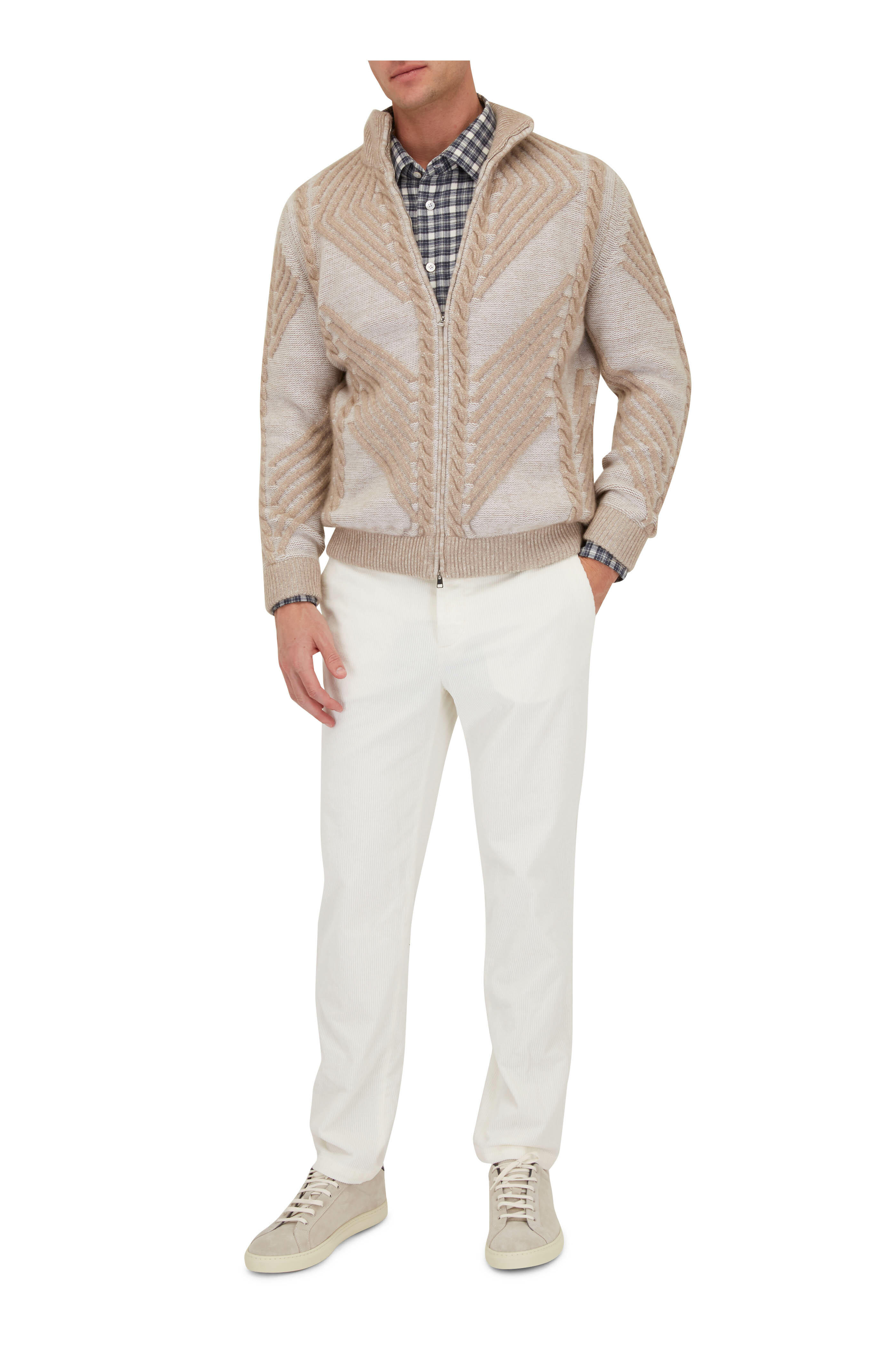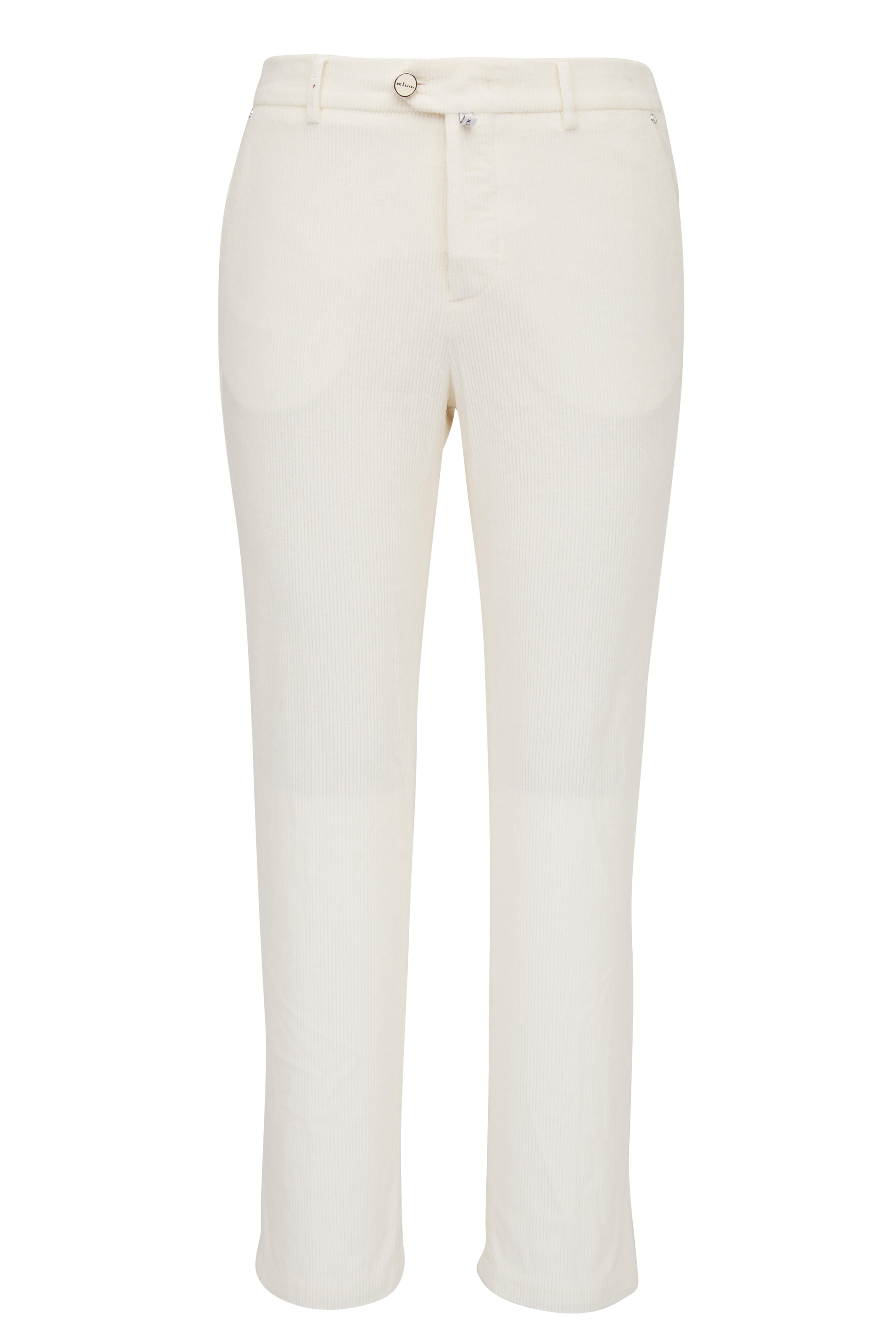 Banded waist. Button down fly. Side slip pockets. Back besom pockets. Made in Italy. 30" inseam. 91% cotton, 7% cashmere, 2% elastane. Dry clean.