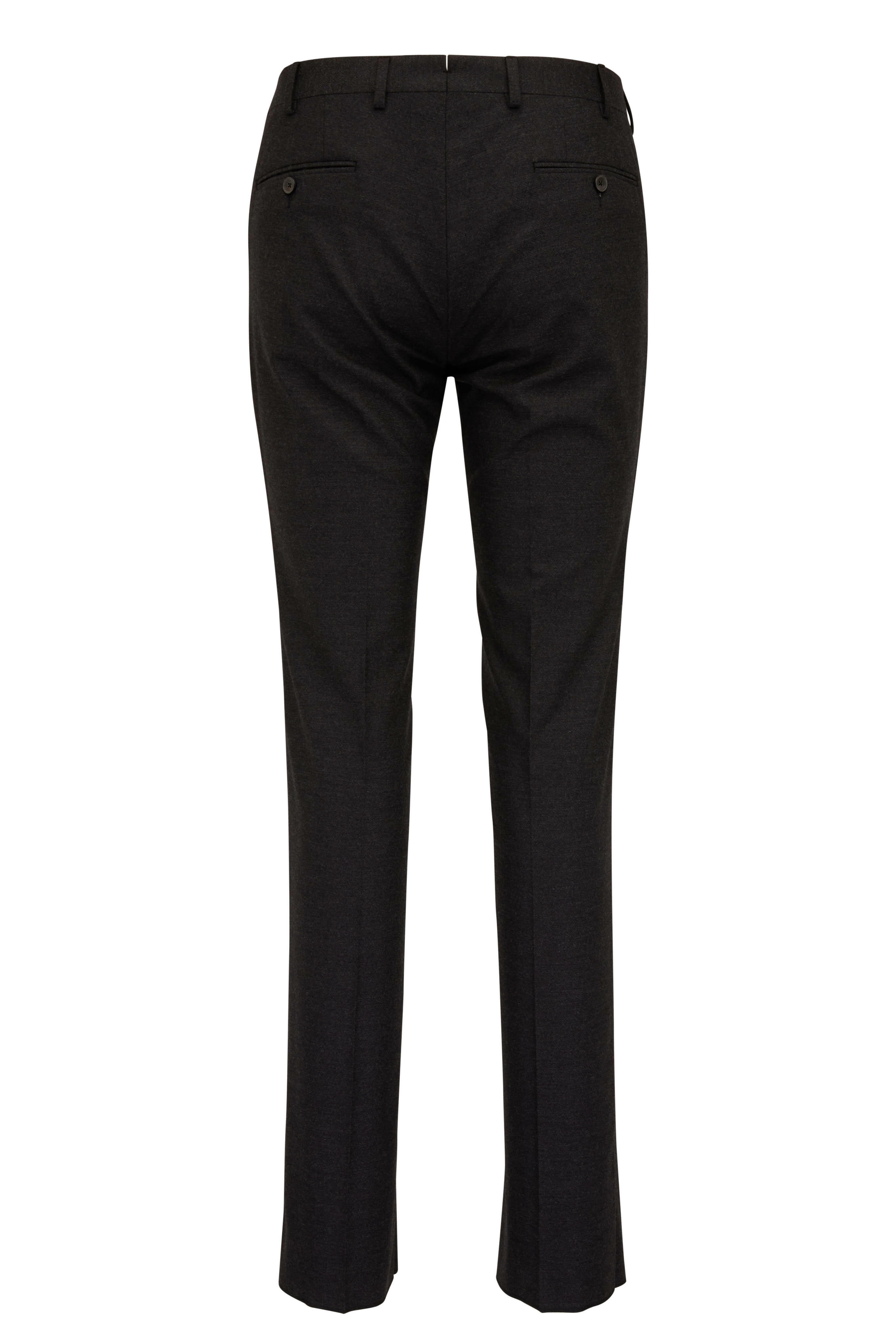 Zip fly with double button tab. Belt loops; banded waist. Side slip pockets; back besom pockets. Made in Italy. 34" inseam. 96% cashmere, 4% elastane. Dry clean.