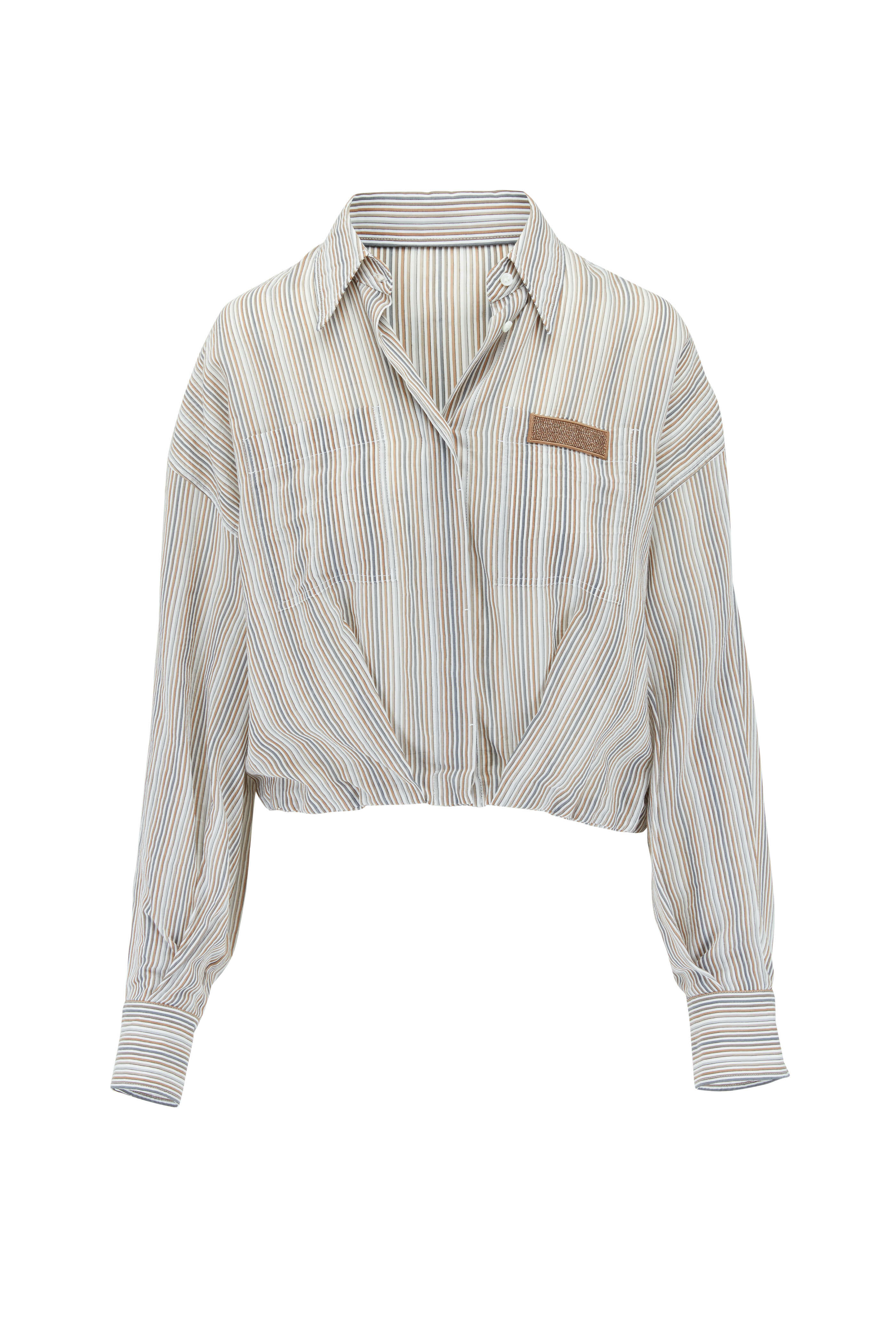 Cotton/silk. Spread collar. Concealed button placket. Button cuffs. Gathered hem. Made in Italy. Dry clean.