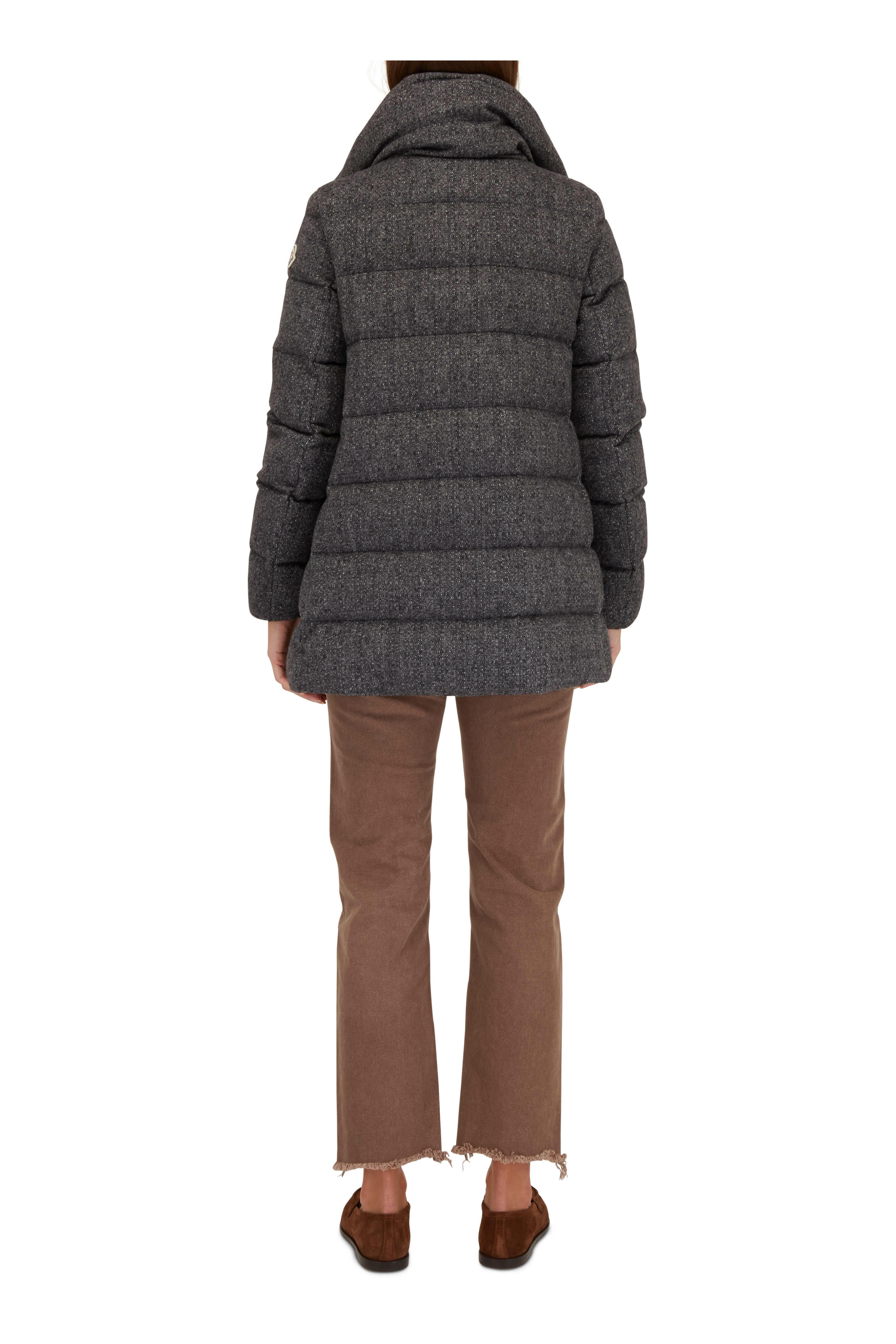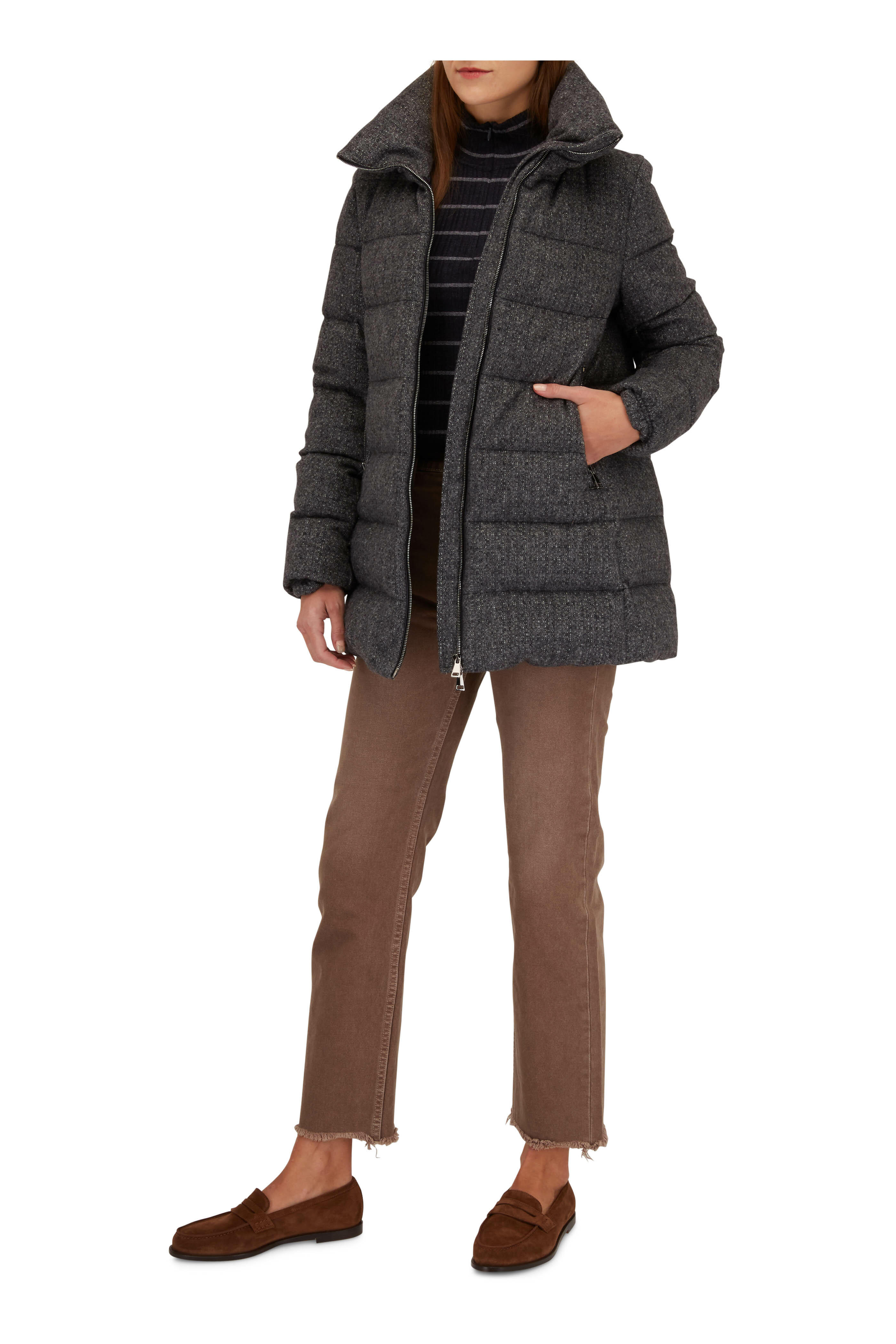 Stand collar. Two way zip placket. Side zip pockets. Elasticized cuffs. Straight hem. Imported. 80% virgin wool, 20% cashmere; lining: 100% polyamide; Padding; 90% down, 10% feather. Dry clean.