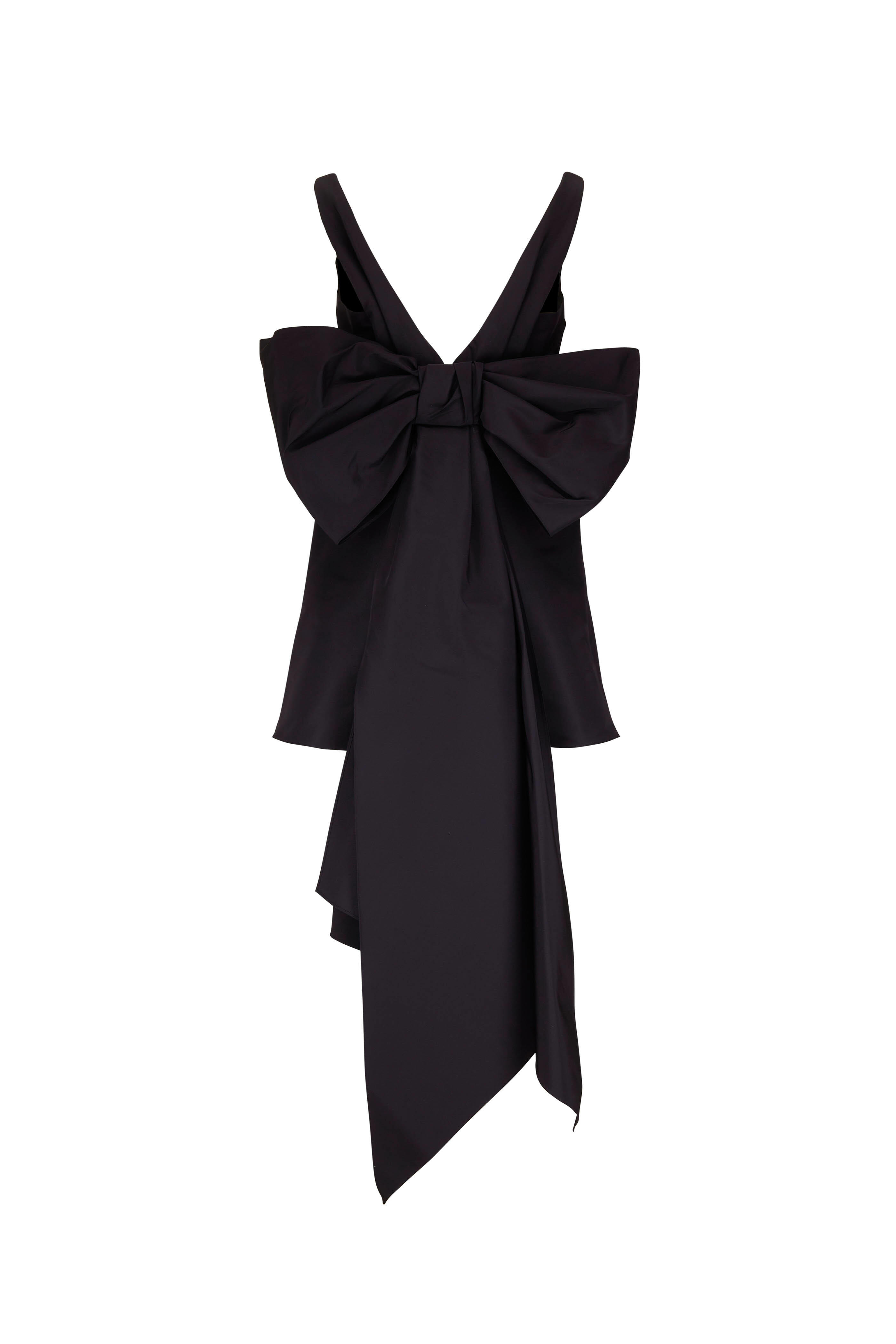 V-neckline. Back zip. Dramatic bow in back. Made in the USA. 34" shoulder to hem. 100% silk; lined. Dry clean.