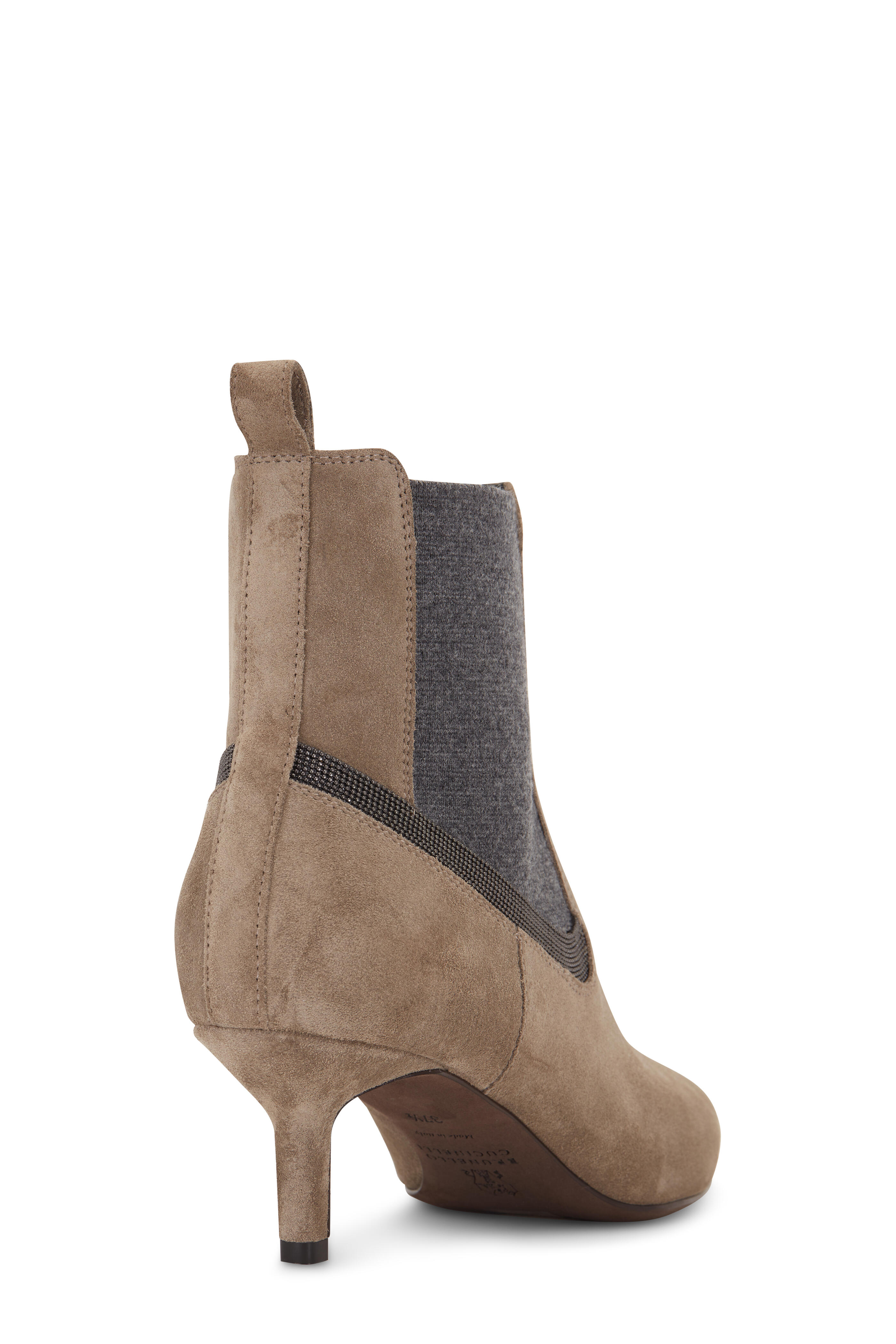 Suede upper. Pointed toe. Ribbed cashmere side gores. Monili trim detailing. Back pull tab. Unlined; leather insole. Leather and rubber sole. Made in Italy. Heel measurement: approx. 2".