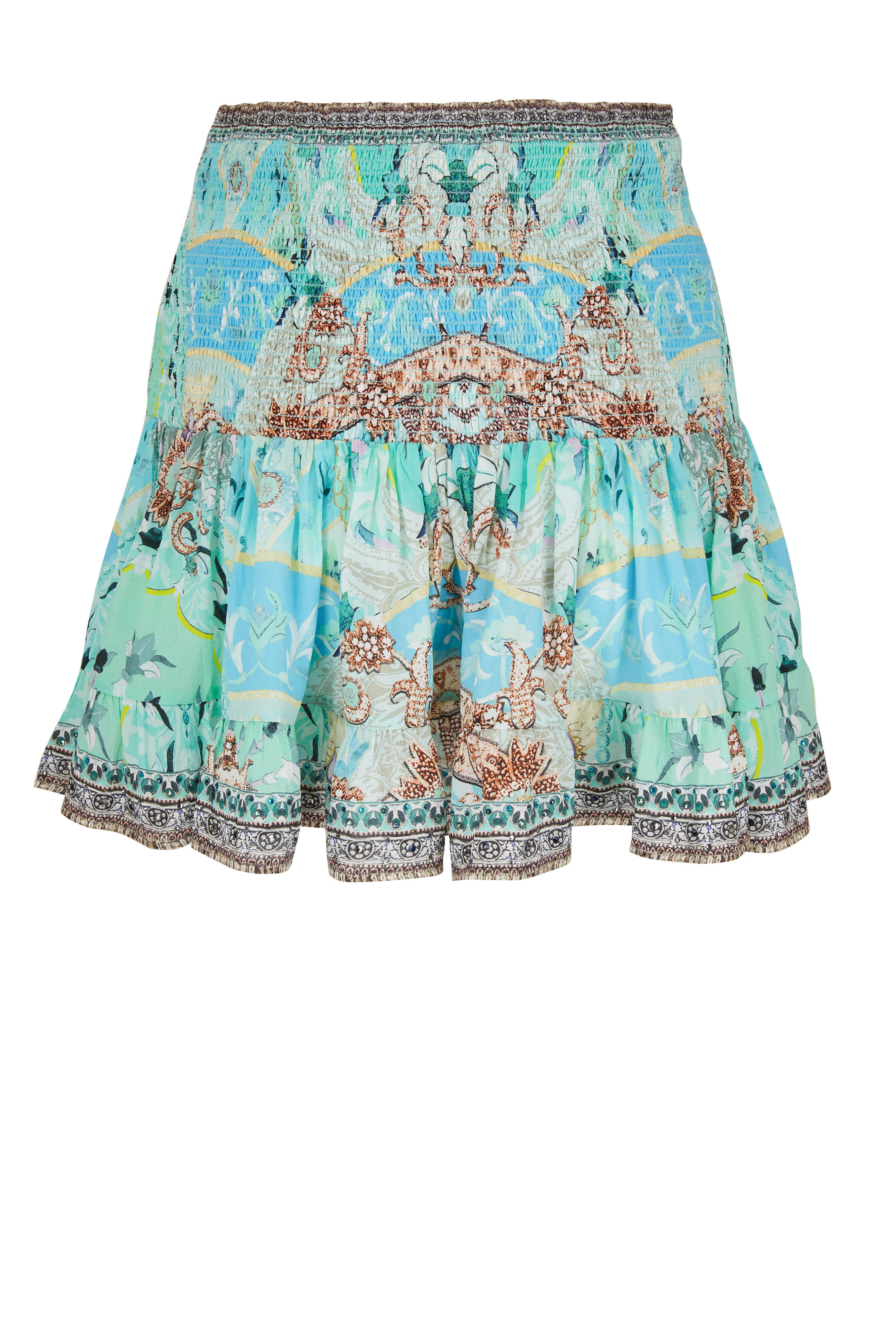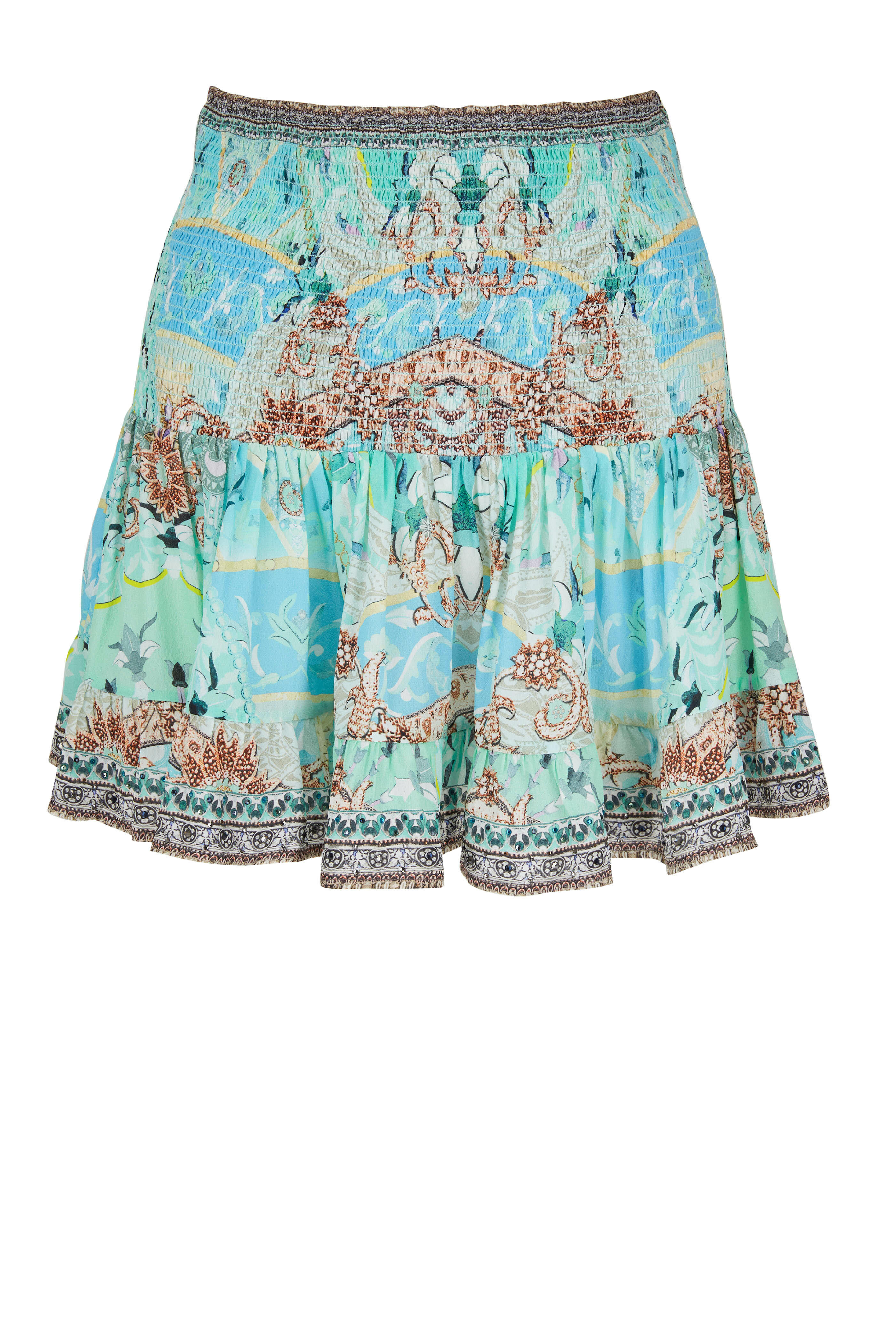Shirred waistline. Slip on style. Imported. 100% silk. Dry clean.
