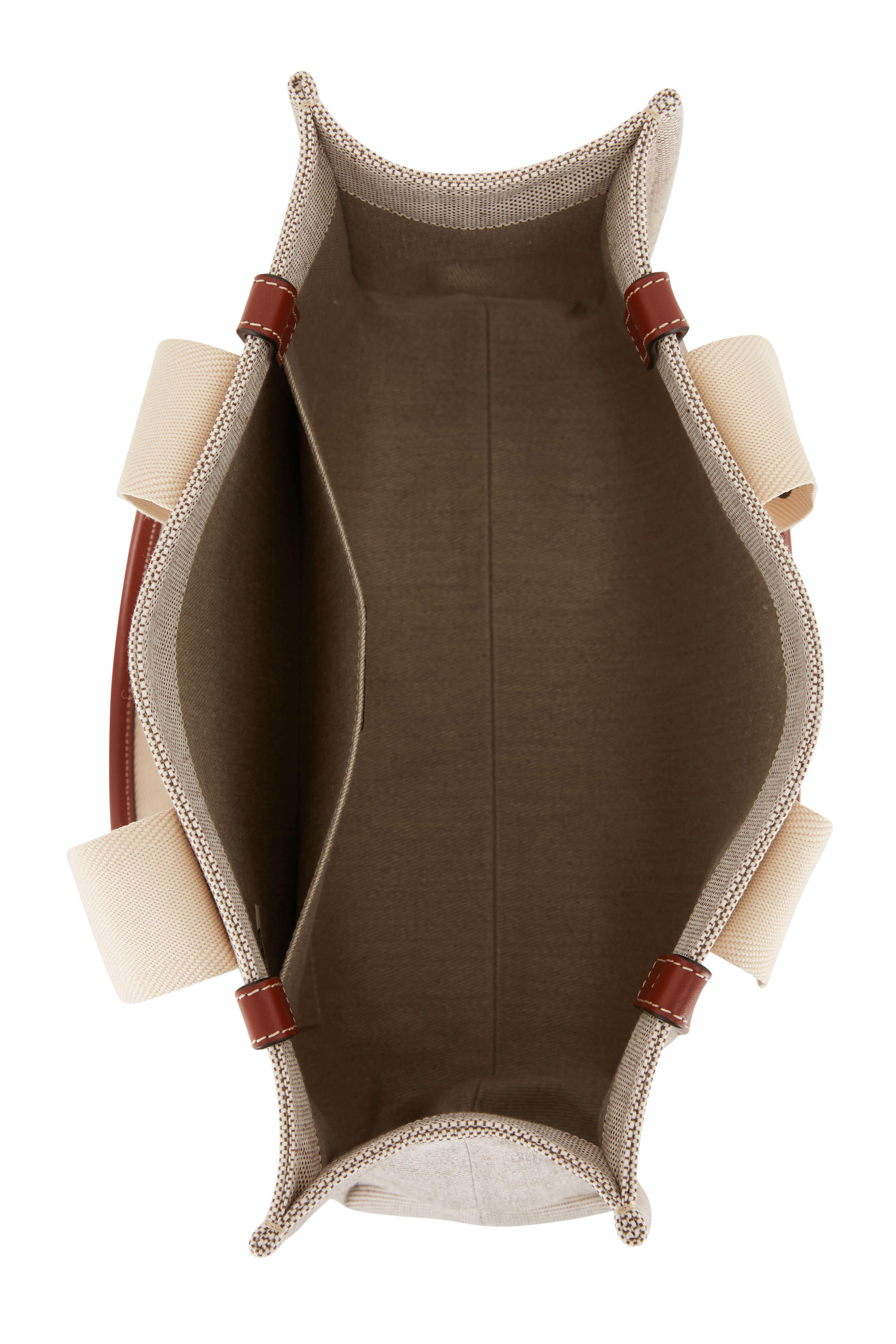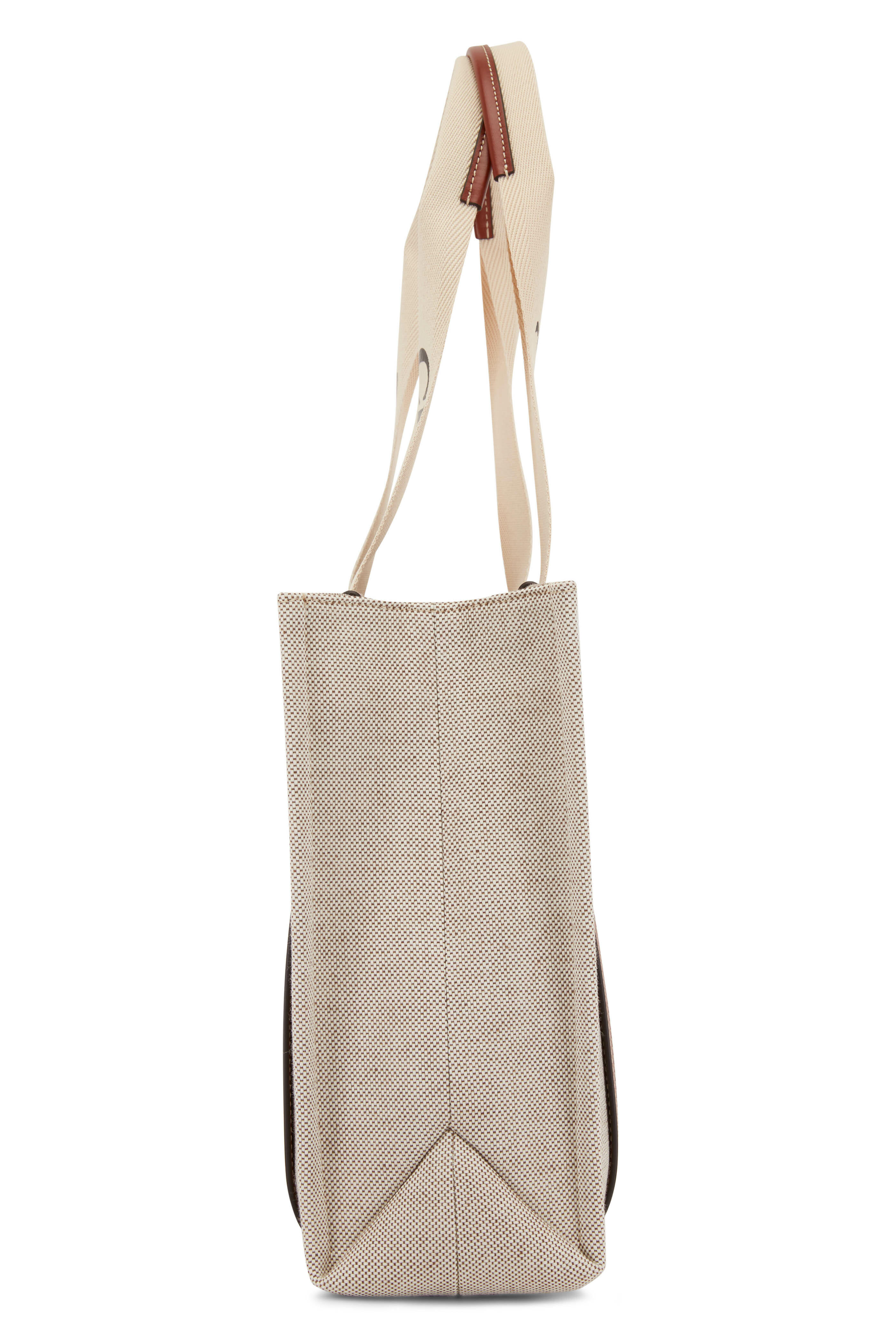 Canvas. Dual woven top handles. Open top. Interior slip pocket. Leather trim details. Textile lining. Made in Italy. 14" width. 11" height. 4½" depth. 10½" strap drop.