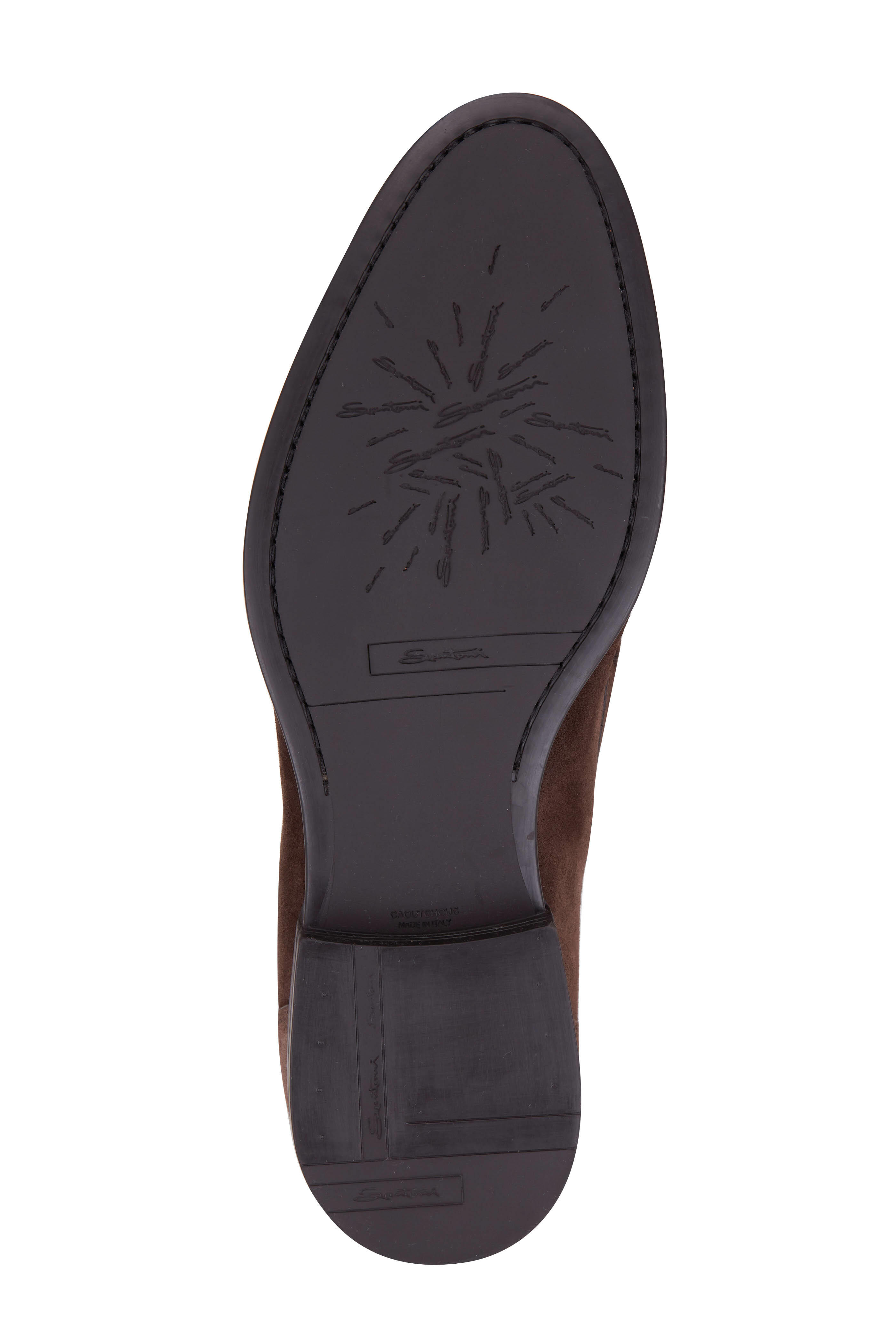 Suede upper. Moc toe. Notched vamp. Stacked heel. Leather lining and insole. Rubber sole. Made in Italy.