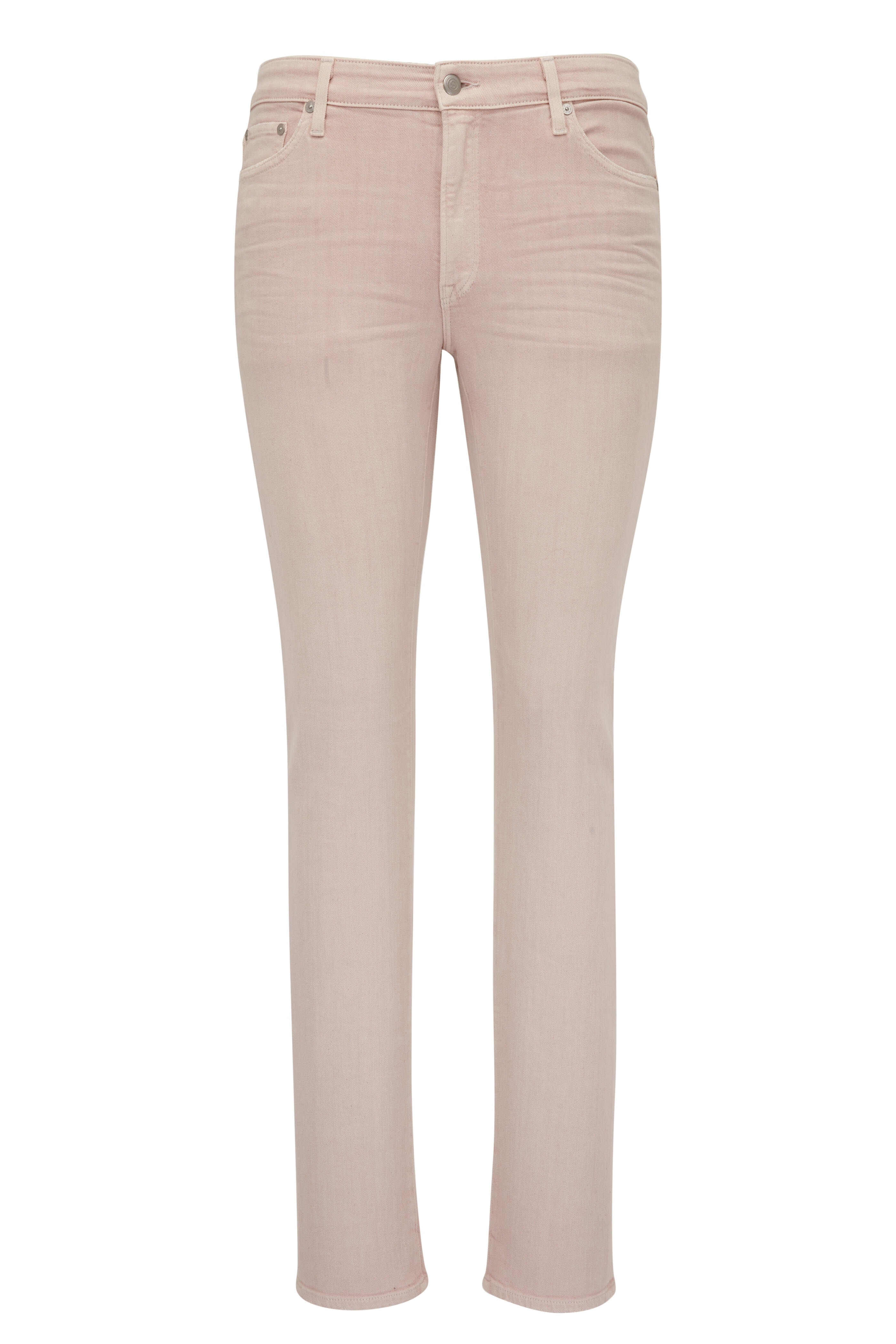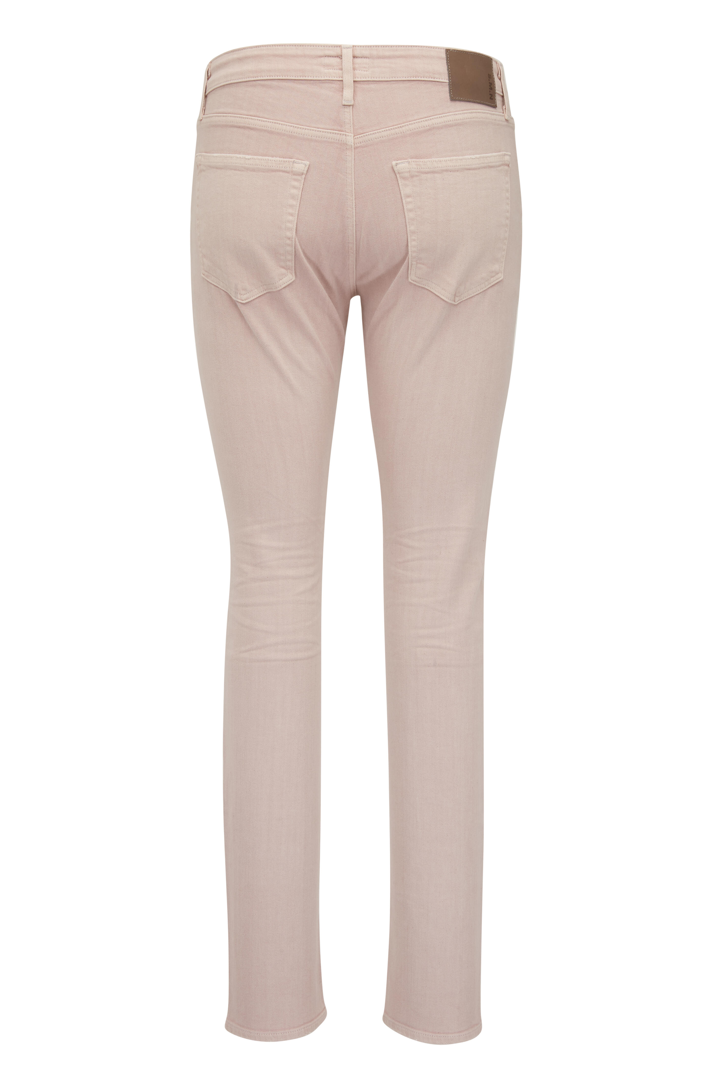 Zip fly. Belt loops. Five pocket styling. Made in the USA. Color: Vintage Blush. Front Rise: 9.75”. Leg Opening: 13.5”. Knee Opening: 16.5". Inseam: 34”. 92% Cotton, 6% Polyester, 2% Polyurethane. Machine wash.