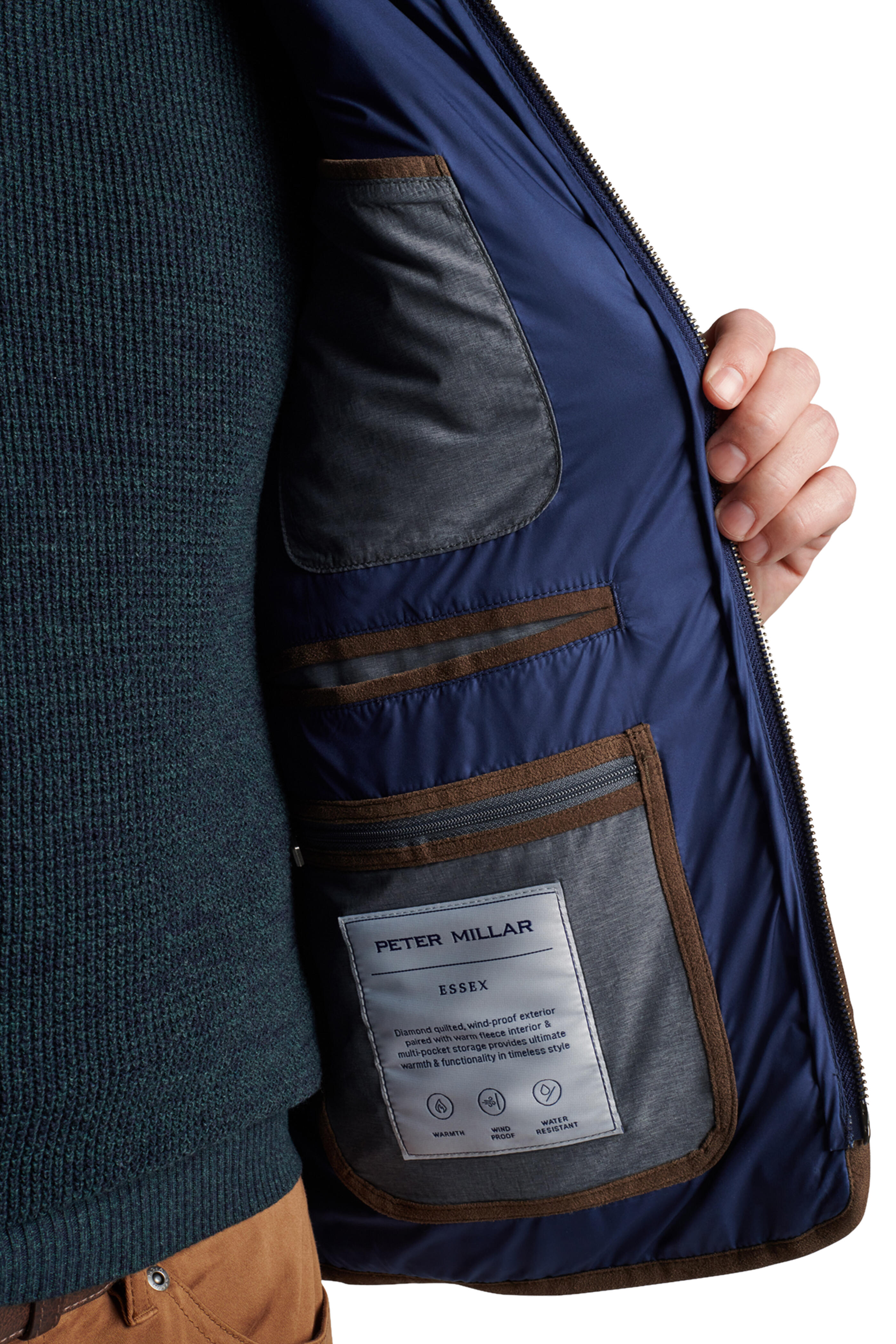 Stand collar. Two way zip placket. Side slip pockets; Interior breast zip pocket; interior breast pouch pocket; two interior zip pouch pockets; two interior slip pockets. Imported. Relaxed fit throughout the sleeve. Relaxed in the shoulder, chest and waist. 100% polyester. Machine wash.
