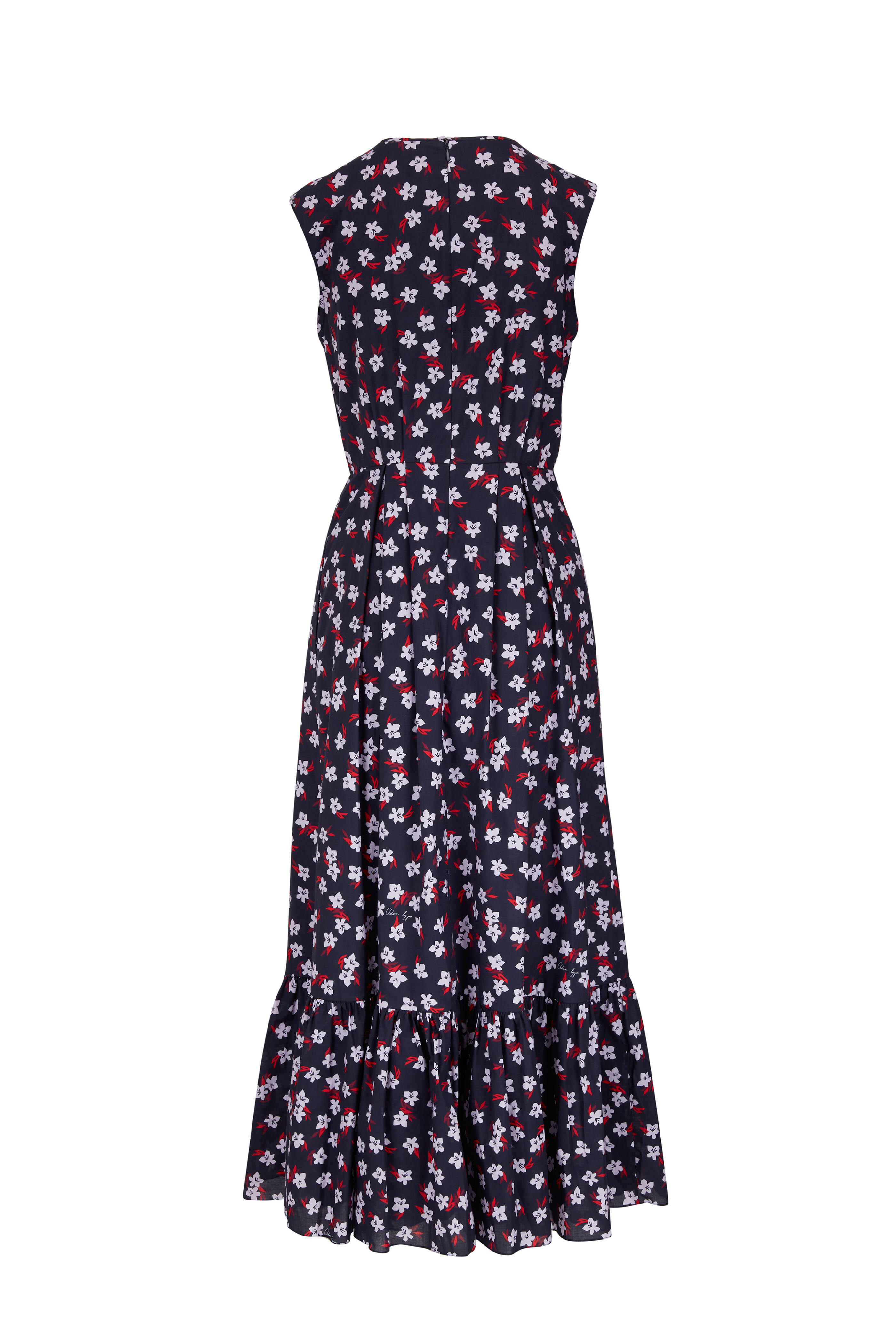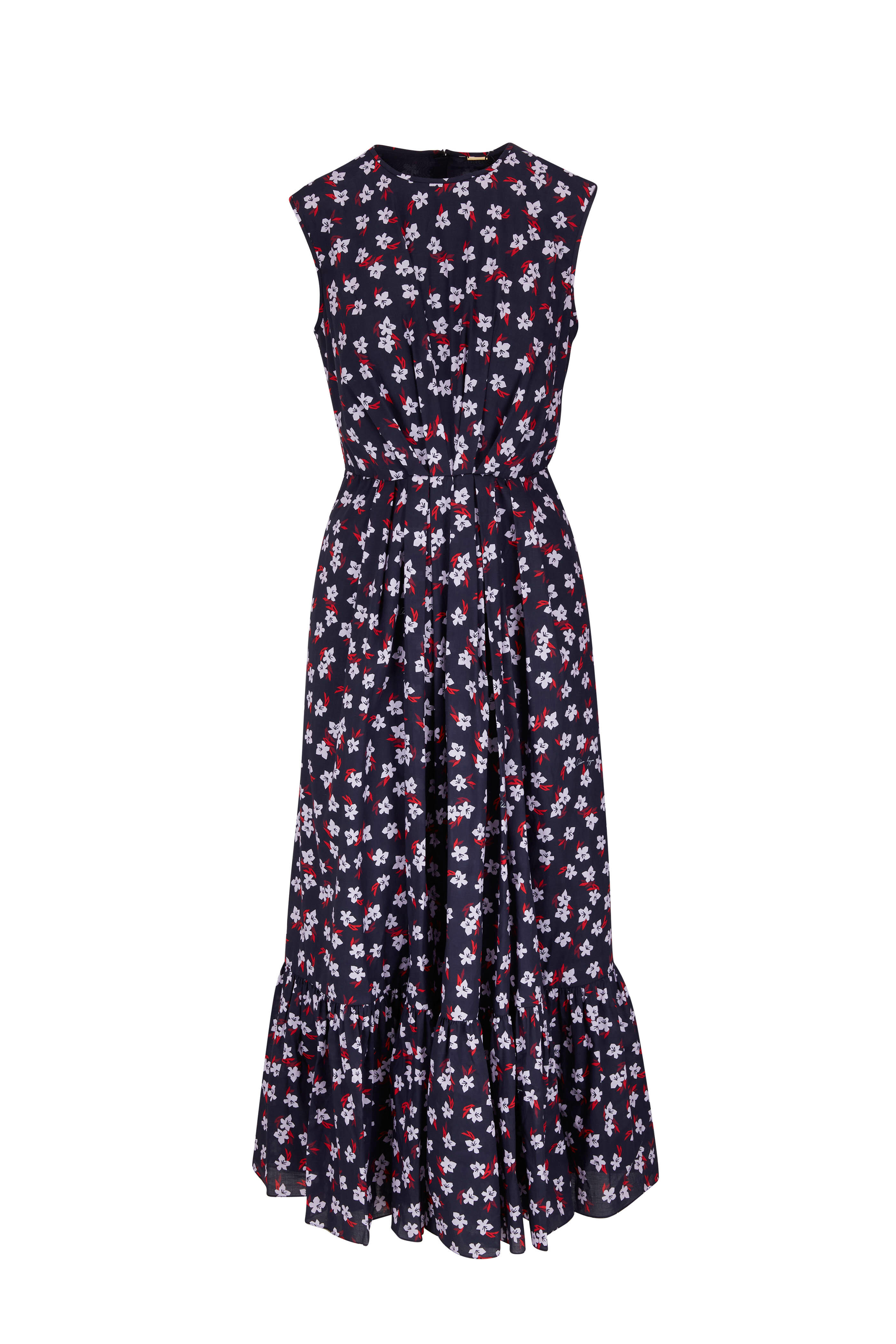 Jewel neckline. Concealed back zip. Concealed side seam pockets. Pleated bodice. Made in the USA. Approx. 54" shoulder to hem. 100% cotton; Lining: 100% silk. Dry clean.