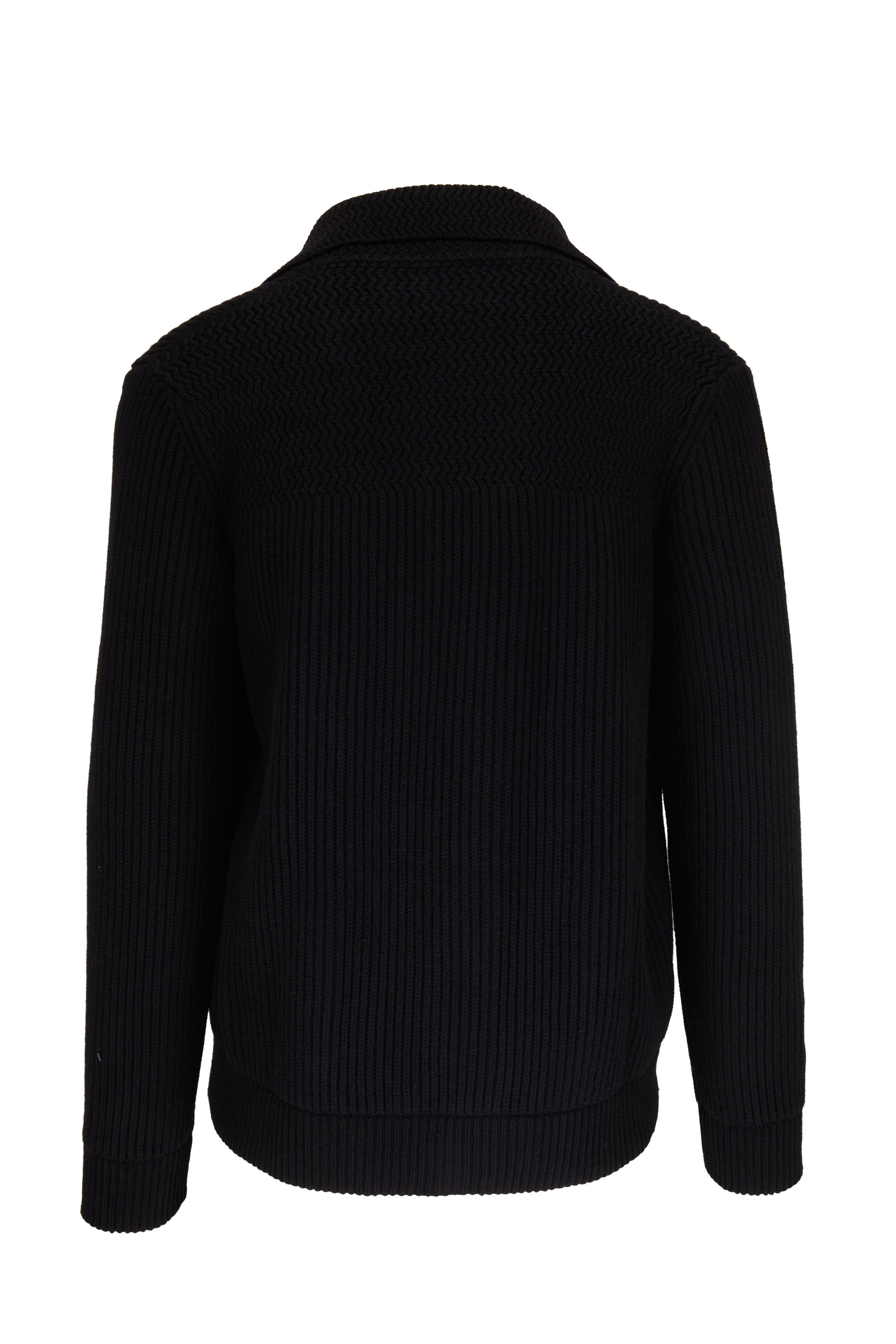 Shawl collar. Front button placket. Lower patch pockets. Ribbed trims. 100% cashmere. Hand wash.