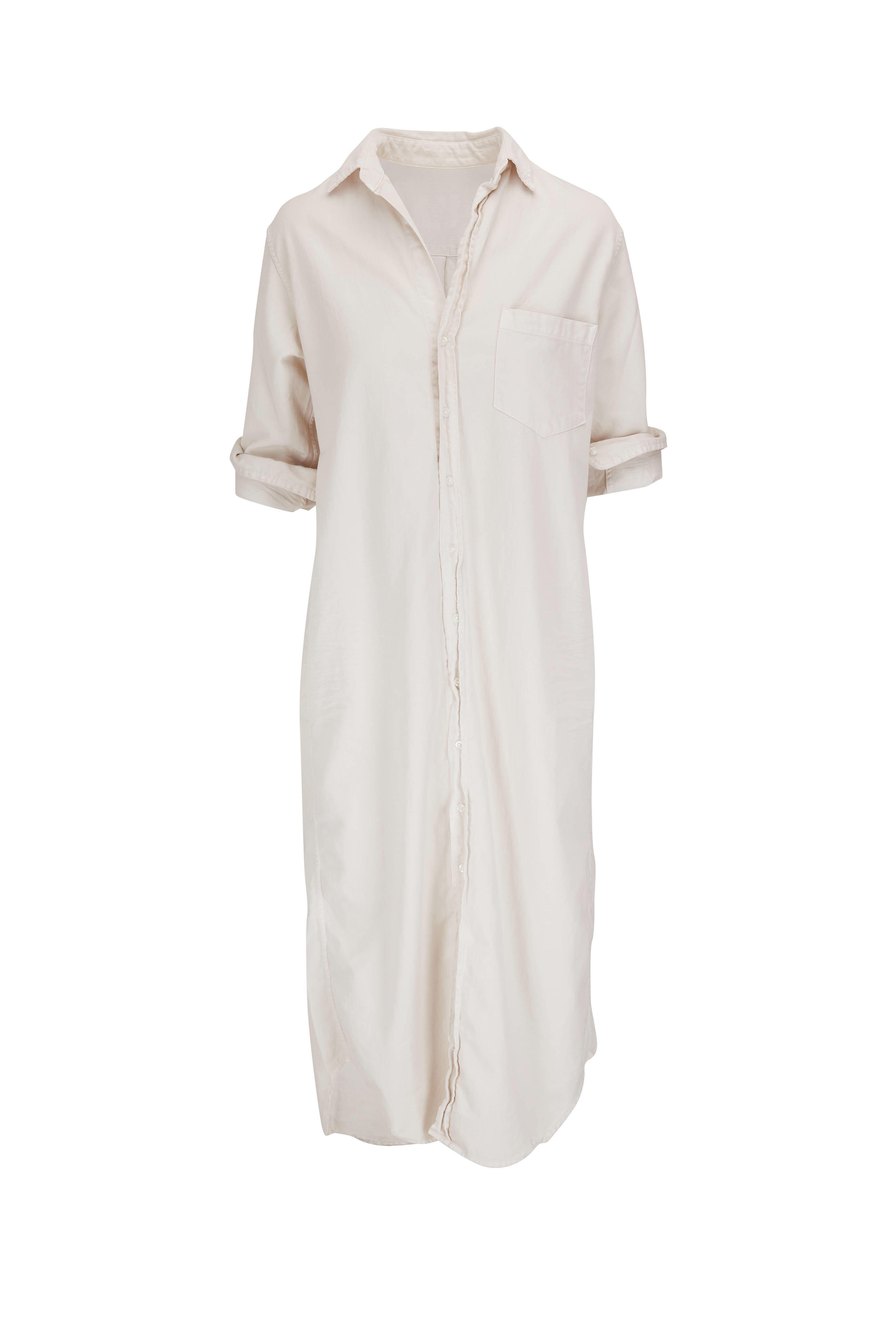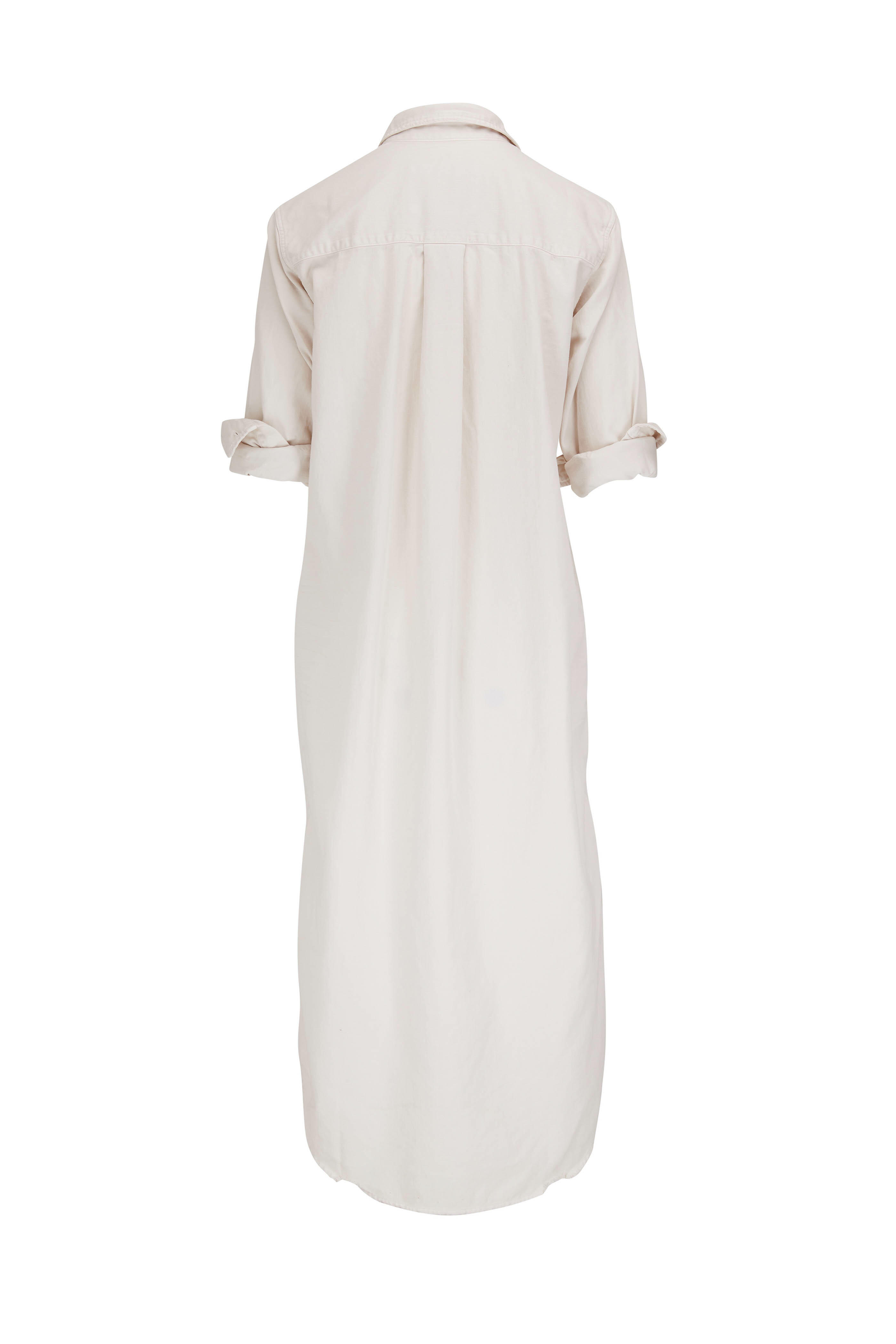 Spread collar. Front button placket. Single button barrel cuffs. Chest patch pocket. Made in USA. Rory is everything we ever wanted in a full-length, button-up dress. A long, lean, and lovely silhouette elongates your torso and feels extra-airy, while Rory's statement chest pocket and easy-to-roll sleeves exude breezy California chic.. Full-length button-up dress with a fairly relaxed fit. 100% cotton. Machine wash.