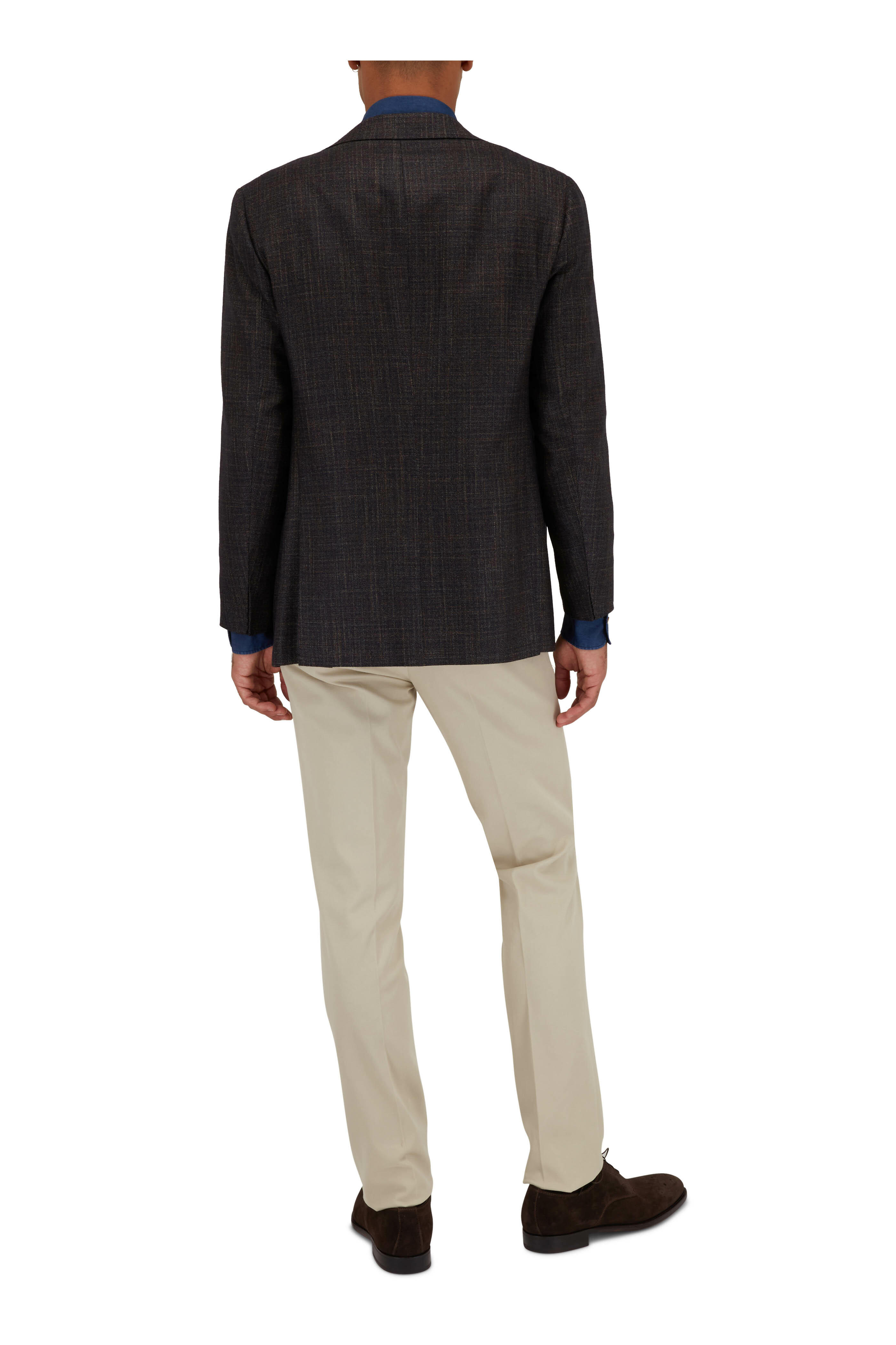 Zip fly with double button tab. Belt loops. Front slash pockets; back welt pockets. Unfinished hem. Imported. 90% cotton, 8% cashmere, 2% elastane. Dry clean.