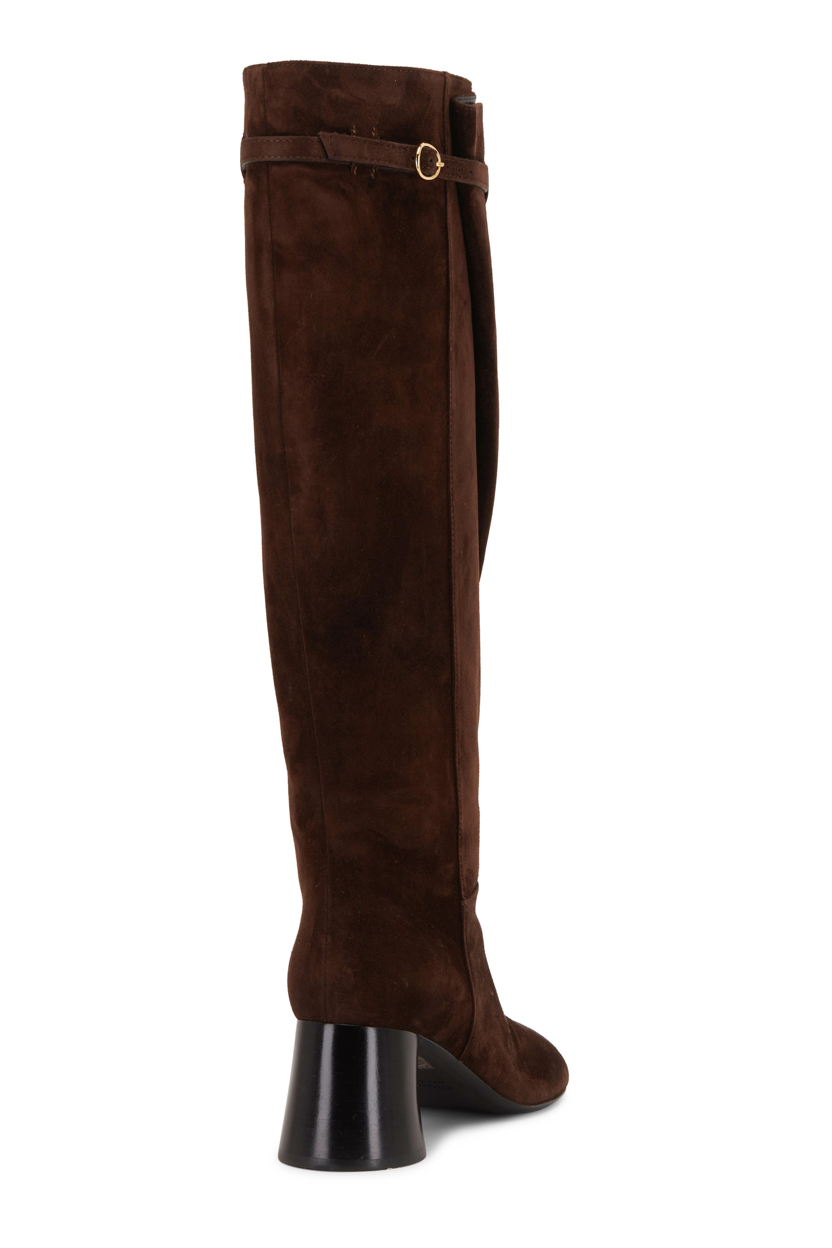 Calfskin suede. Round toe. Adjustable belt strap. Leather lining and insole. Block heel. Rubber sole. Made in Italy. True to size. Heel measurement: 45 mm (approx. 2").