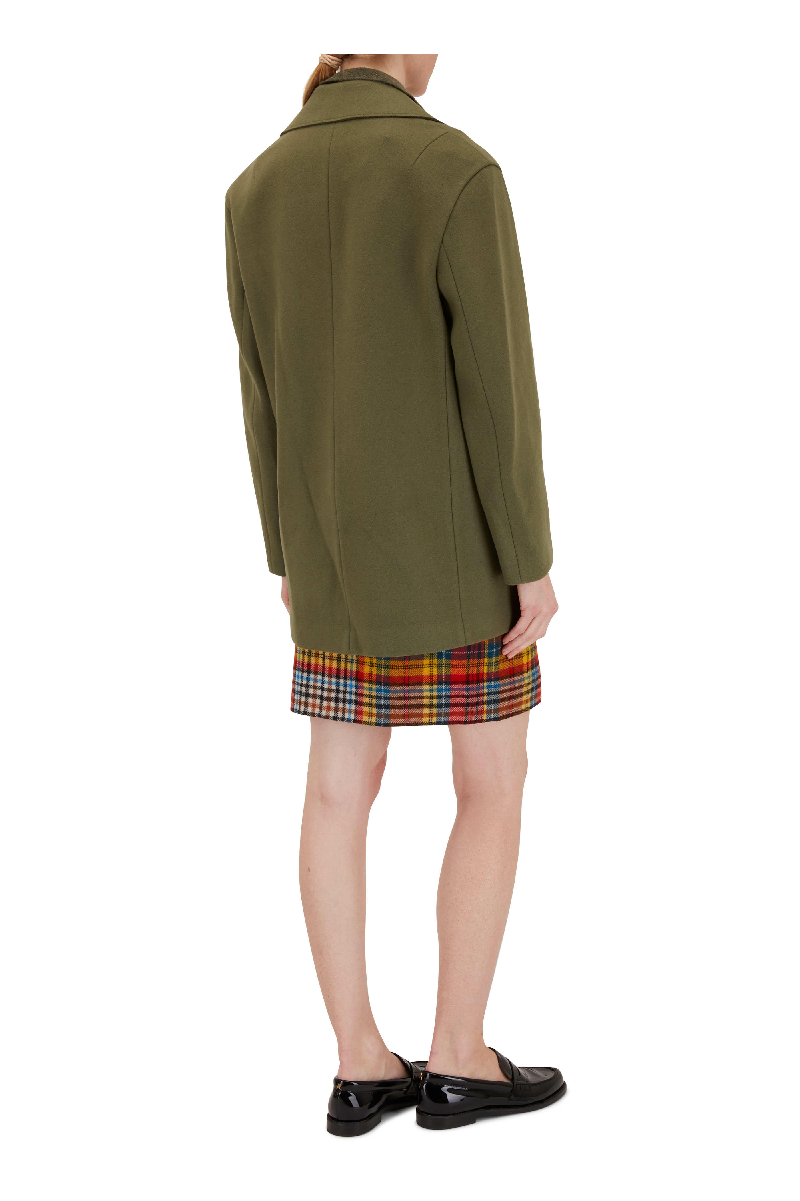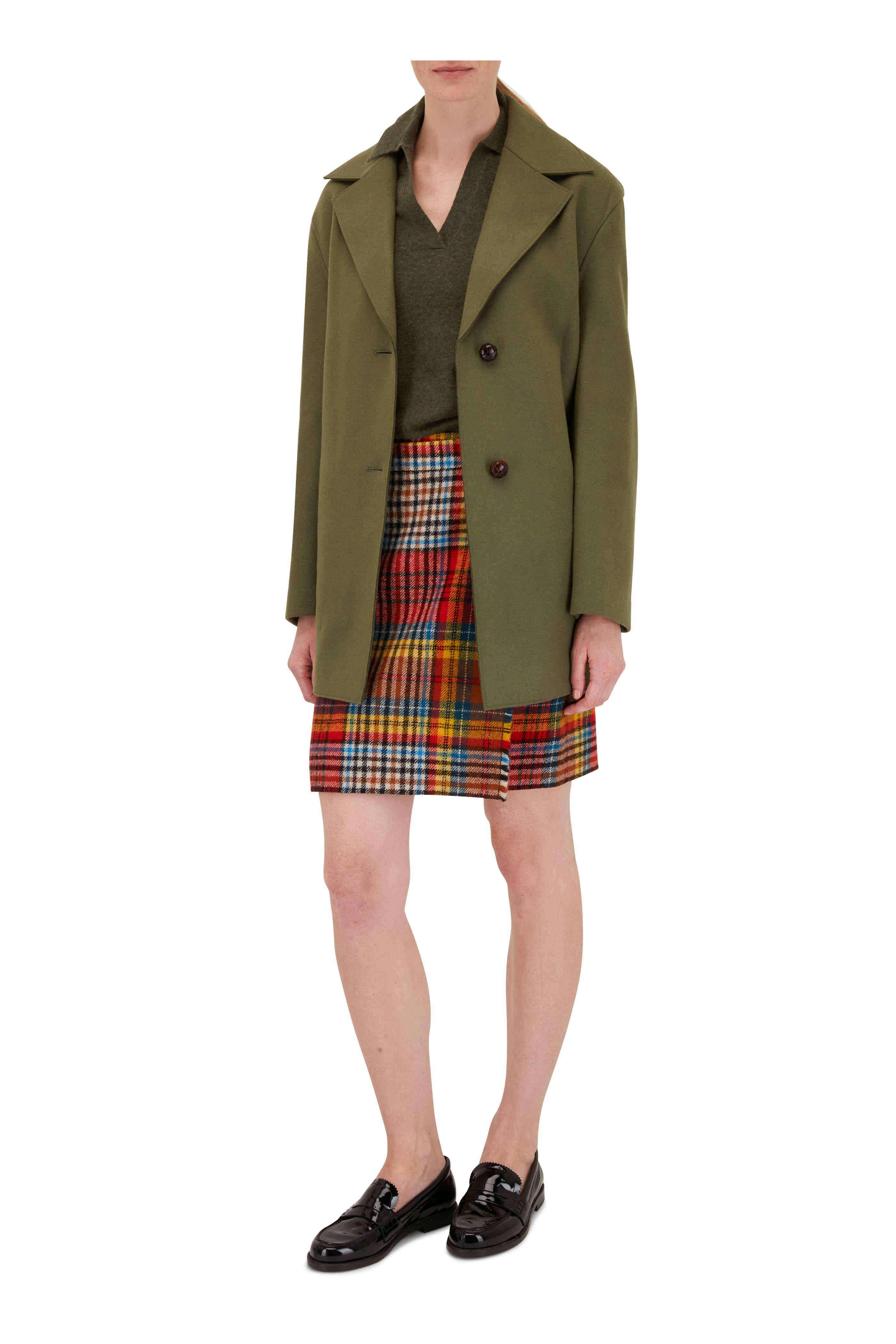Wrap style; adjustable button closure. Front slip pockets. Imported. 18" length. 100% virgin wool. Dry clean.