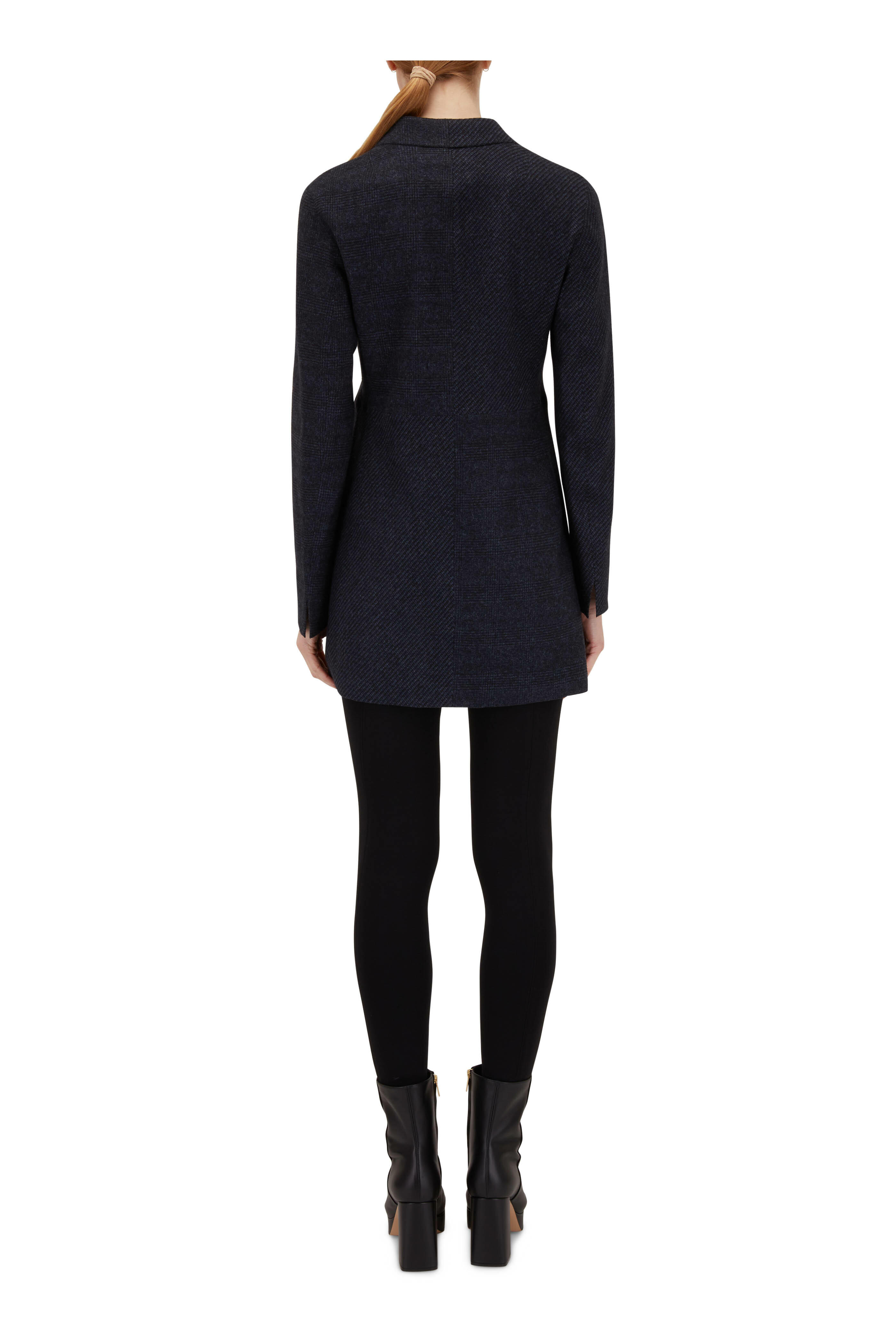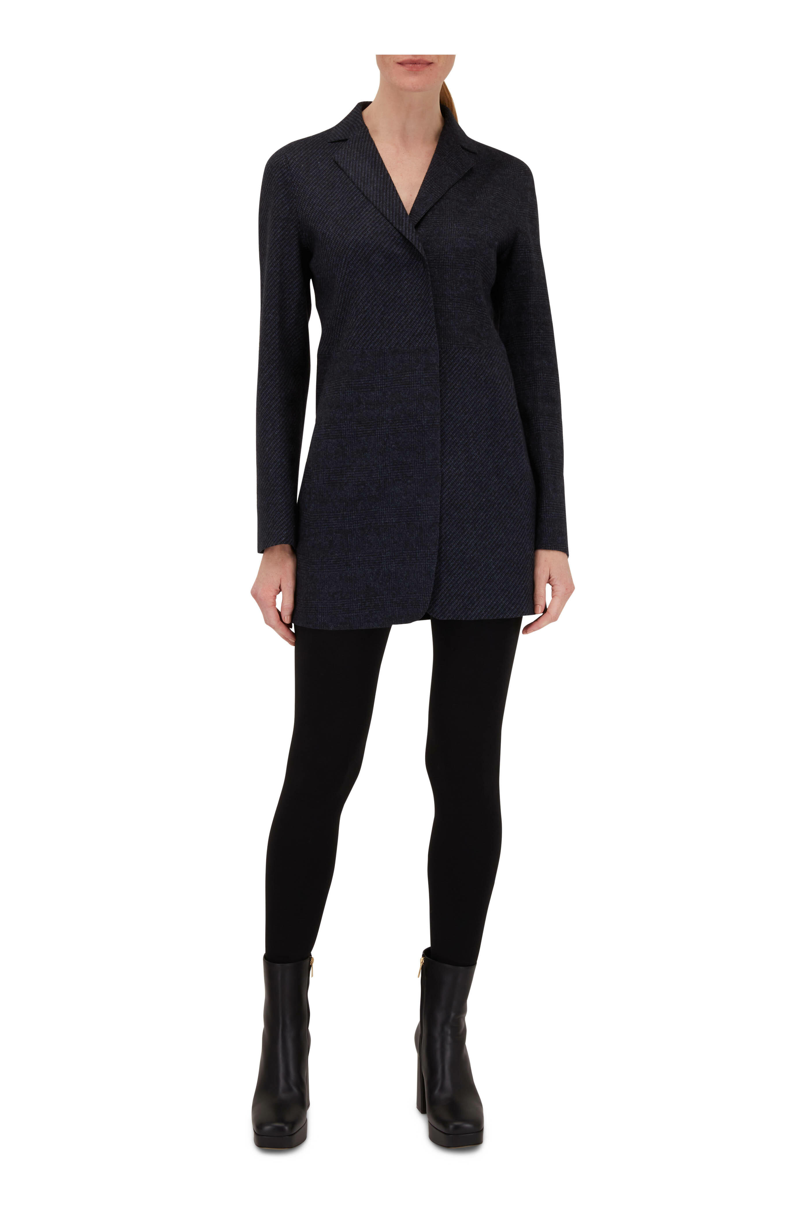 Notched lapels. Concealed snap button placket. Lower waist slash pockets. Split cuffs. Fabric from Italy. 53% polyester, 45% viscose, 2% elastane. Dry clean.