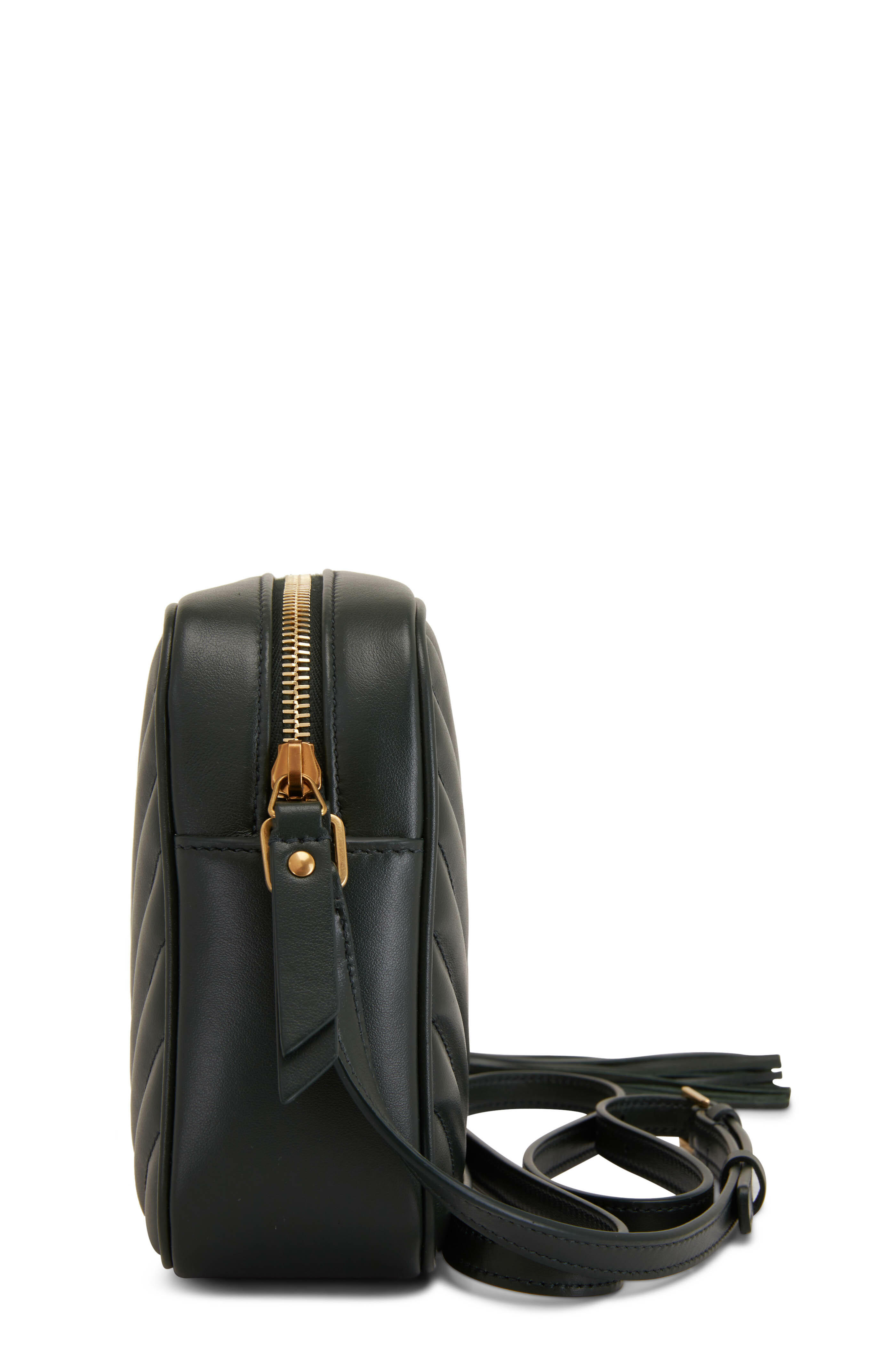 Y-Quilted leather. Top zip. Adjustable leather shoulder strap. Interior slip pocket. Textile lining. Metal logo detail. Made in Italy. 9" width. 6" height. 2.25" depth. 23" strap drop.