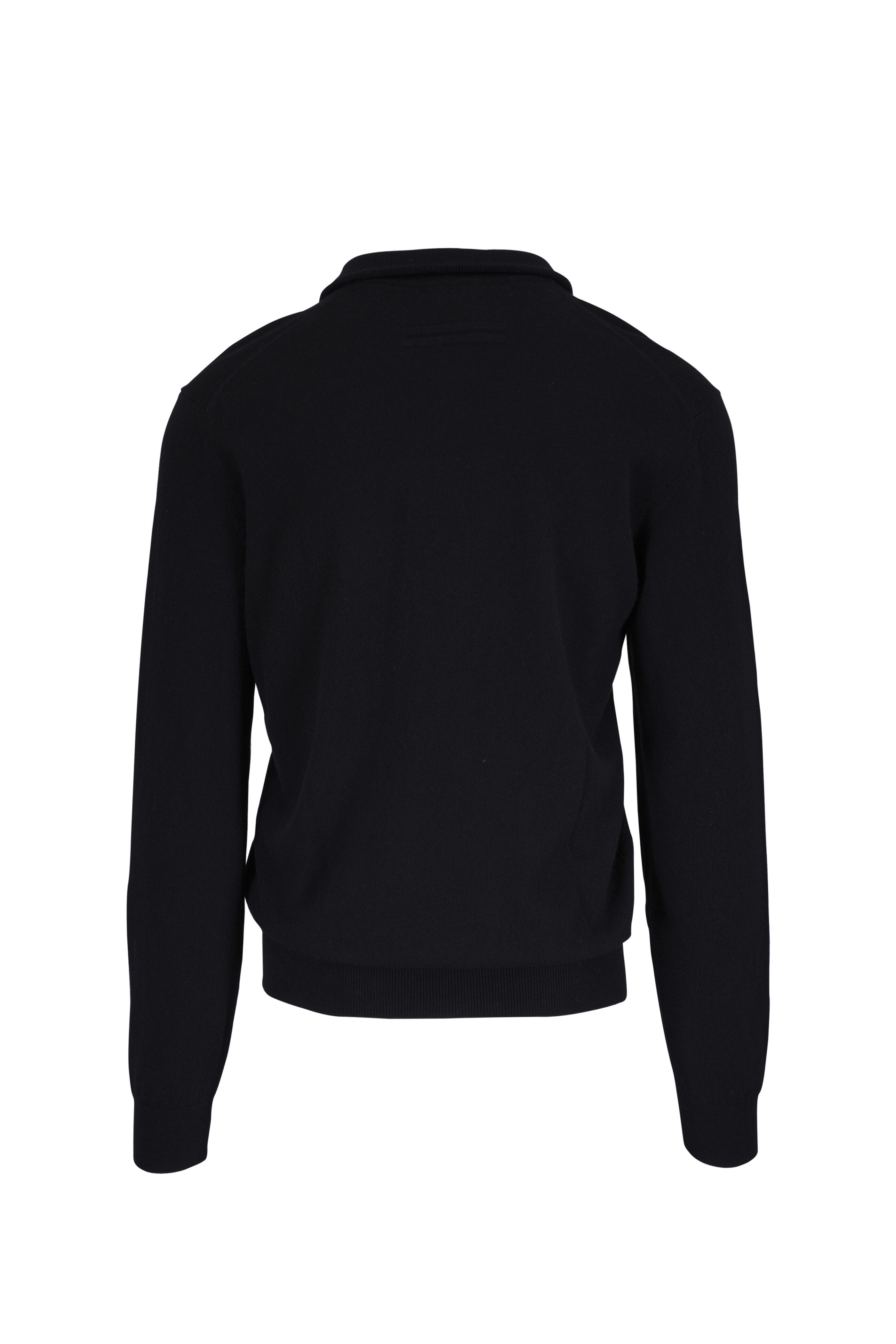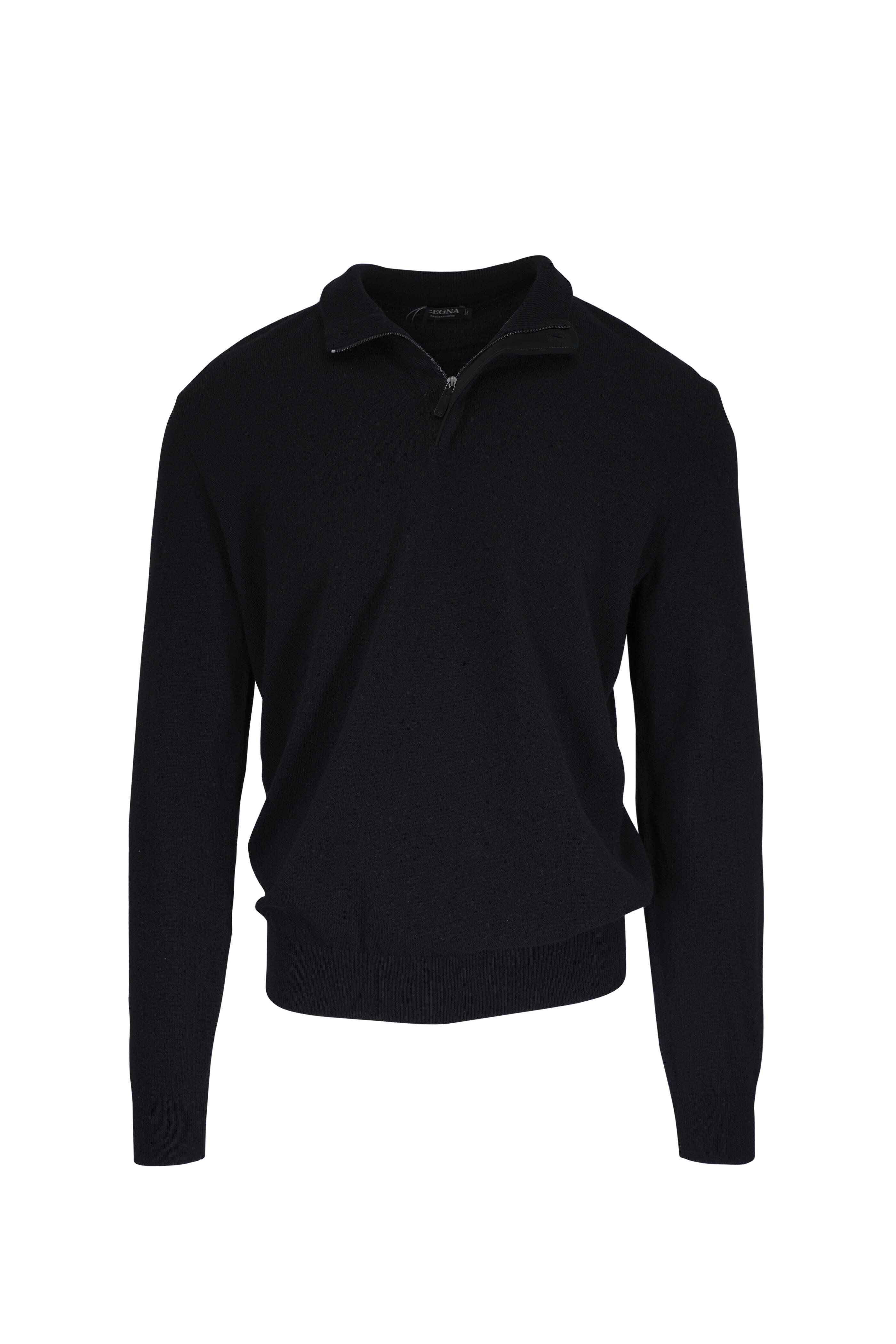 Mock neckline. Quarter zip placket; single top button. Ribbed trims. Made in Italy. Regular fit. 100% cashmere. Dry clean.