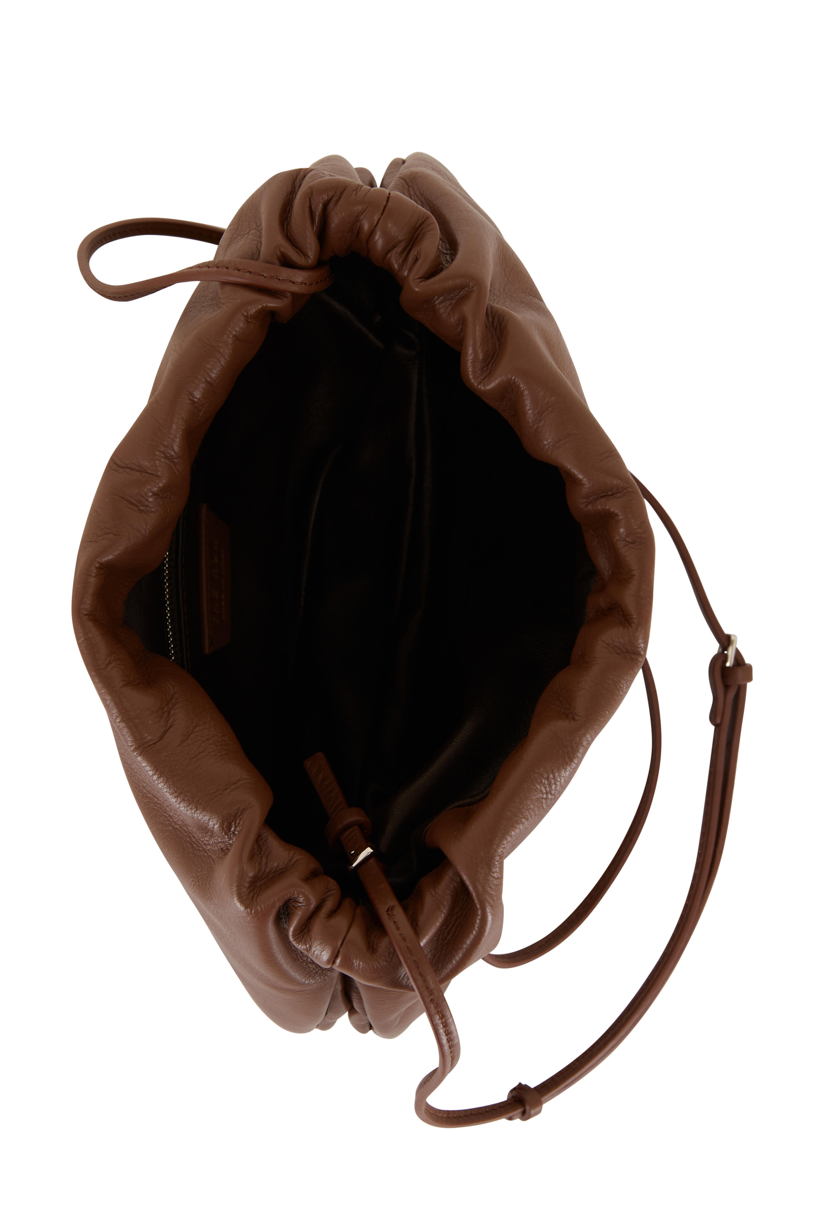 Leather. Framed, magnetic top. Adjustable and removable strap. Interior zip pocket. Made in Italy. 6" height. 10" width. 1" depth.