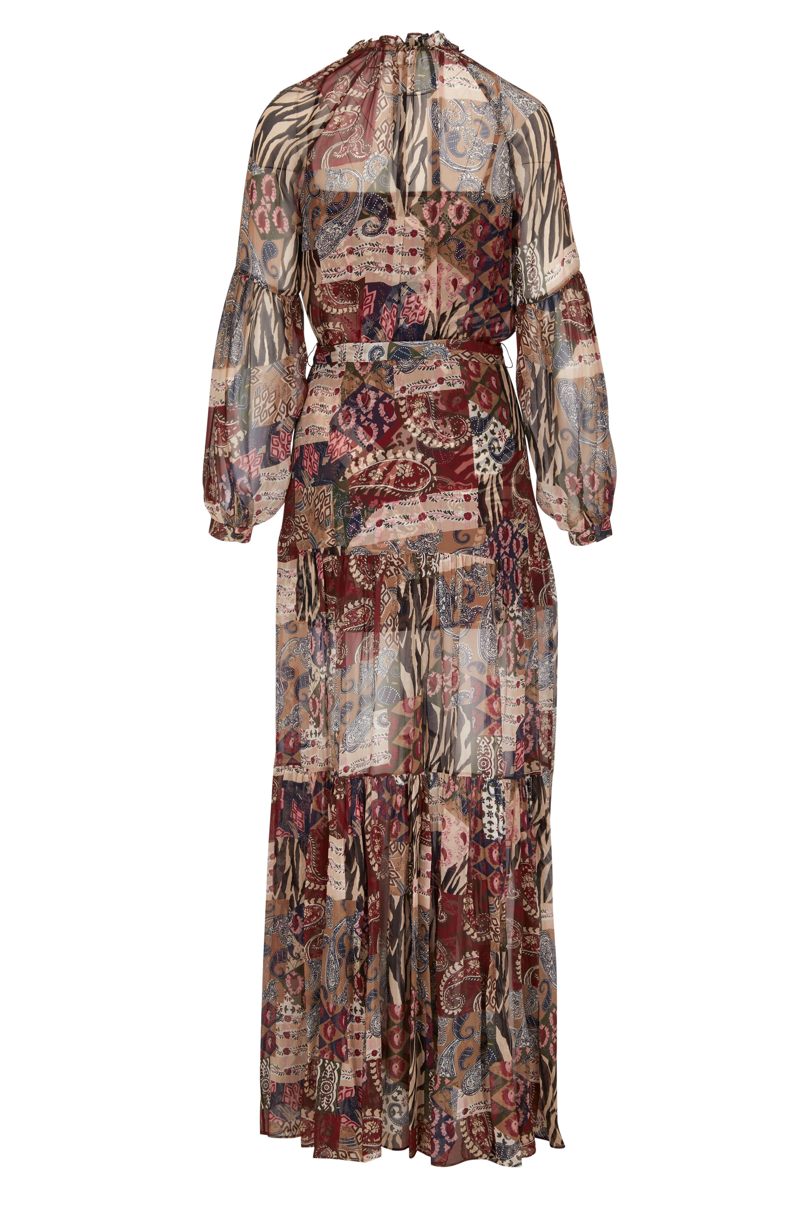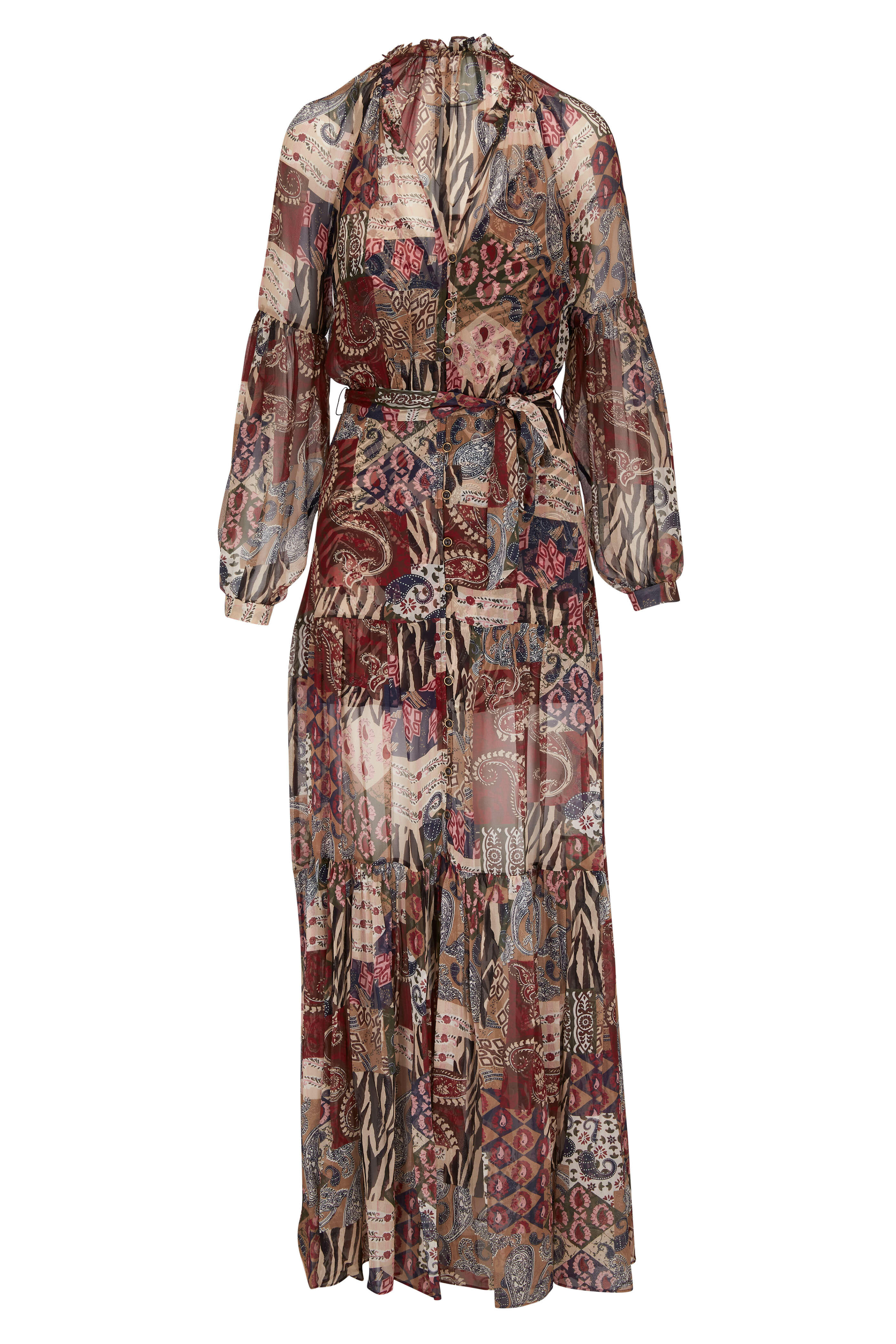 Ruffled v-neckline. Removable self-tie belt. Front button closure. Balloon sleeves. Tiered hem. Imported. Length: 62 1/2". 100% silk. Dry clean.